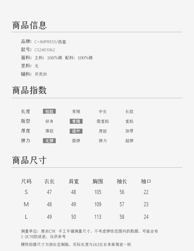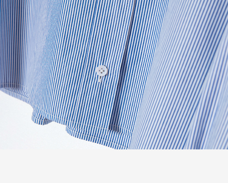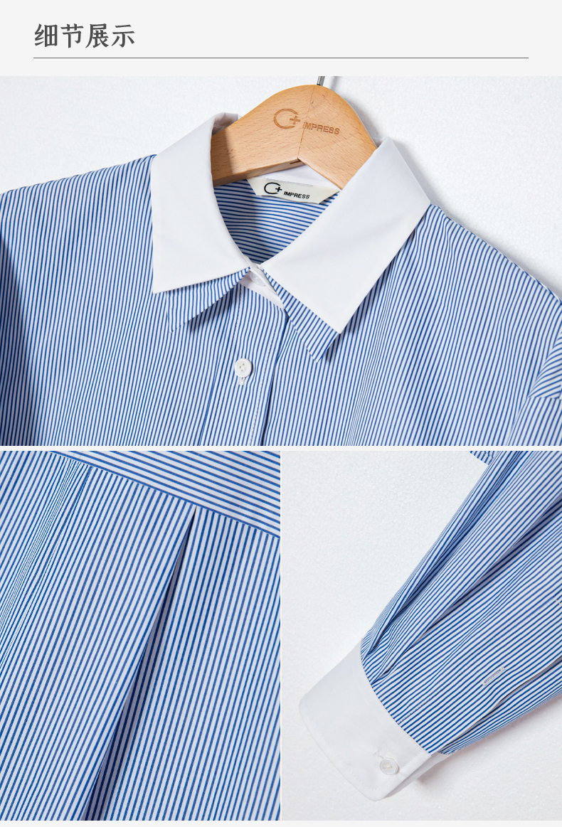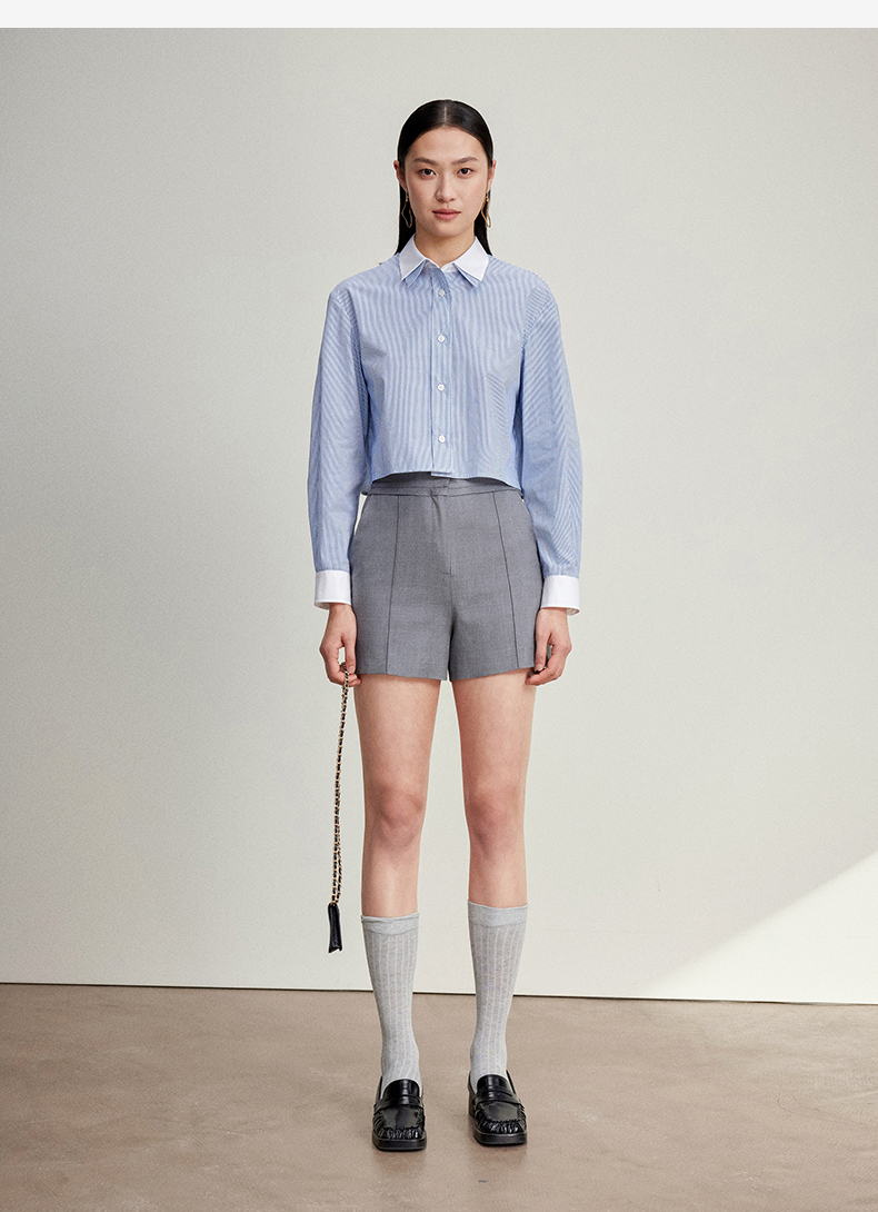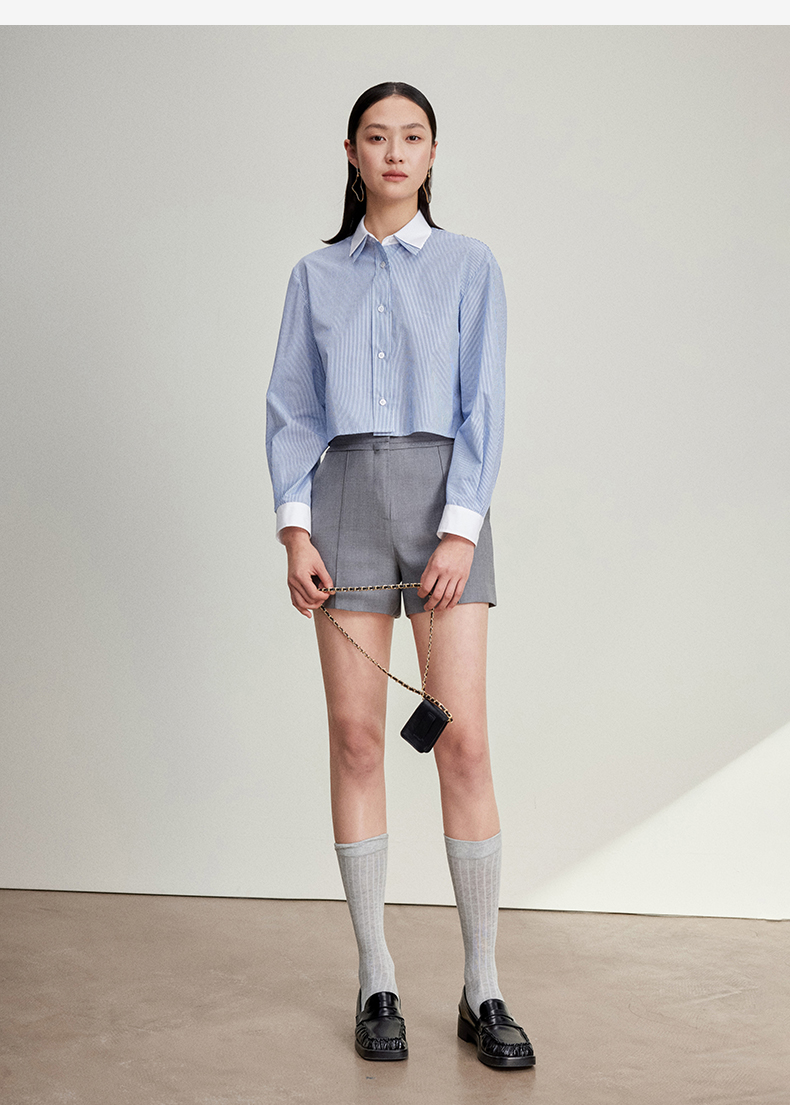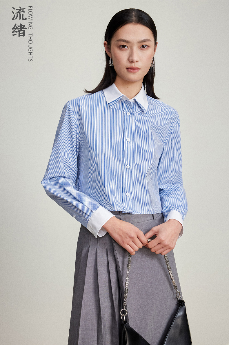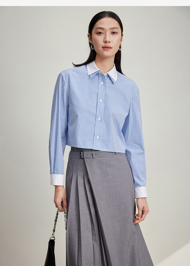 西嘉C+IMPRESS/西嘉MIU风短款蓝白条纹衬衫女进口棉撞色设计感小上衣CS2401062