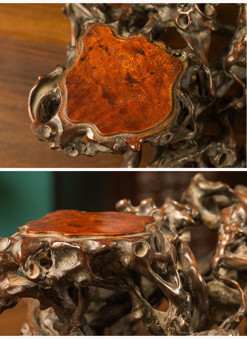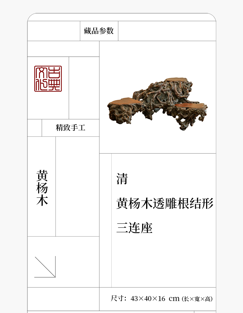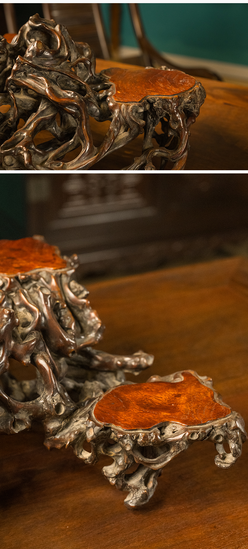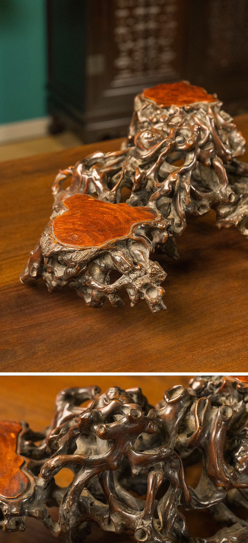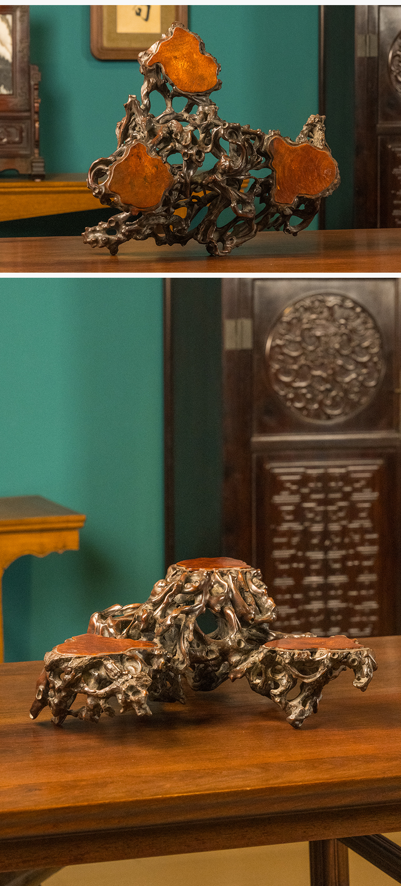 清 黄杨木透雕根结形三连座