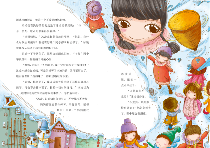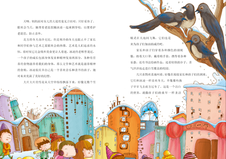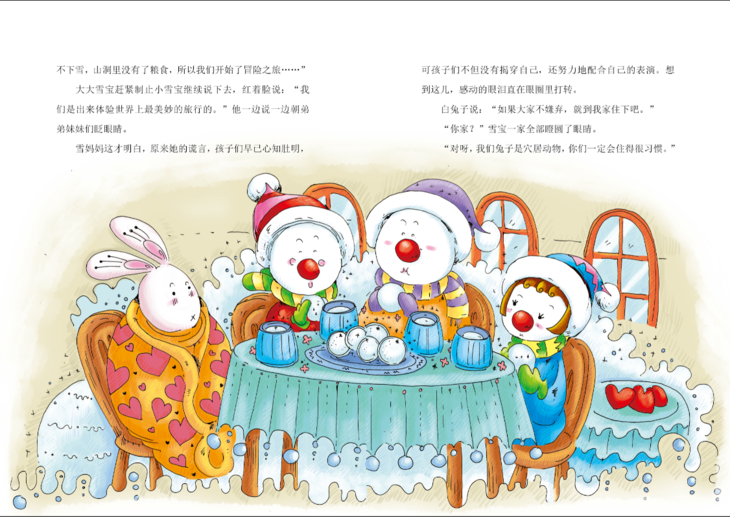 这是一个雪的世界。这里有漫天飘舞的雪,铺天盖地的雪景,挂满冰柱的冰雪城堡,雪世界里的雪精灵……读完这部作品,孩子将自然而然产生对雪的亲近感;这是一个欢乐的世界。天上飞舞的雪娃娃,来到雪国的雪宝,路上偶遇的小女孩,和雪宝开心玩耍的森林小伙伴……读完这部作品,孩子将会感染这种冰天雪地中带来的快乐情绪;这是一个充满想象的世界。想象出的雪娃娃,想象出的冰雪城堡,想象出的冰雪地下宫殿,……从这部作品开始,所有的孩子将对冰雪世界有了不一样的认识。