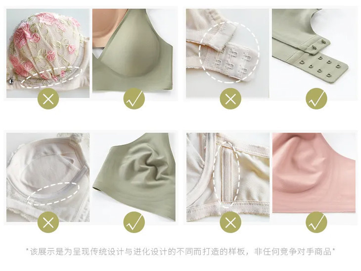 毕竟传统钢圈内衣一般都是有聚拢、胸垫加持,不仅穿得难受,一天下来还会在身上留下几道“光荣”的勒痕。