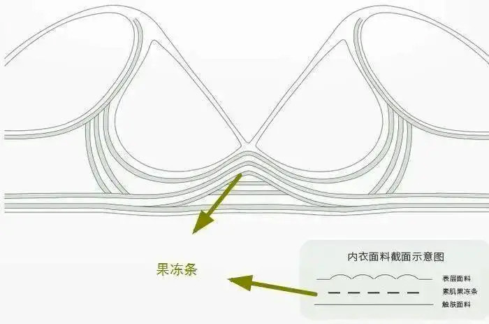 果冻胶是一种半液态的胶体,手感柔软,做成条状、让内衣弹性和延展性非常好。