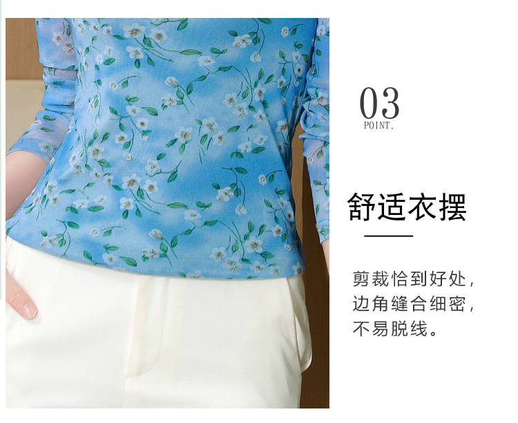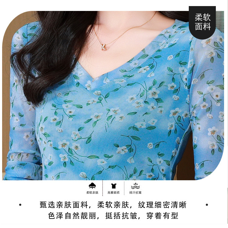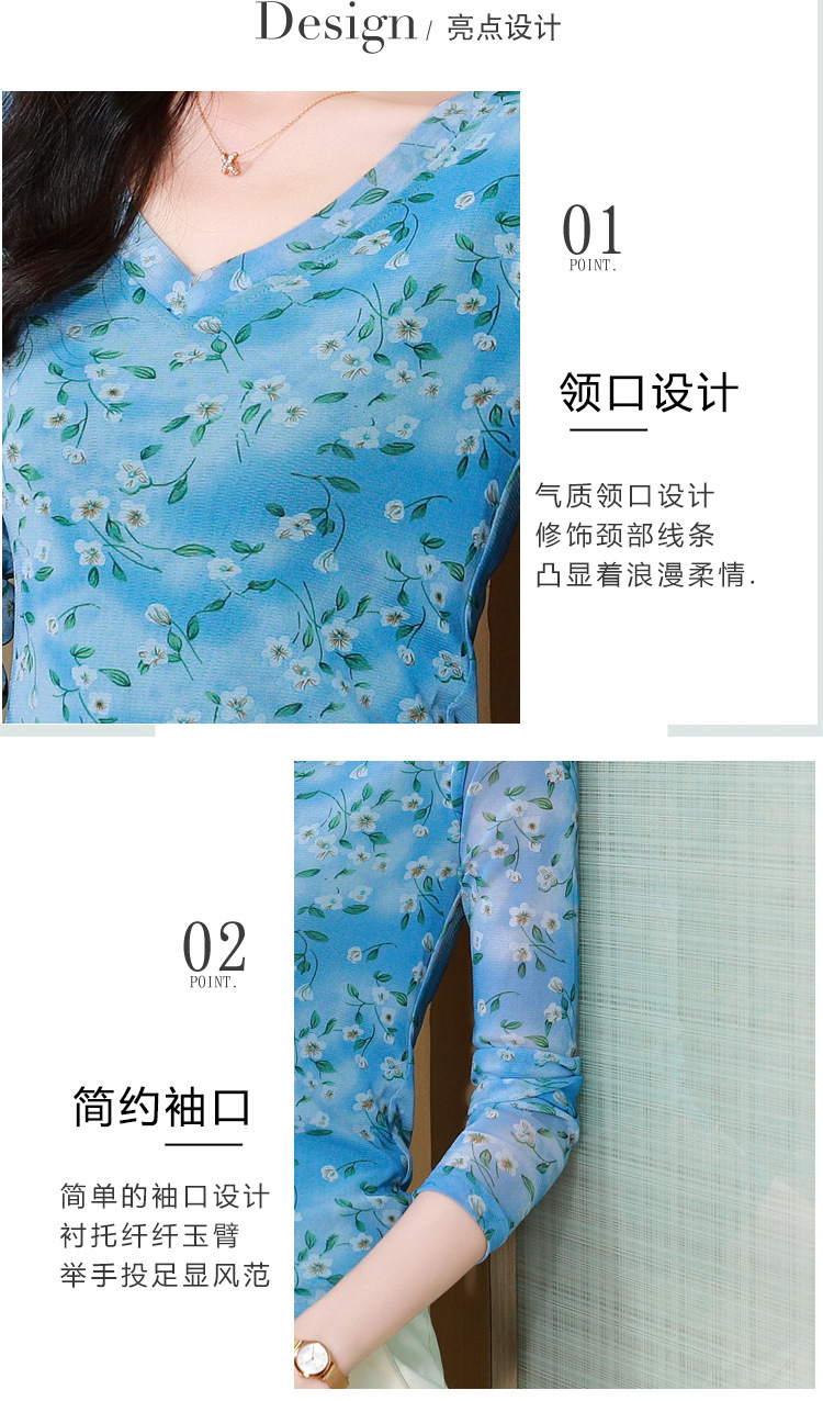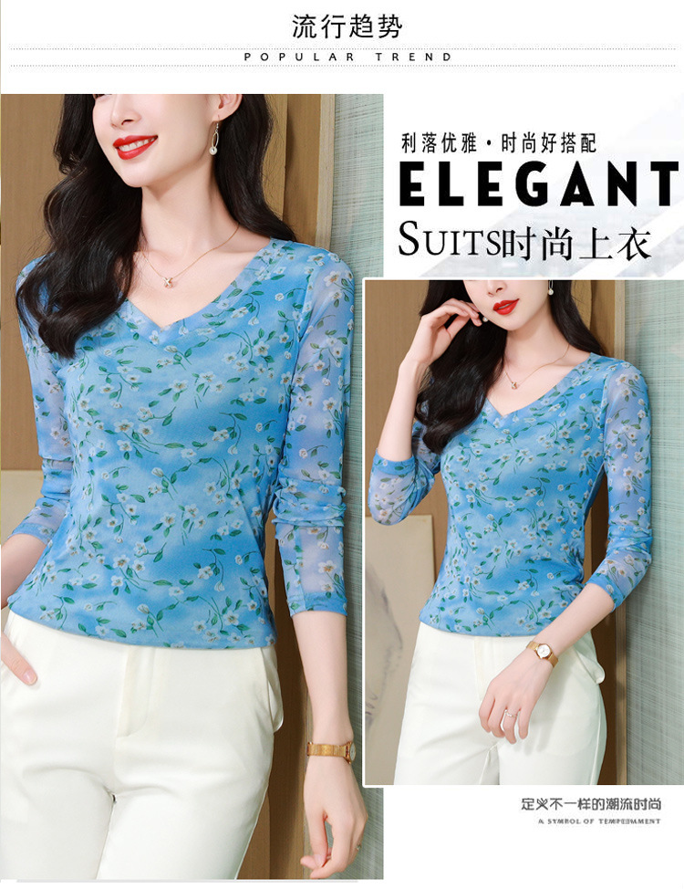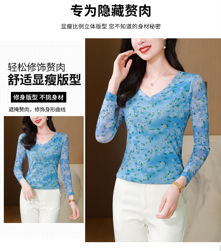 KQL 520N89391时尚纱网印花长袖V领修身显瘦洋气打底衫