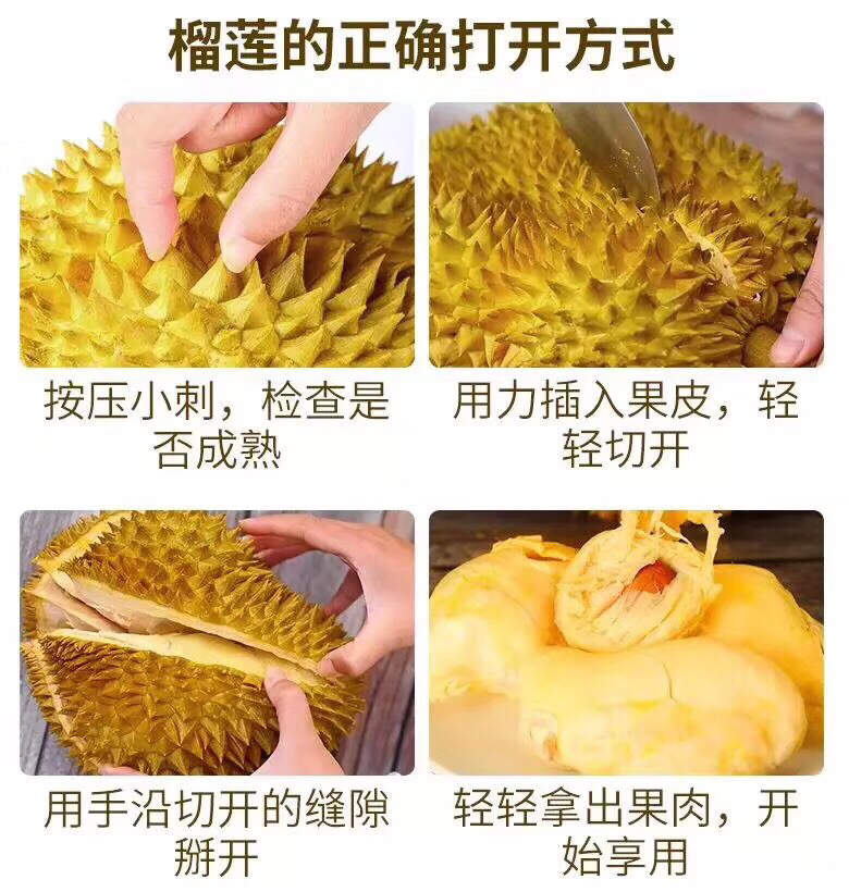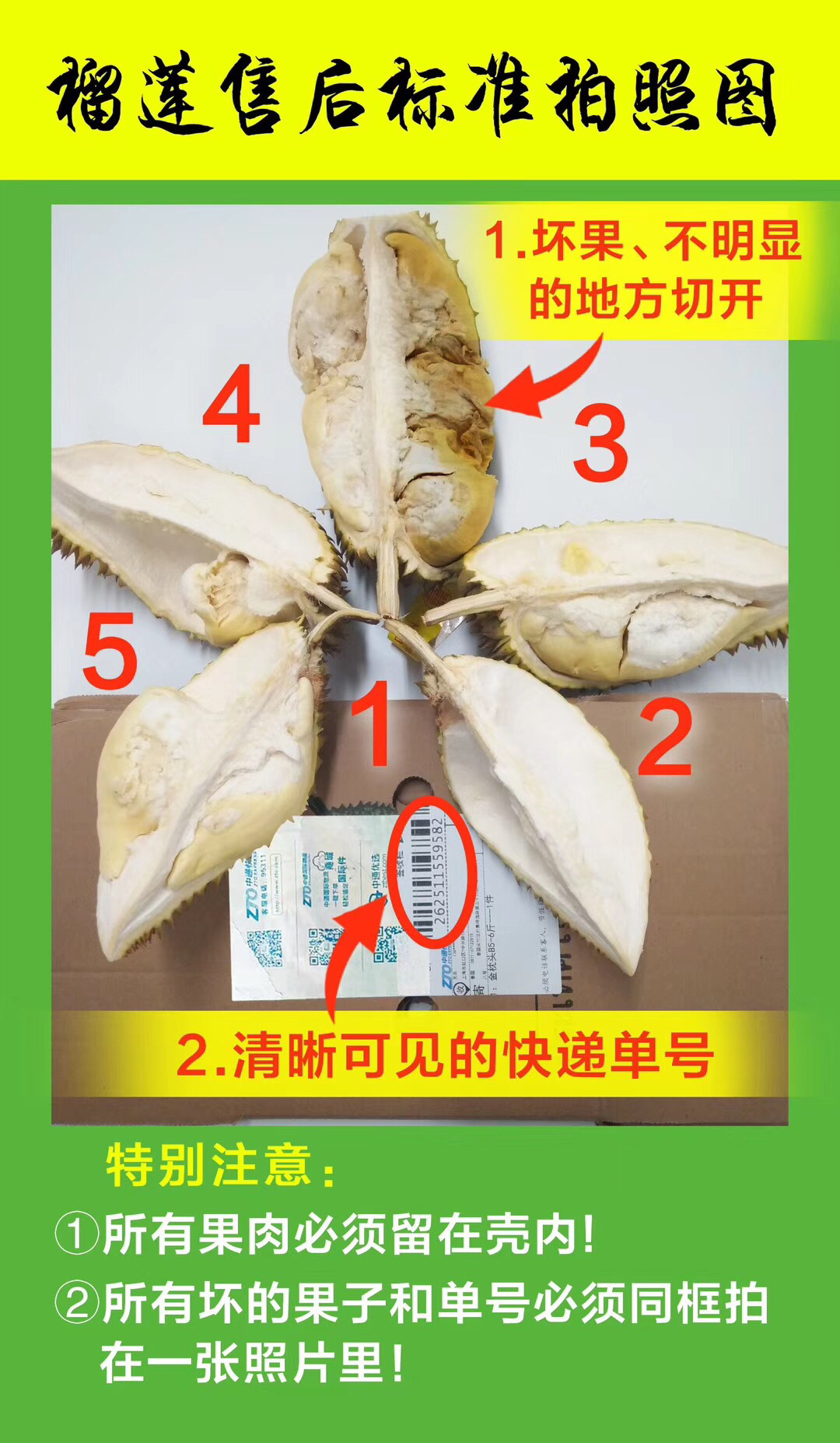 1⃣️榴莲是多苞水果,从坏果、不明显的地方切开⚠️所有果肉必须留在壳内,照片中没有果肉不理赔⚡️