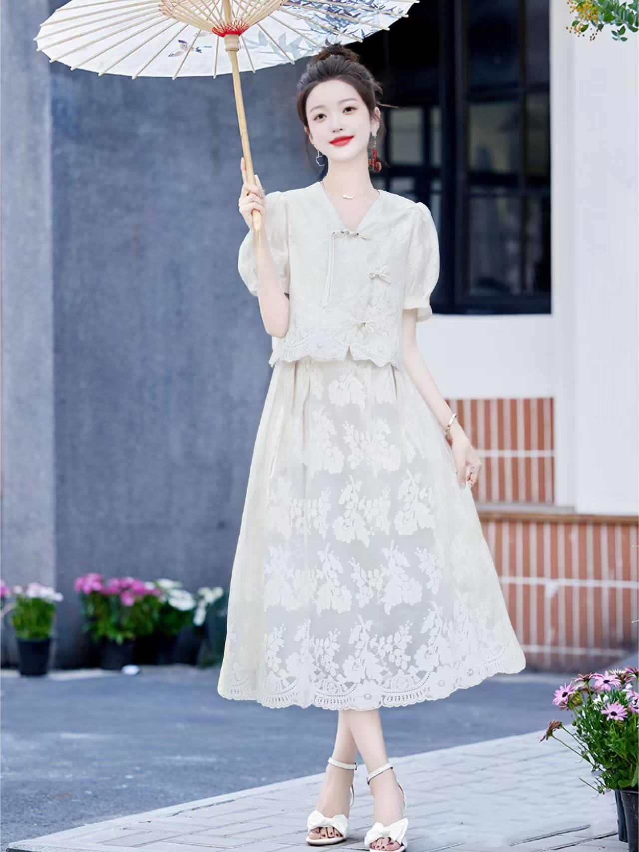【限八一促】福利推荐~整套绣花{ 连衣裙系列 }2053新中式V 领盘扣上衣➕半裙套装-喜出