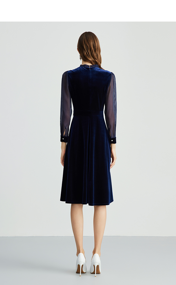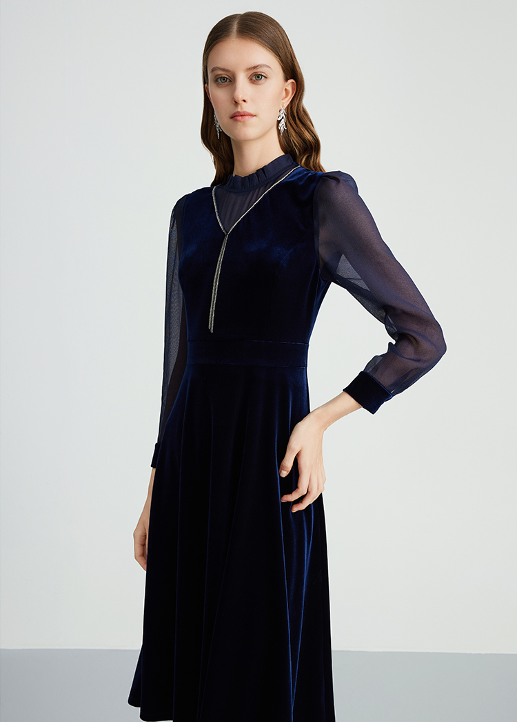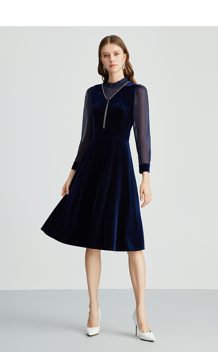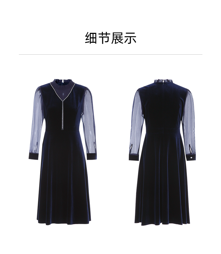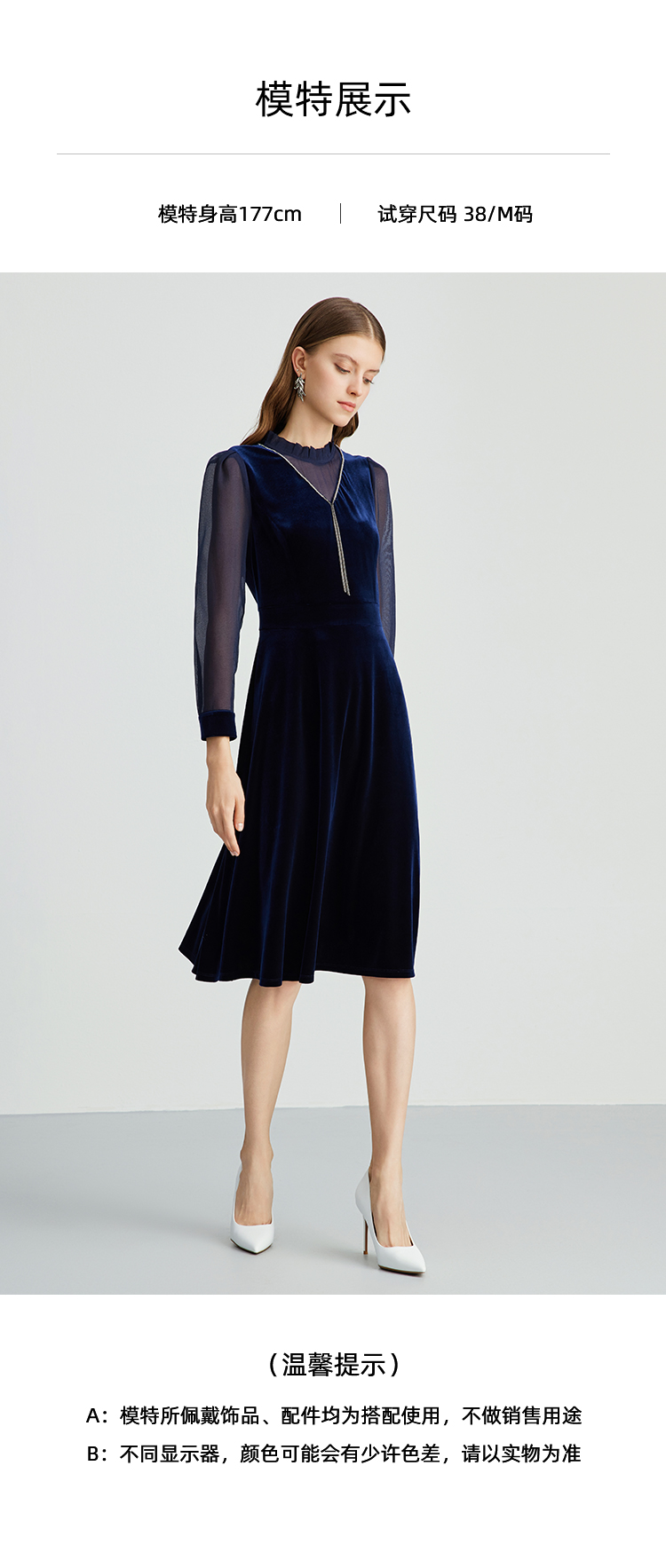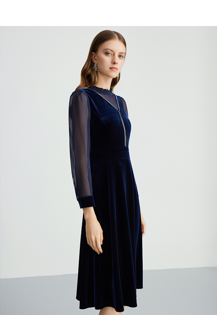 EITIE爱特爱气质优雅网纱拼接丝绒深蓝色收腰连衣裙秋季新款C2407422