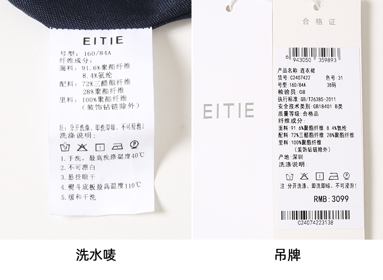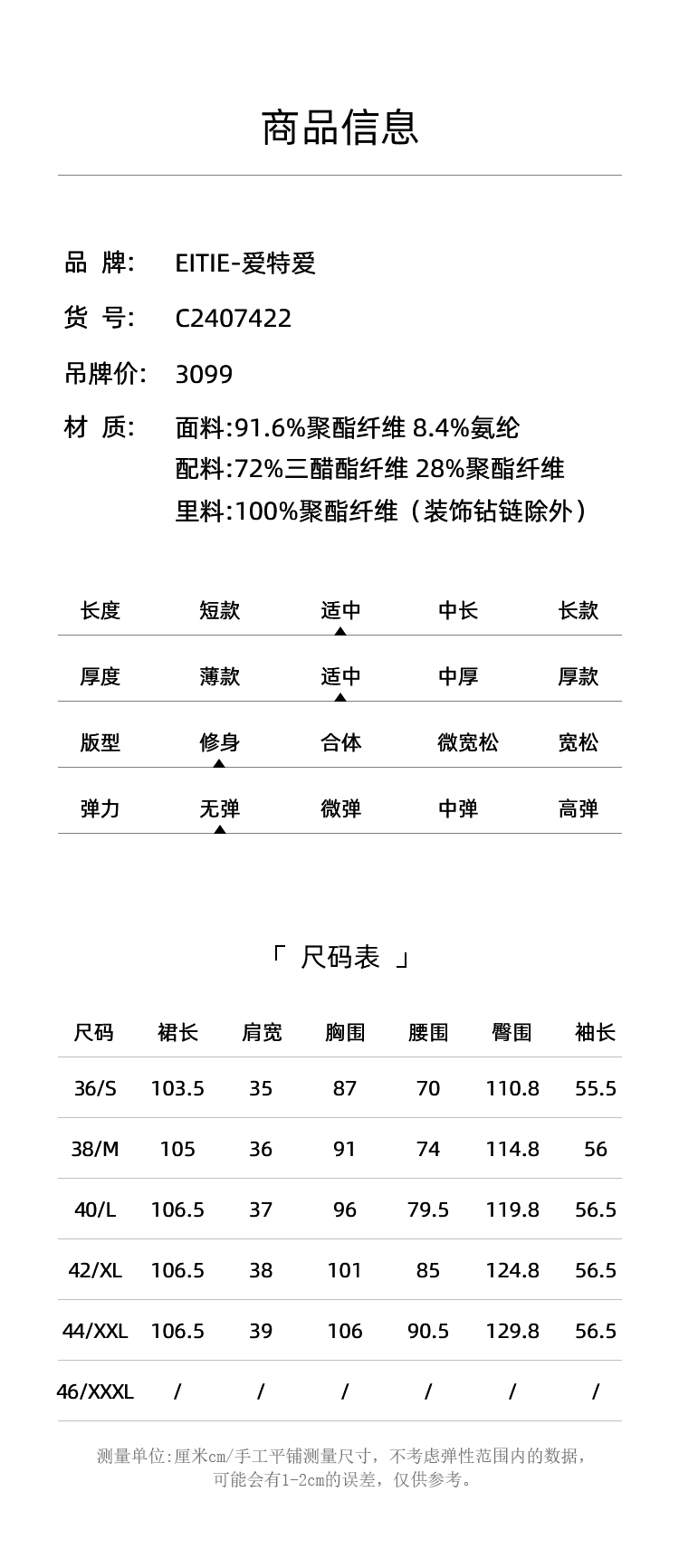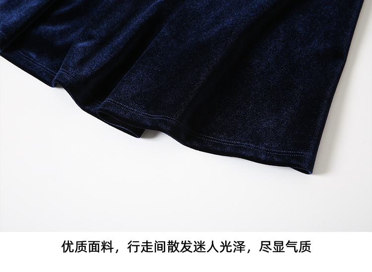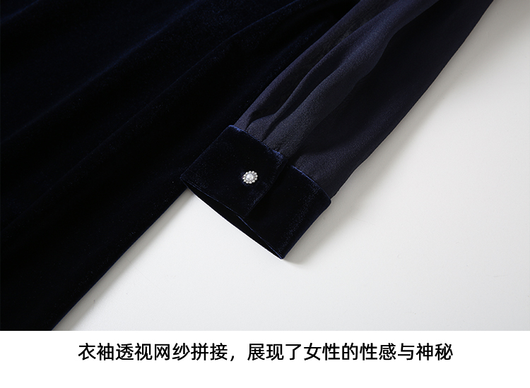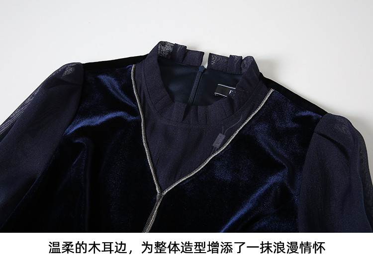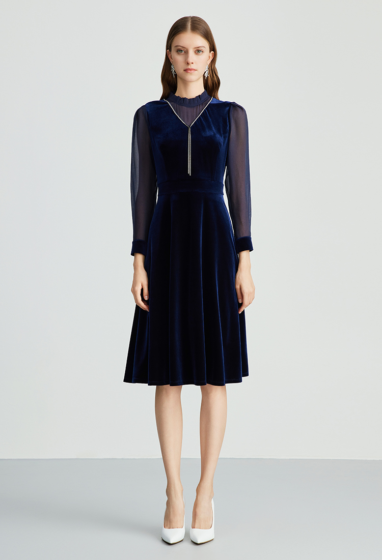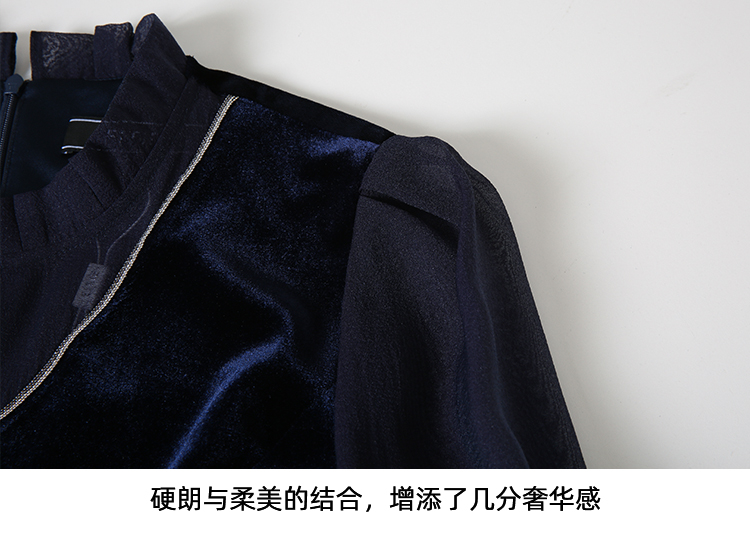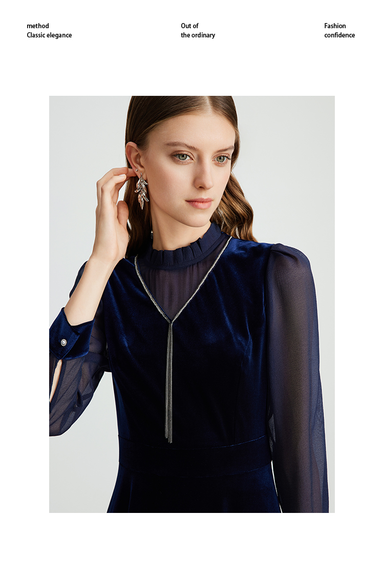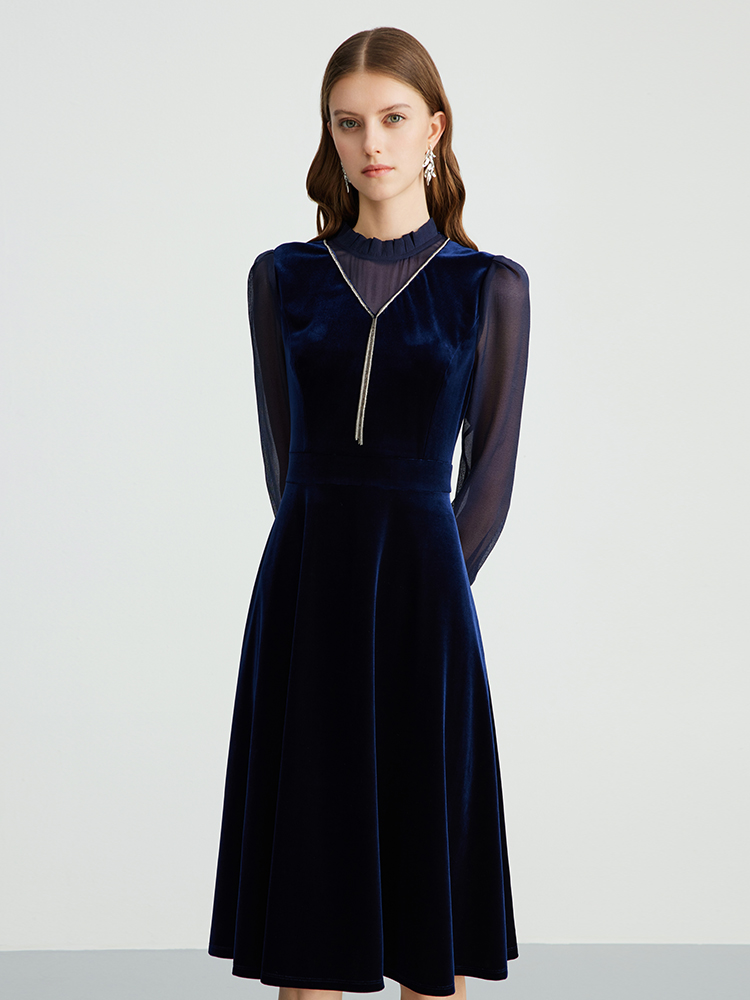 EITIE爱特爱气质优雅网纱拼接丝绒深蓝色收腰连衣裙秋季新款C2407422