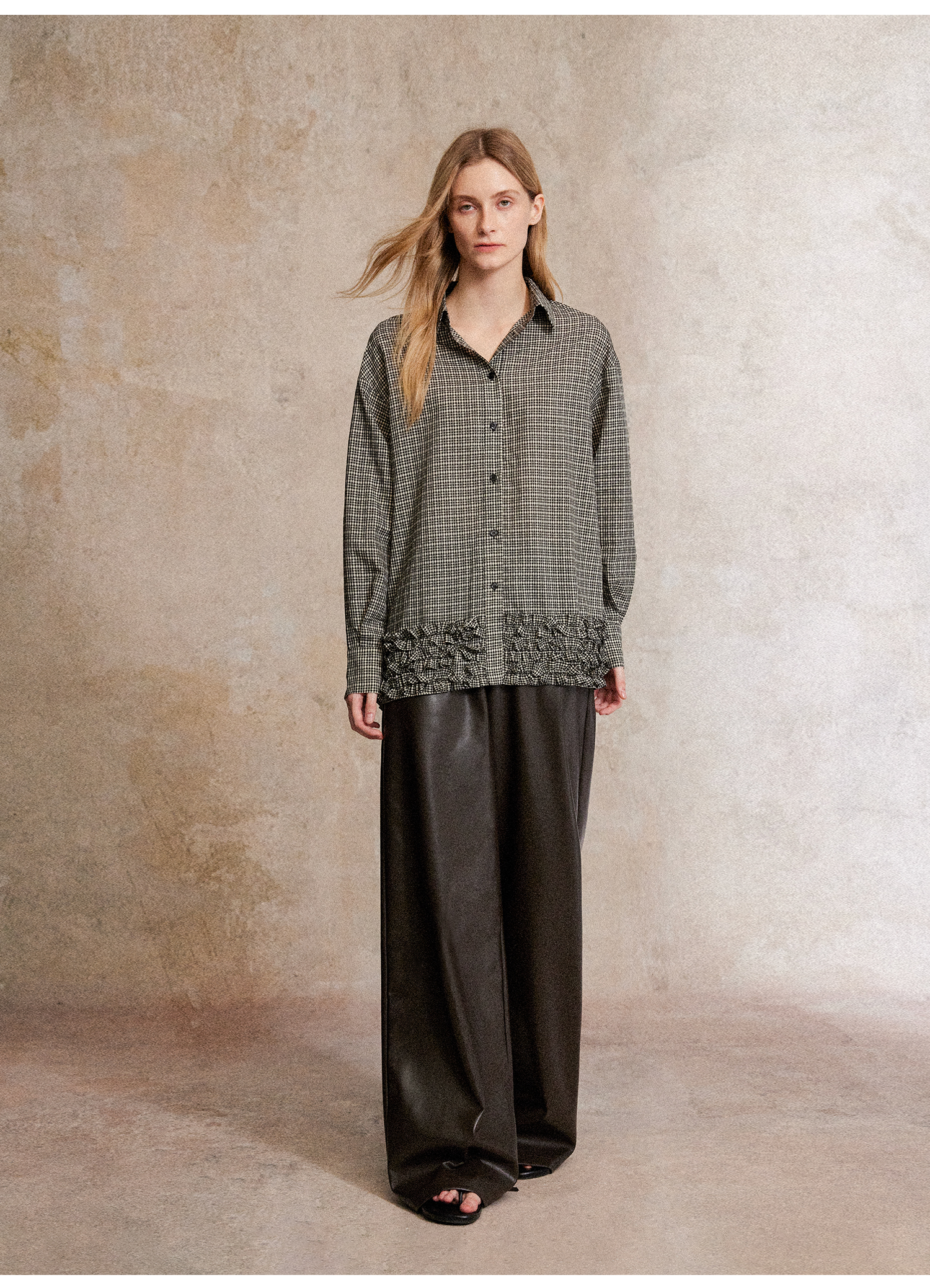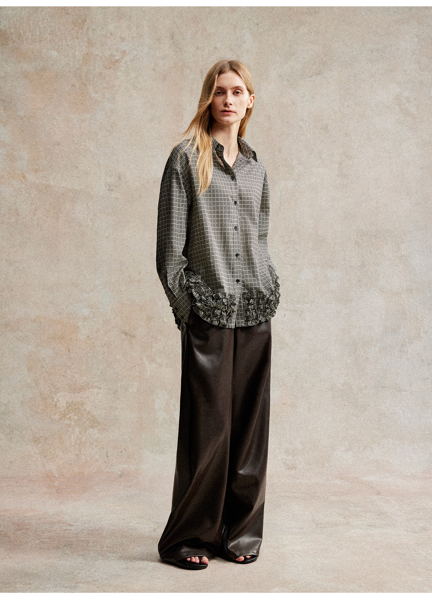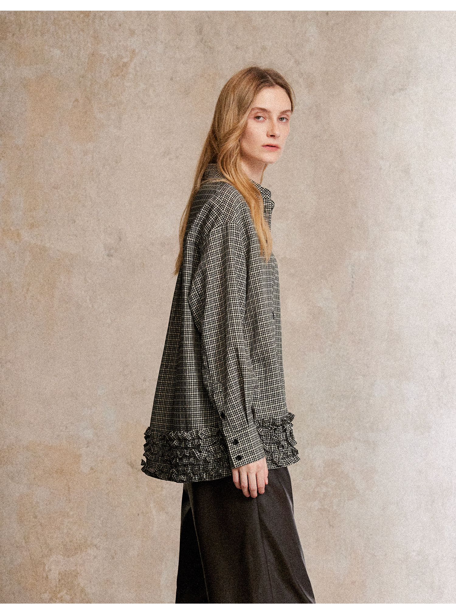 C+IMPRESS/西嘉天丝醋酸提花格纹长袖衬衫木耳边设计感慵懒风上衣