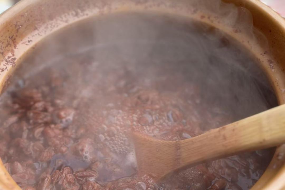 5、加入山茱萸汁,熬煮开,掠去浮沫;