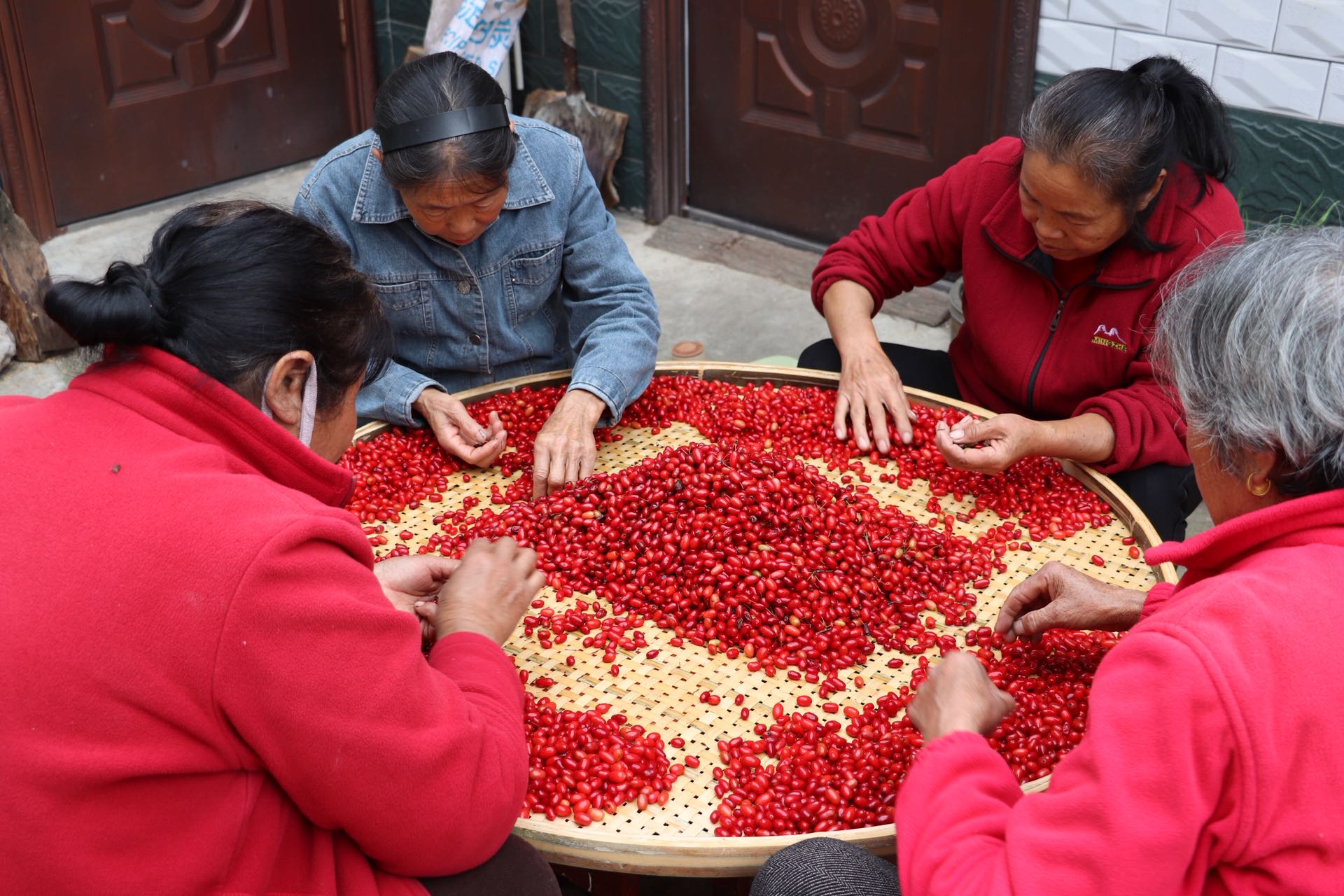 将采收到的鲜果,清水漂洗鲜果2次,捞出漂浮坏果、杂质。随后手工挑出坏果、枝叶、虫子等杂质。再次清水冲洗一次后用50度热风吹6小时,使核肉分离。摊晾一整晚后,去核。在晴天时,自然晾晒;雨天时,热风烘干,不用硫磺等一切药物。