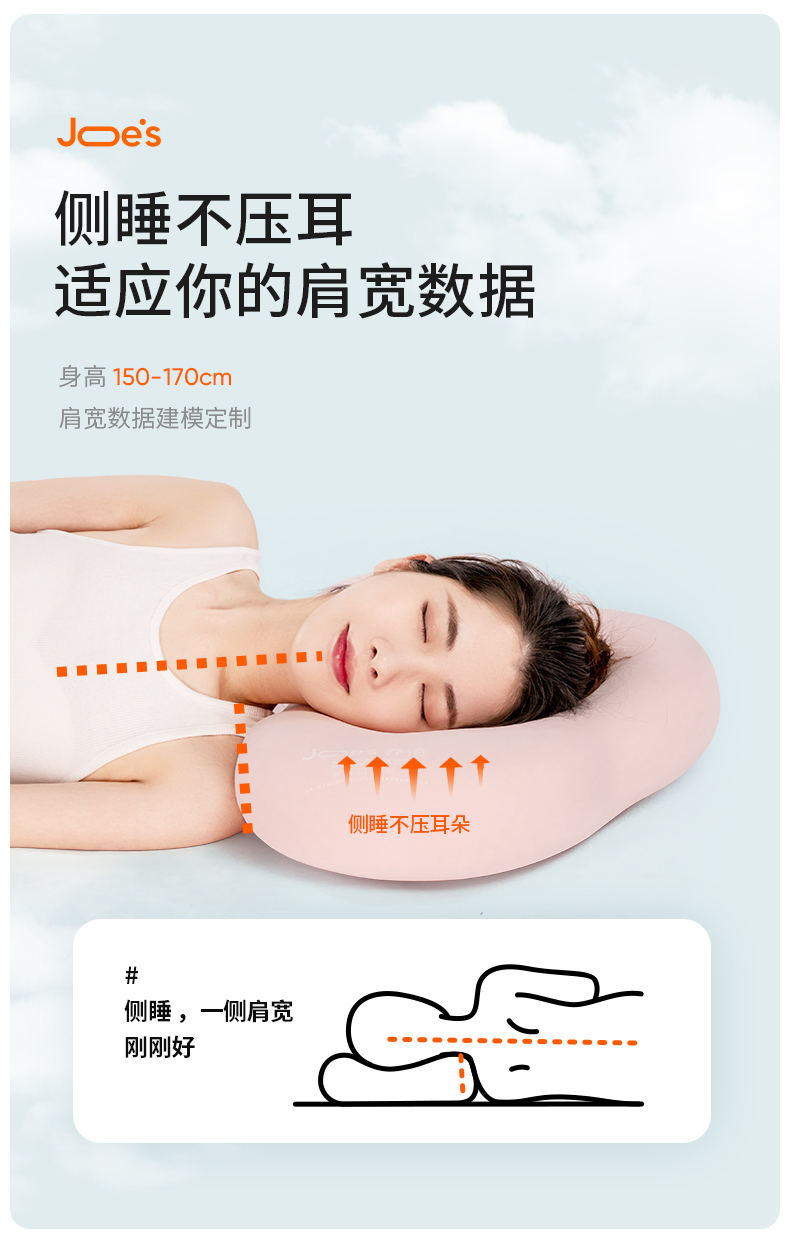 乔德的Soft5颈椎枕在记忆枕的基础上,做了中间低两边高的定型,兼顾了侧睡和平躺两种睡姿对支撑力的要求。