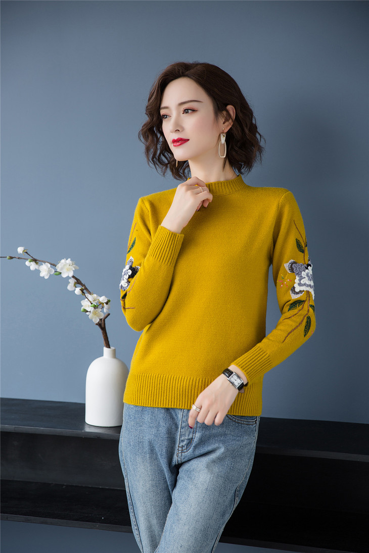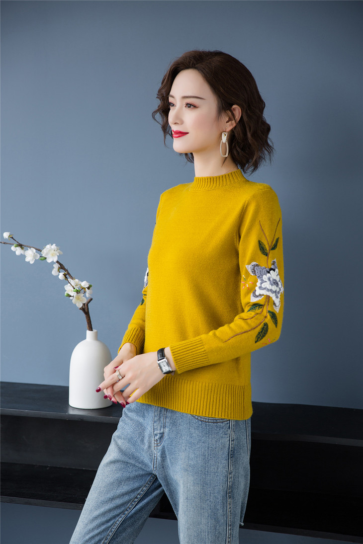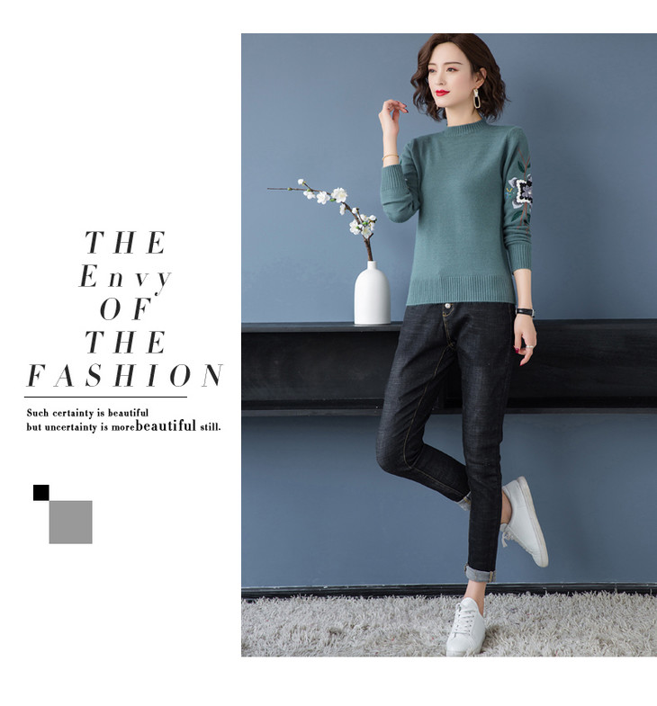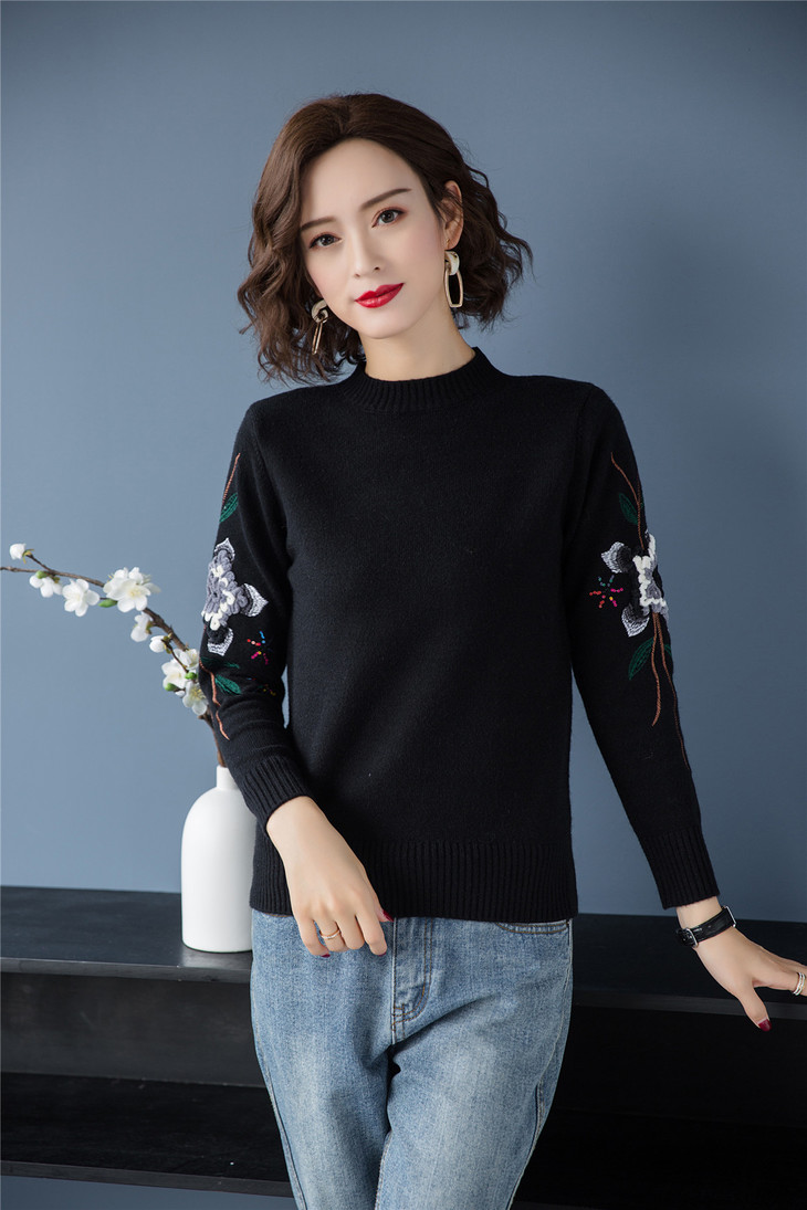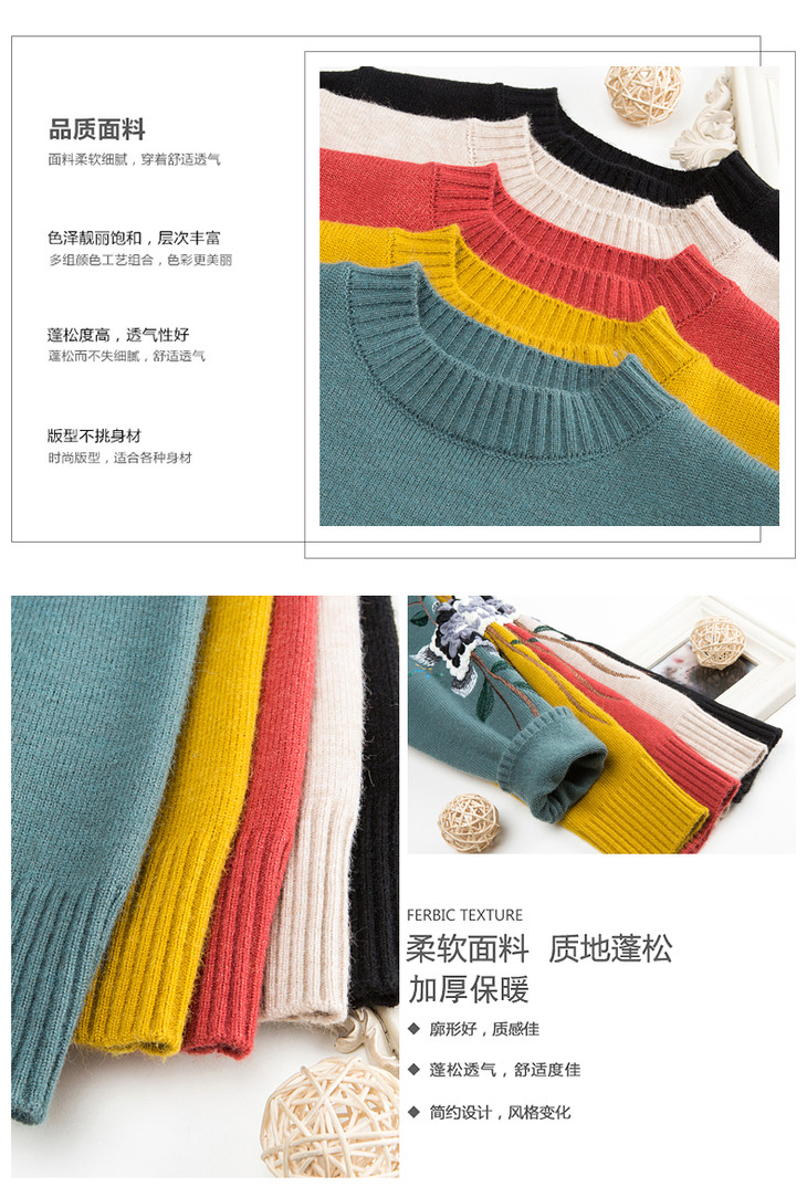 PY-38852 秋冬装新款时尚刺绣女士韩版宽松半高领打底针织毛衣套头