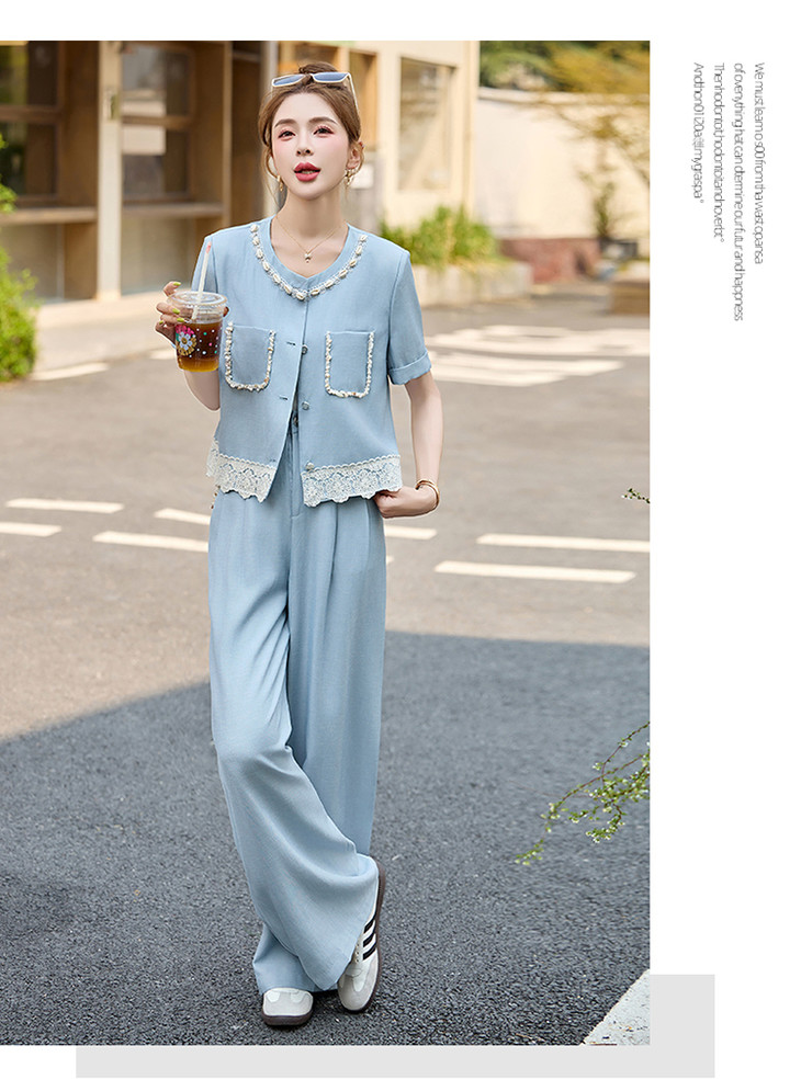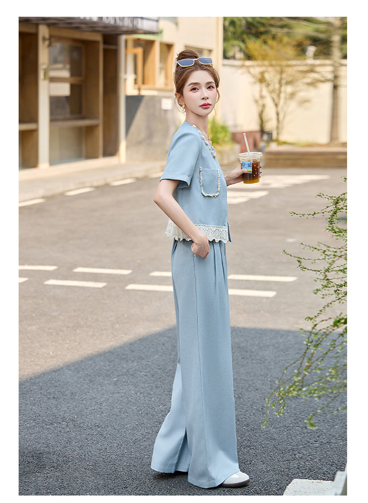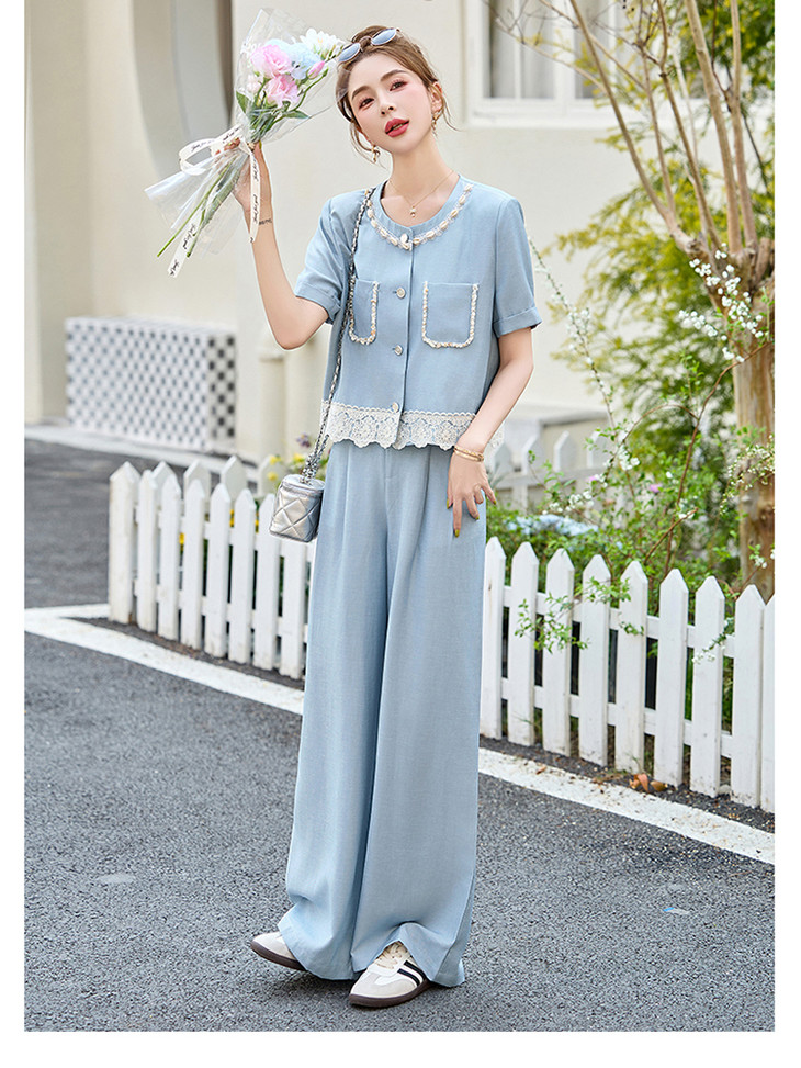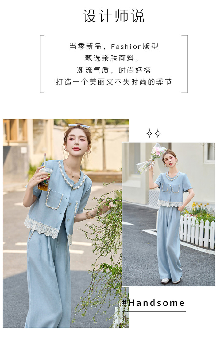时尚香风套装2025新款夏日穿搭蕾丝拼接名媛气质阔腿裤两件套YQH9201