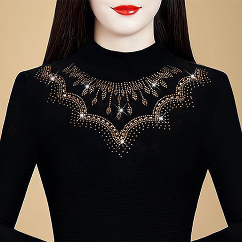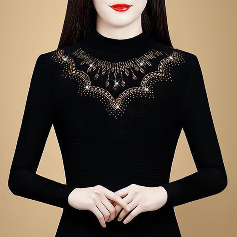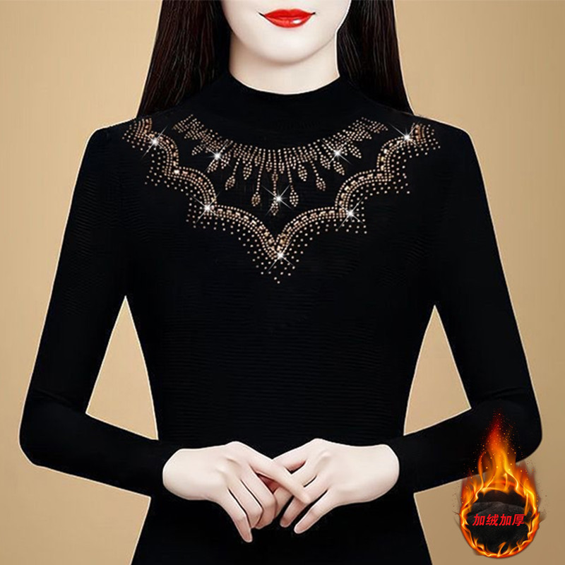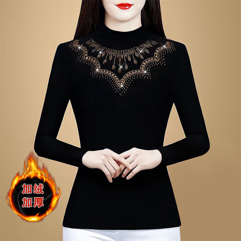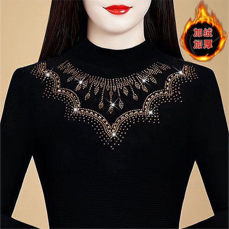 KQL a39n5564时尚重工烫钻网纱打底衫气质半高领显瘦加绒上衣