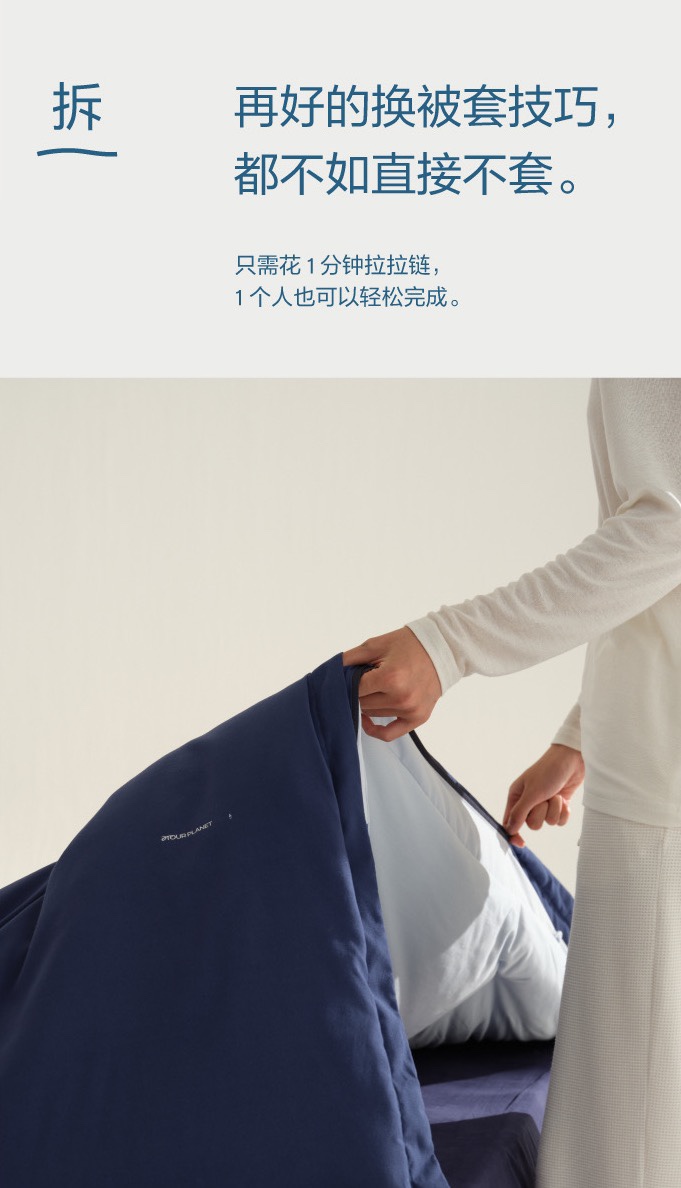 可以整条被子都丢进洗衣机洗烘 不需要再搬出去晾晒 就能睡到彻底洁净的被子 而且一个人就能轻松拉开9m拉链 把里层拆下来单独勤换洗 像洗衣服一样简单轻松的就能每天盖到“新”被子