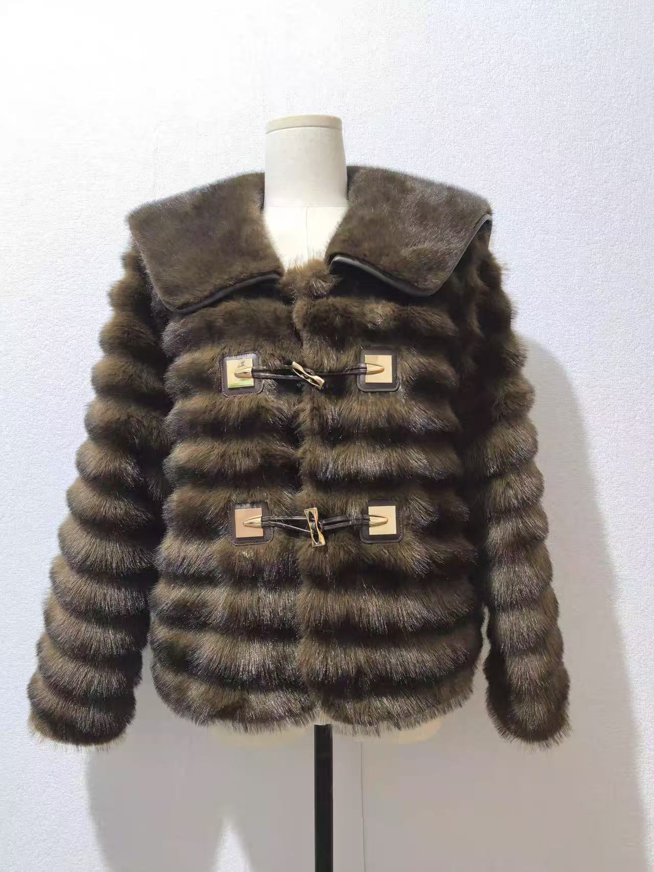 2025冬季时尚龙猫外套翻领新款仿獭兔毛短款毛毛横纹大衣