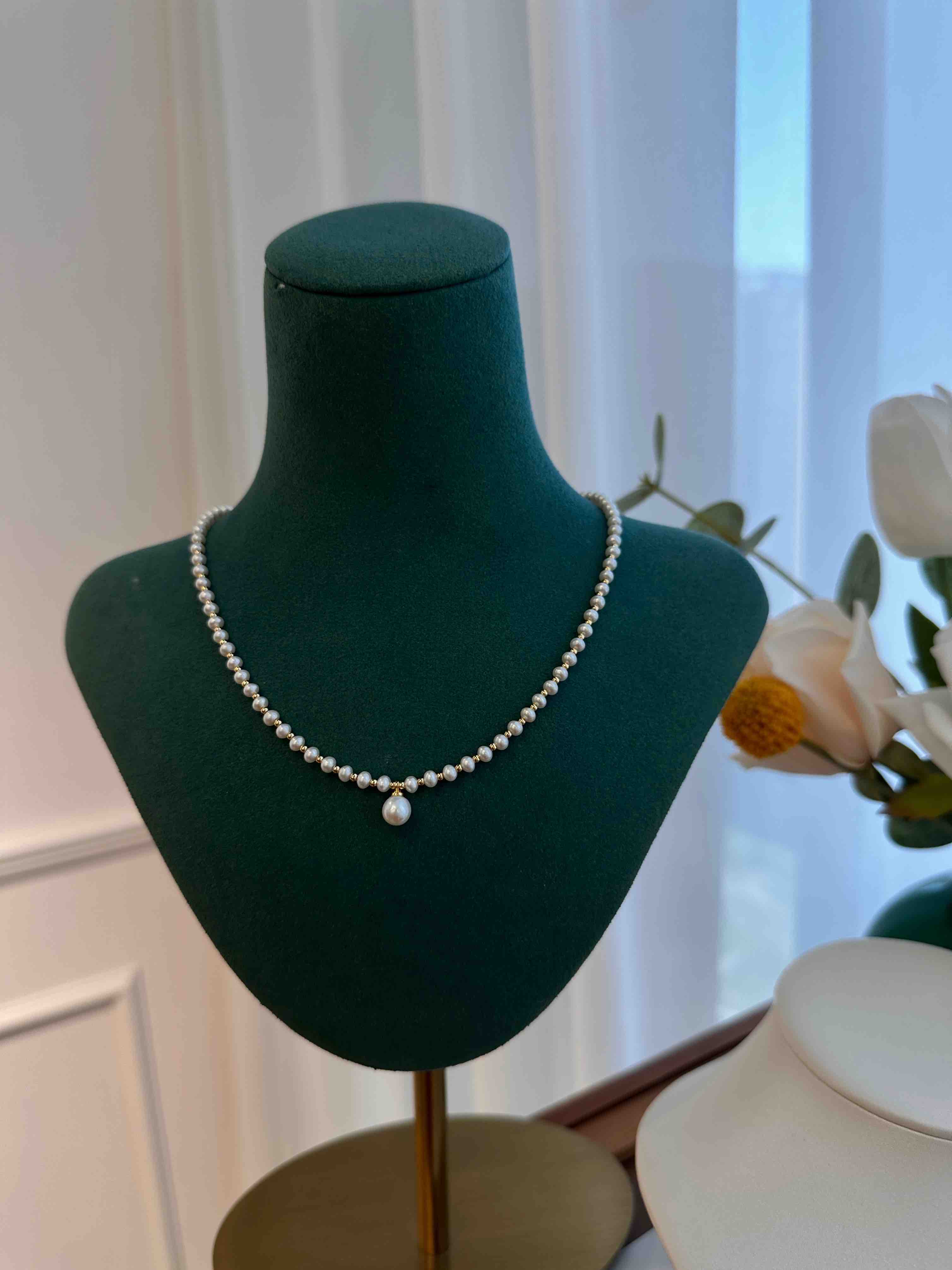 小珍珠约3mm,中间这颗6-7mm,小金球是14k注金(美国保色材质),尾部链条是925银镀金。(卖这款有点久了售后也很少,应该保色可以的哦)