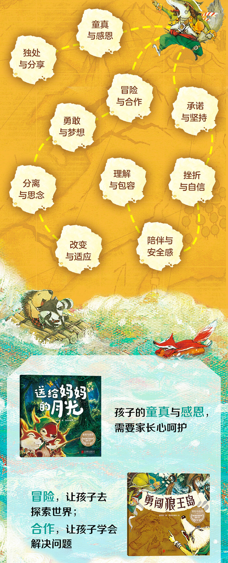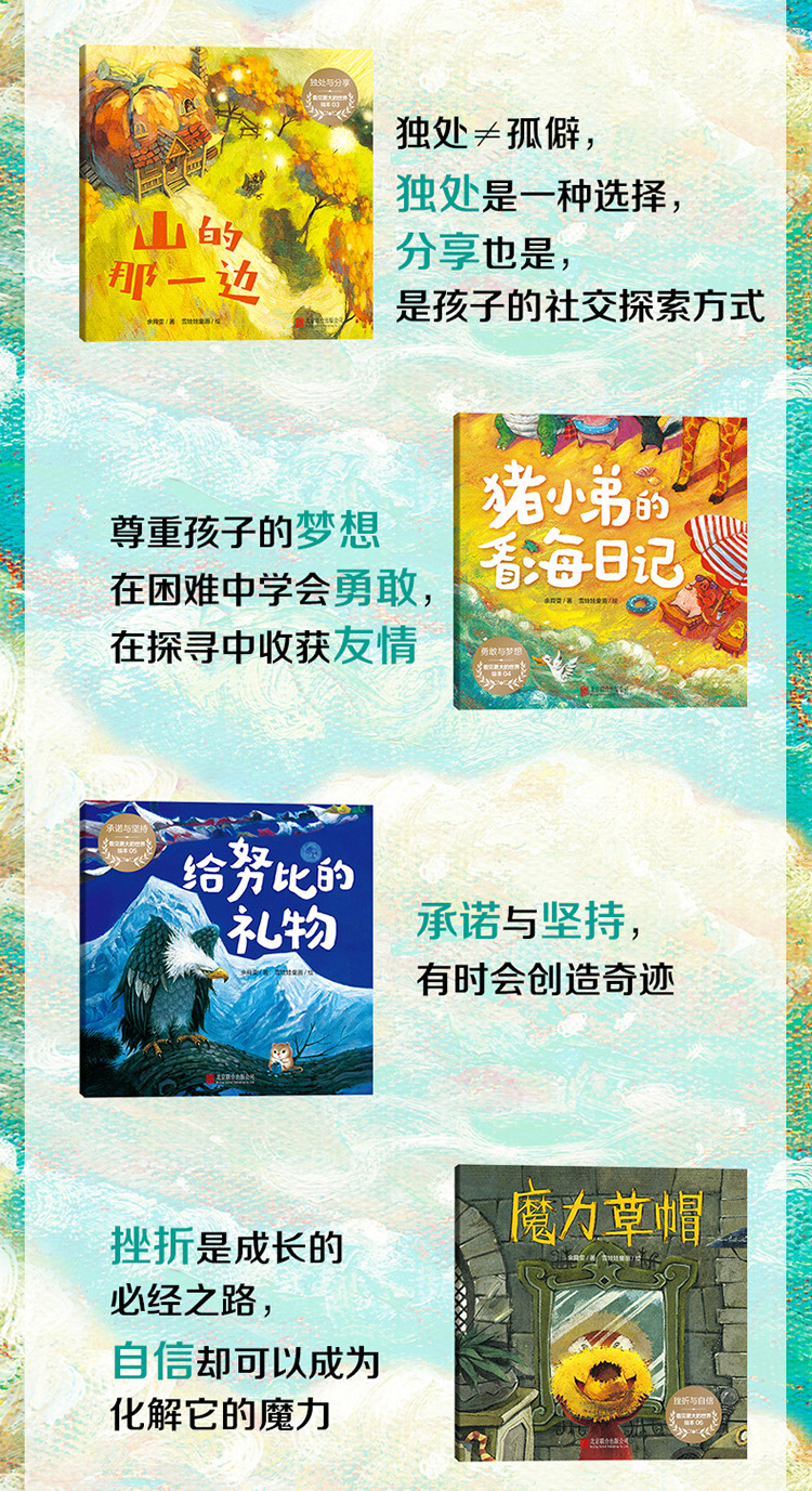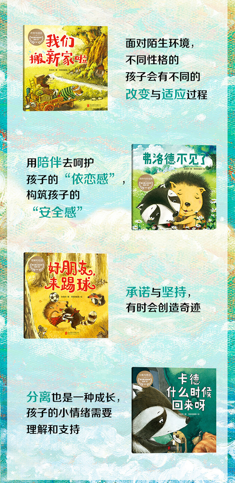 3.每本书都包含0-6岁孩子成长所需的不同主题:童真与感恩、爱好与付出、陪伴与温暖、合作与坚持、冒险与团结、信任与承诺、自我认同与发现、改变与适应、争吵与和好、分离与孤独、乐观与勇敢等