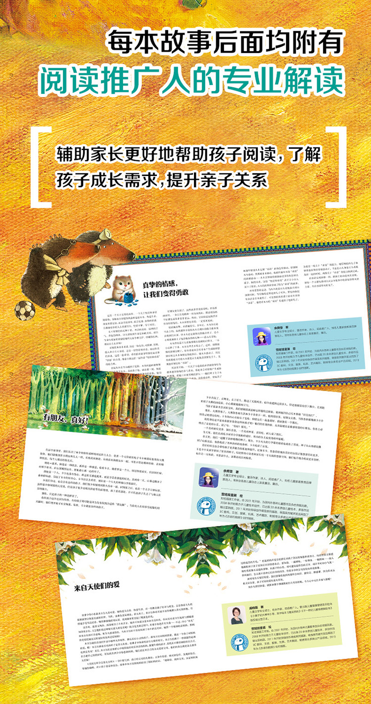 4.每本故事后面均附有阅读推广人的专业解读,辅助家长更好地帮助孩子阅读,了解孩子成长需求,提升亲子关系