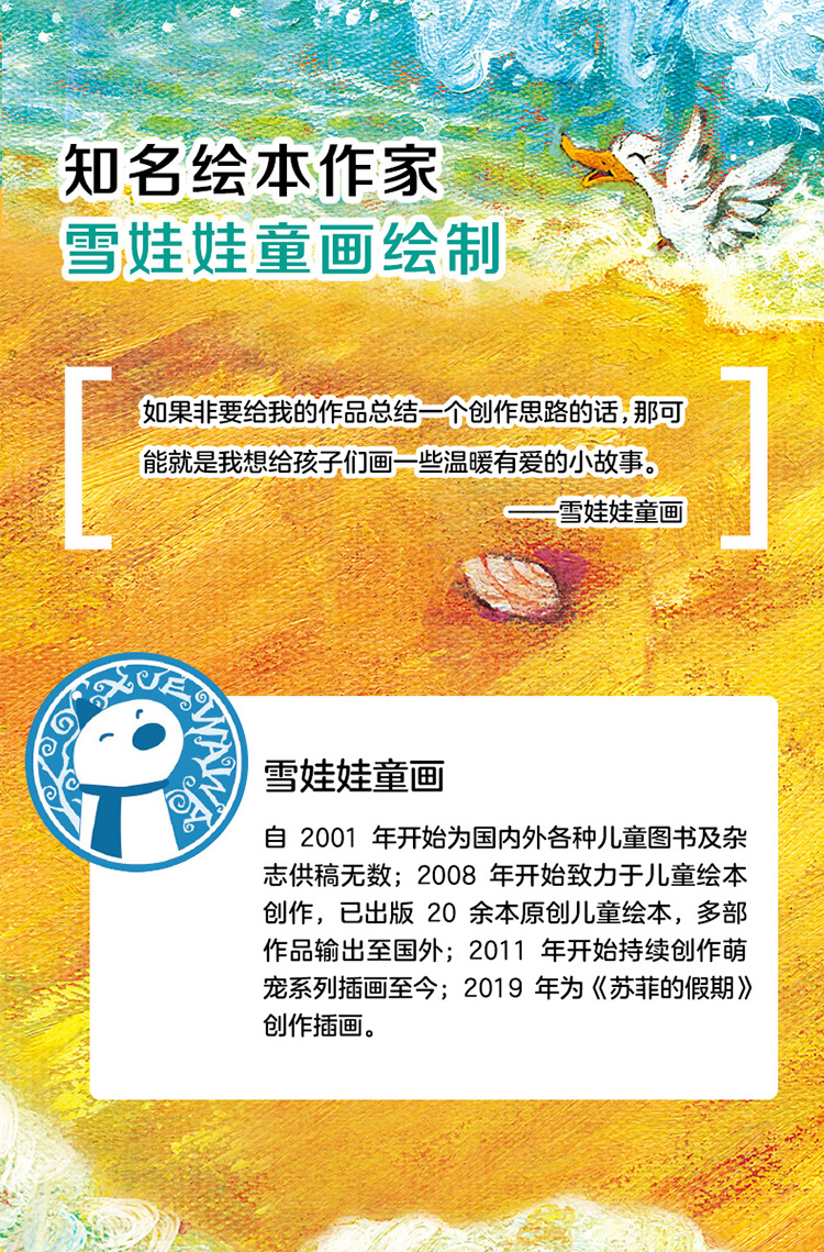 国内知名绘本作家。自2001年开始为国内外各种儿童图书及杂志供稿无数;2008年开始致力于儿童绘本创作,已出版20余本原创儿童绘本,多部作品输出至韩国;2011年开始持续创作萌宠系列插画,萌宠系列被开发运用到了3C数码、文创、服装、玩具、艺术雕刻、刺绣等众多商业产品领域;2019年为《苏菲的假期》创作插画。