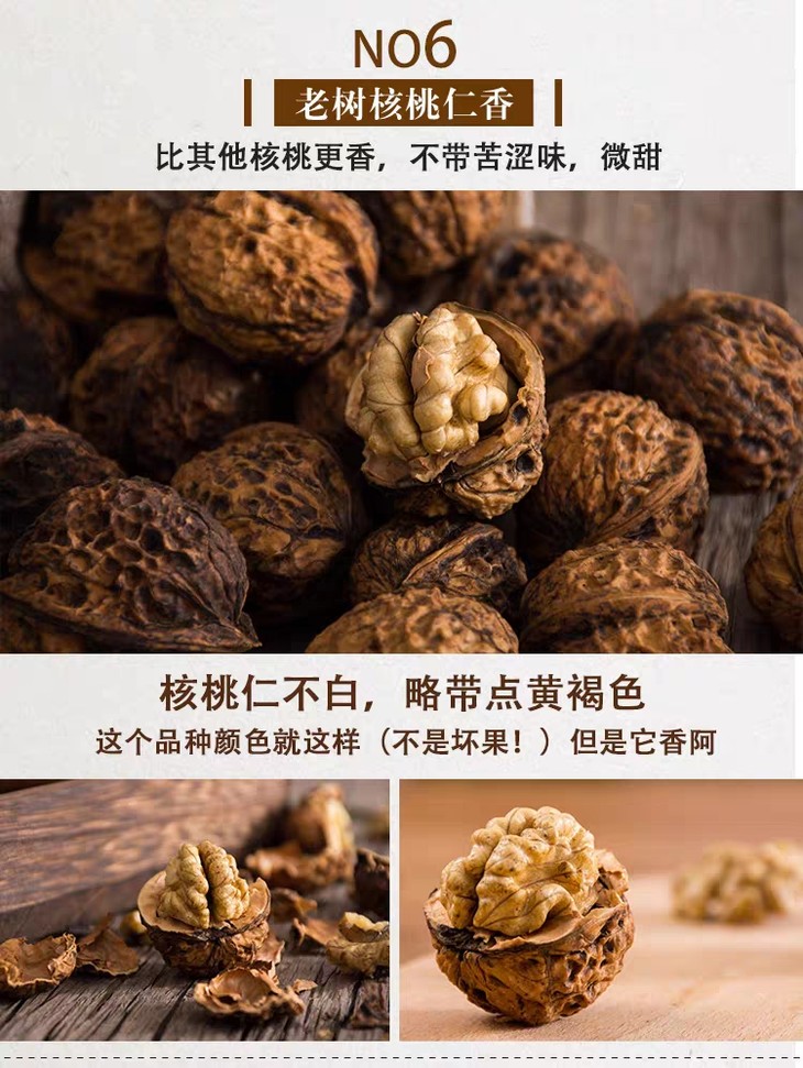 甜味核桃:没有烟熏,自然晾晒干,有丰富的油脂,它的口感酥脆度会少一点点,但是它吃时回甘的口感,后感甜甜的。