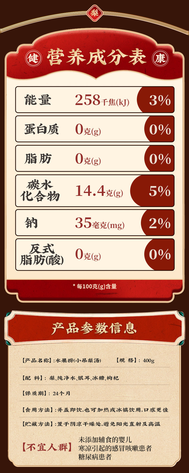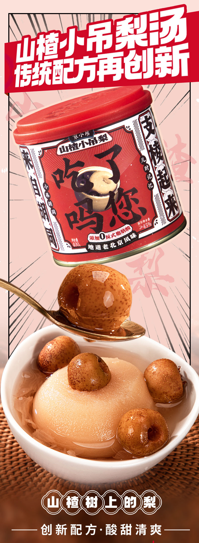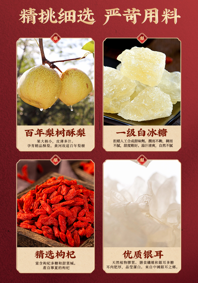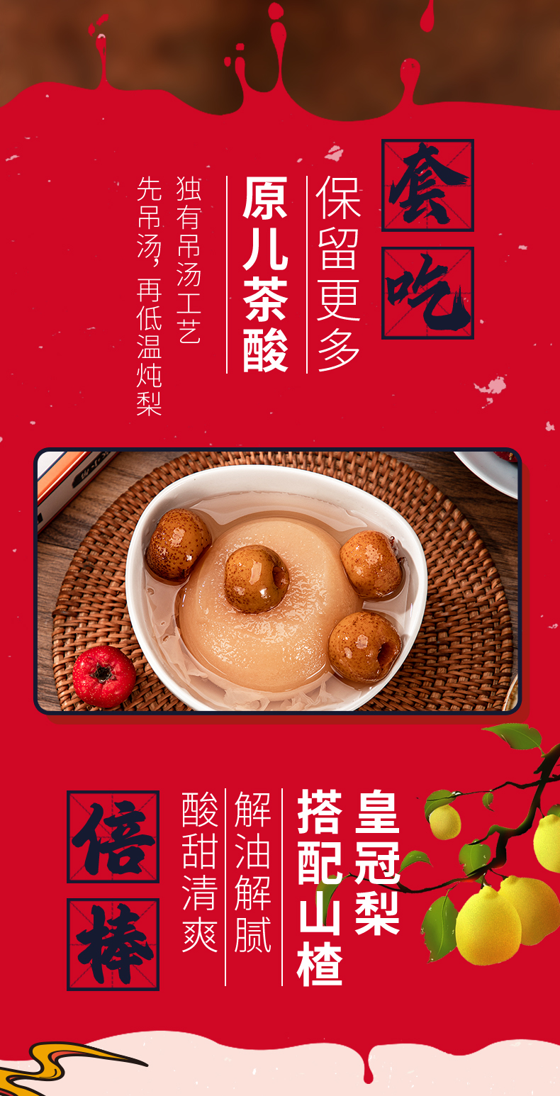 【配料表】梨(整颗)、纯净水、山楂(≥15g)银耳、冰糖、陈皮(提取物)