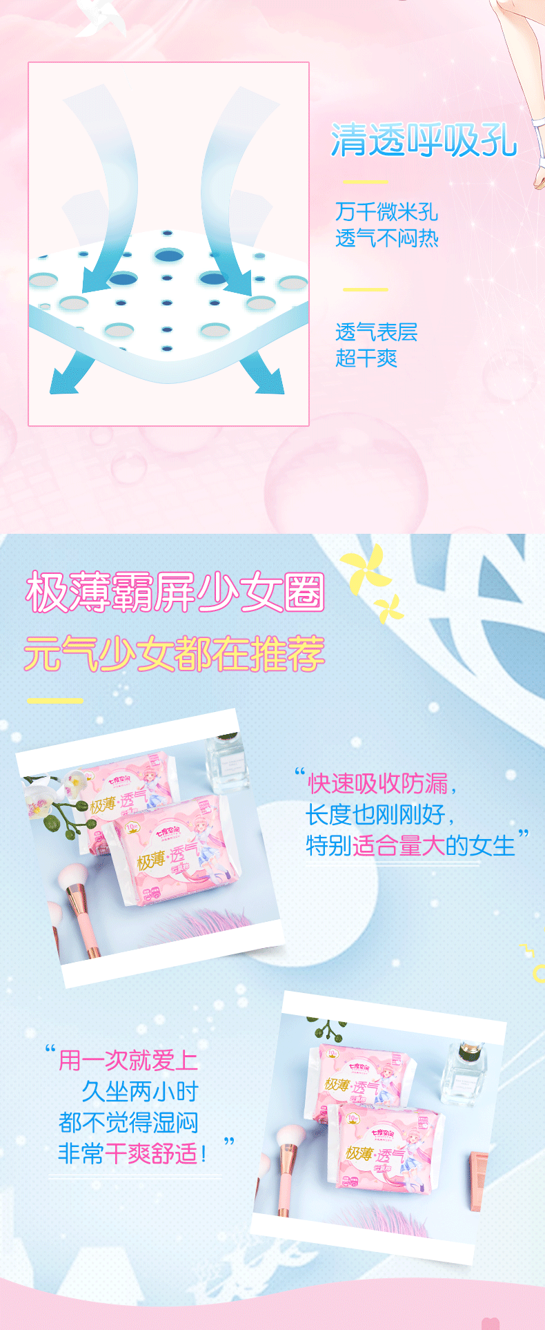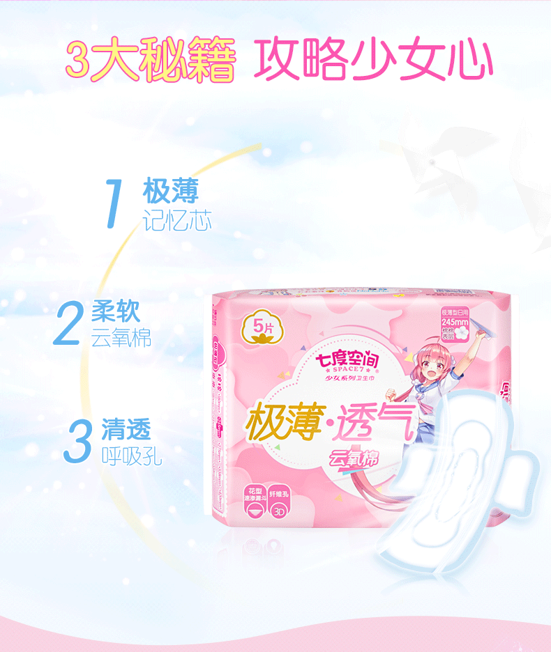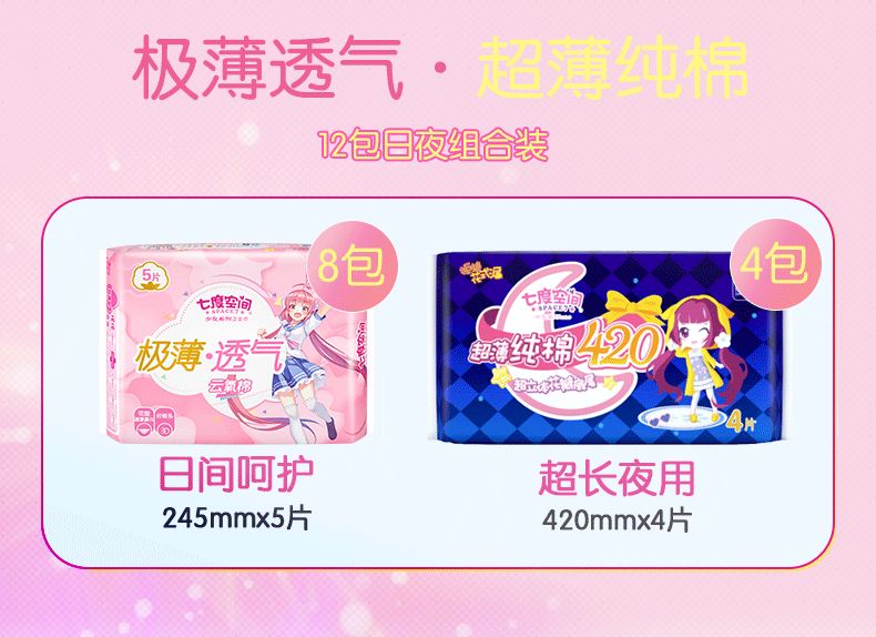 七度空间(SPACE7) 少女系列 纯棉超薄极薄日用夜用组合套装12包56片 (日245mm*40p+夜420mm*16p)