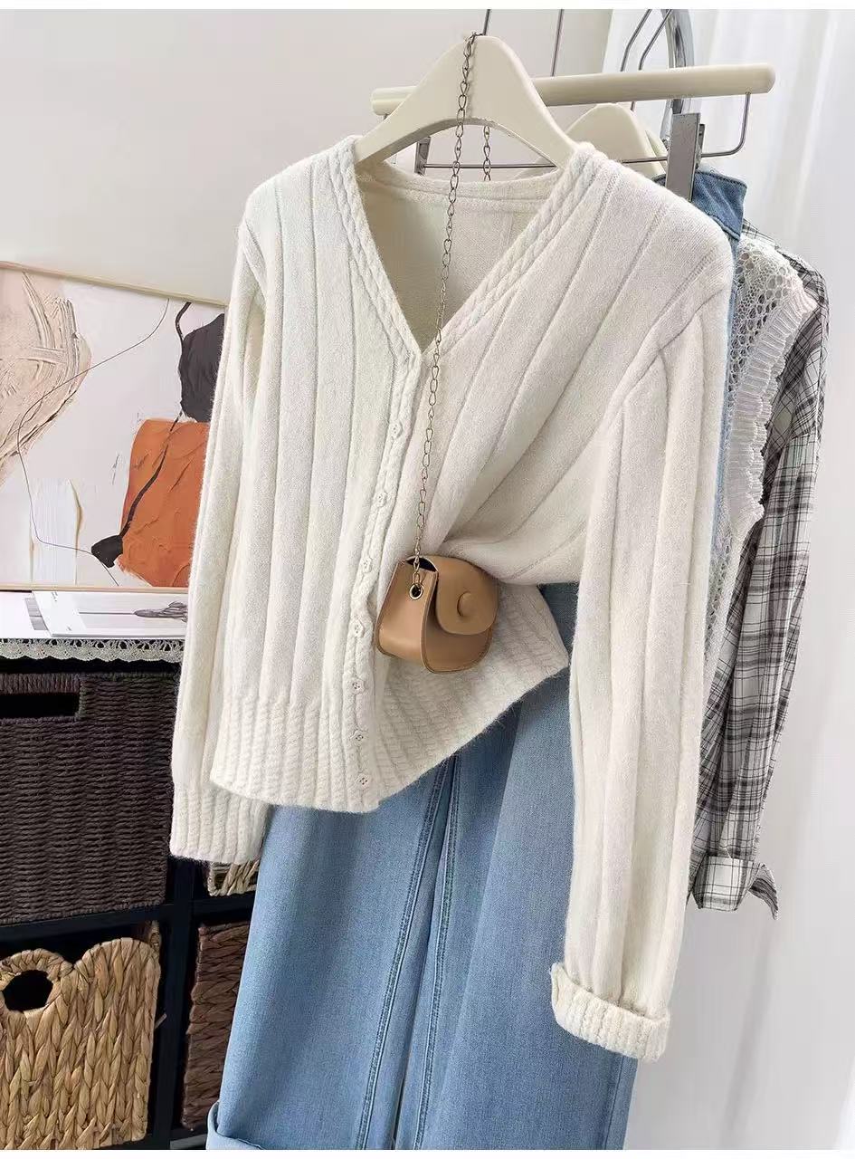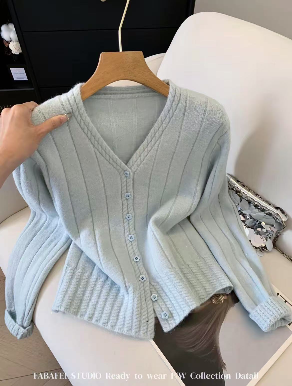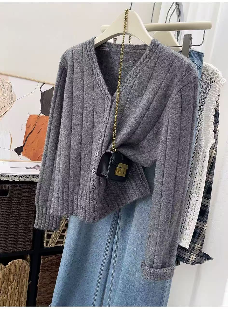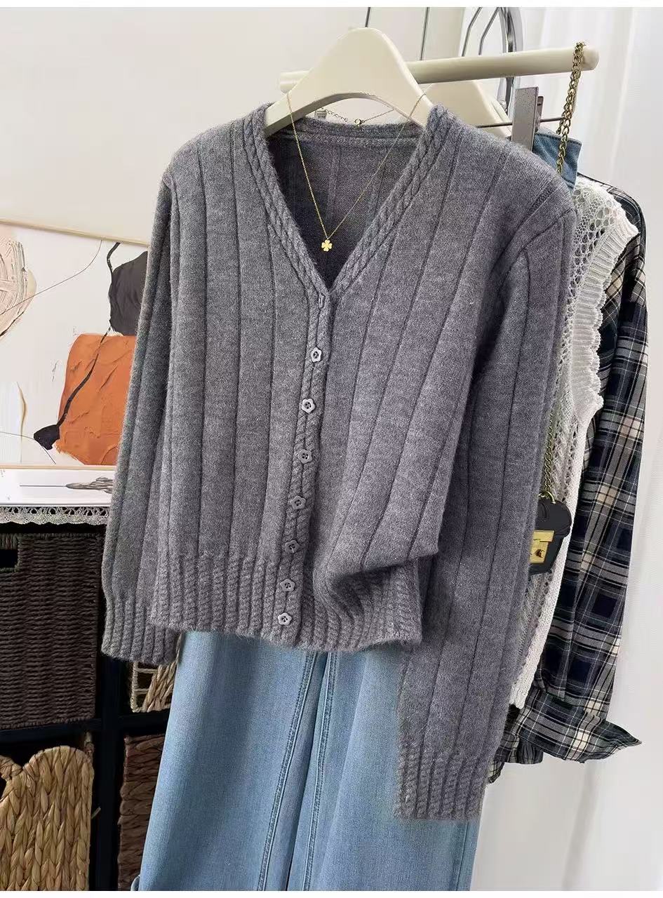 女王节抢购价-不支持退→清!不支持退货【自营】跨年福利-【超美毛衣】星空银丝款~Z094韩系花朵扣麻花下摆V领开衫毛衣-喜出