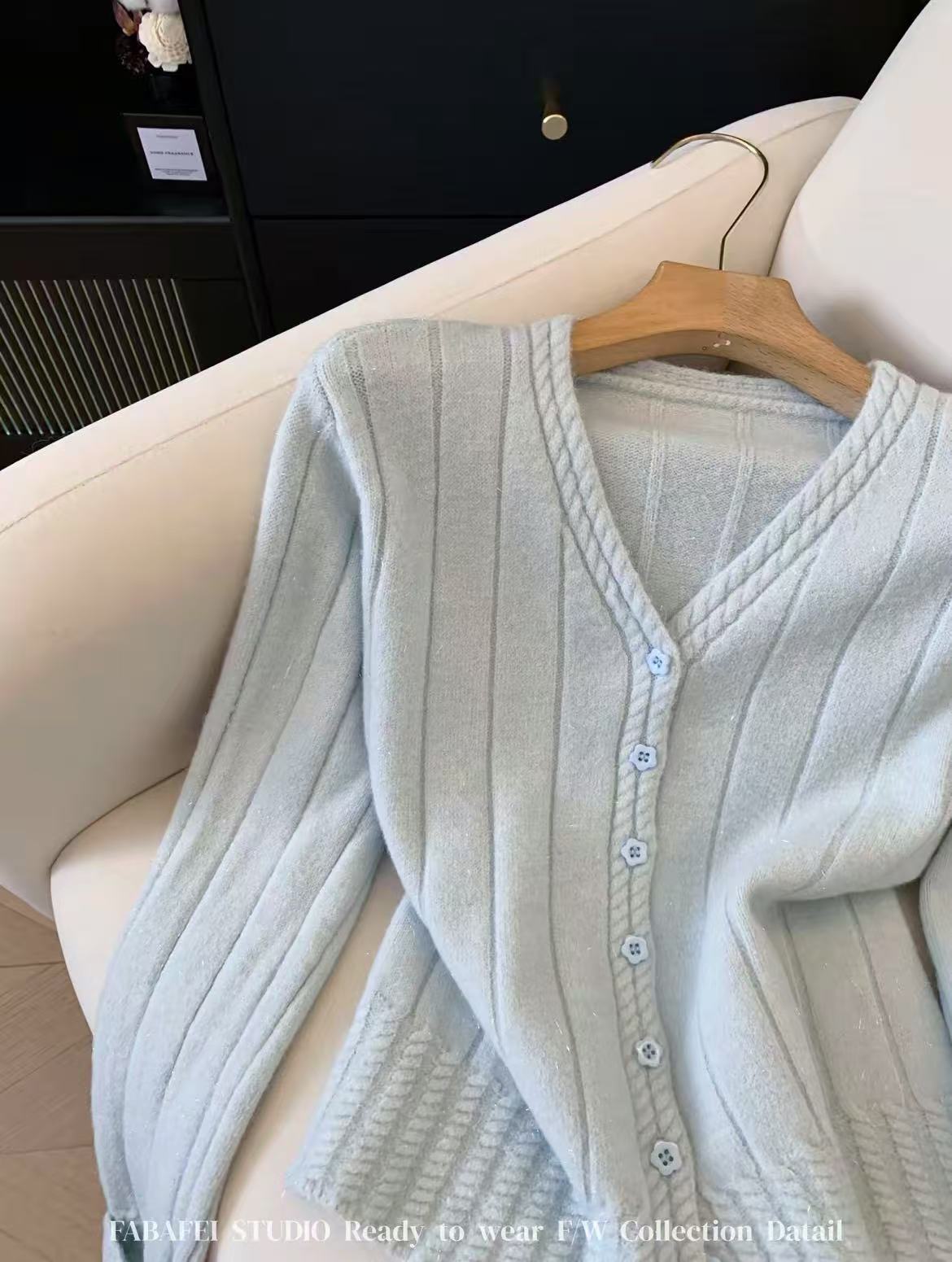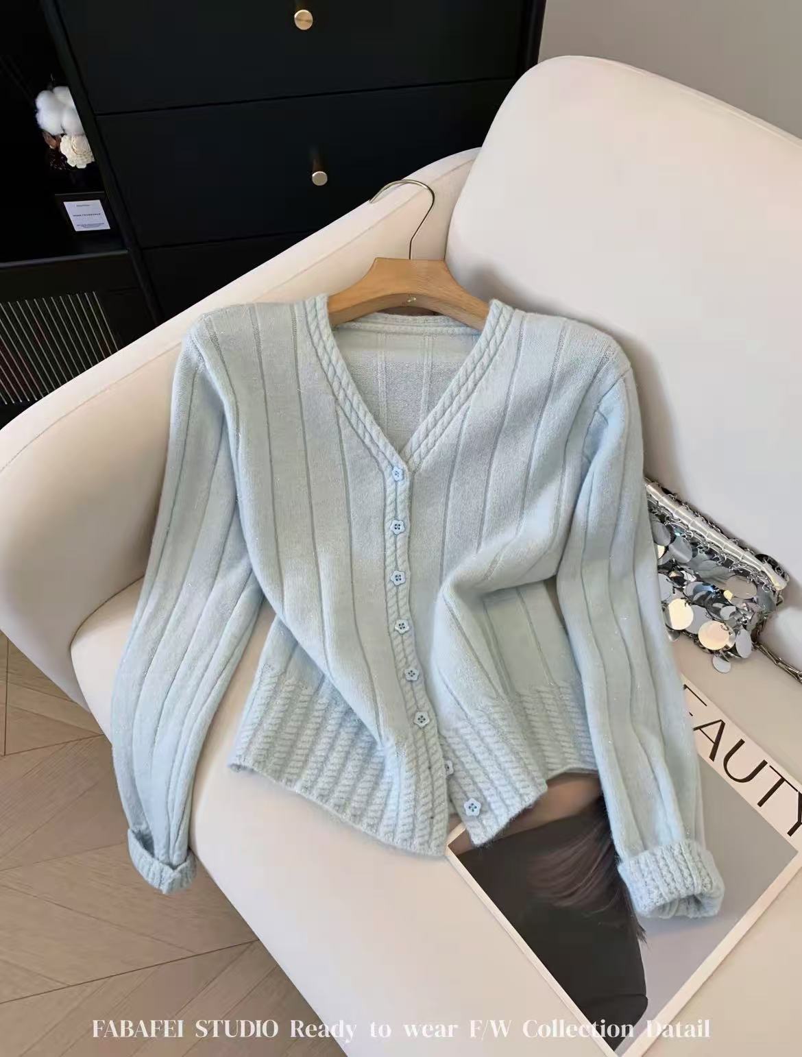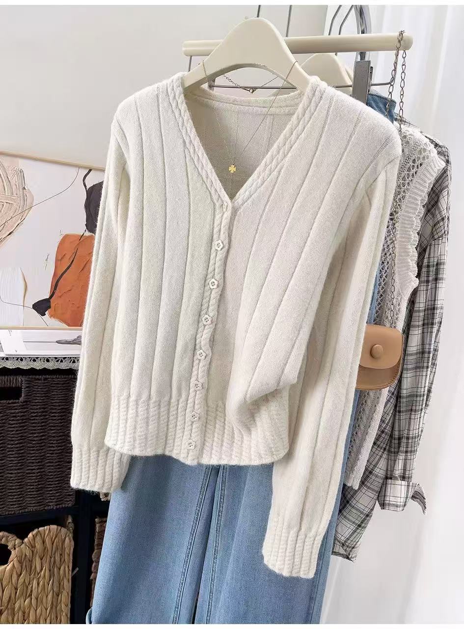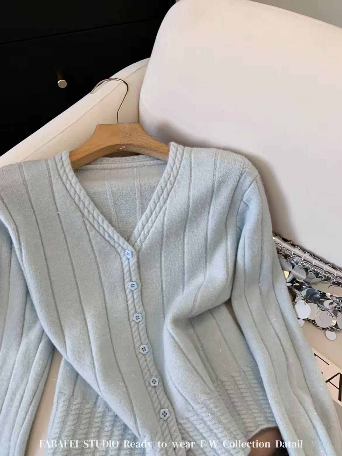 女王节抢购价-不支持退→清!不支持退货【自营】跨年福利-【超美毛衣】星空银丝款~Z094韩系花朵扣麻花下摆V领开衫毛衣-喜出