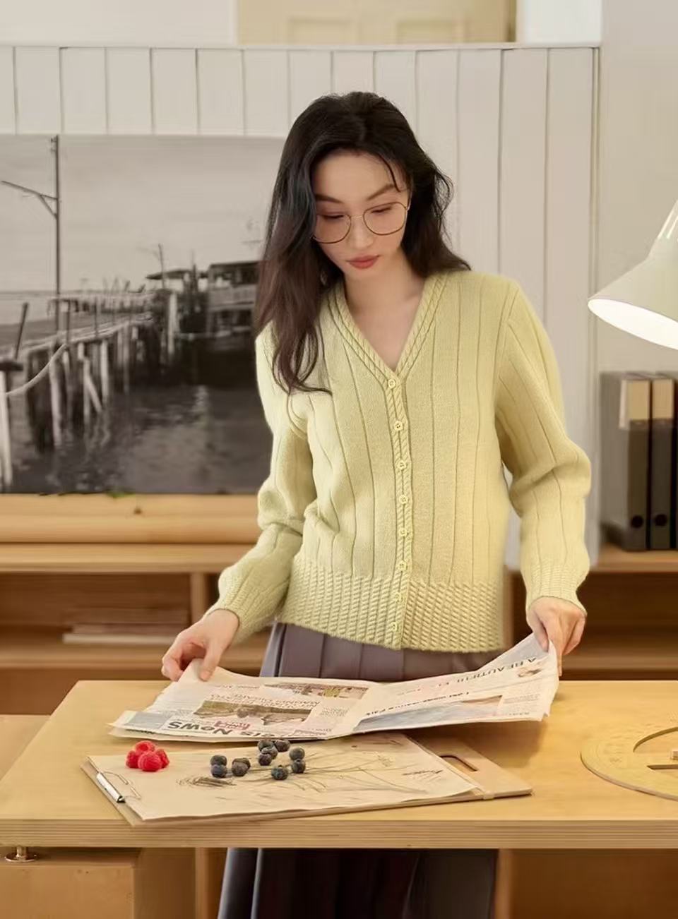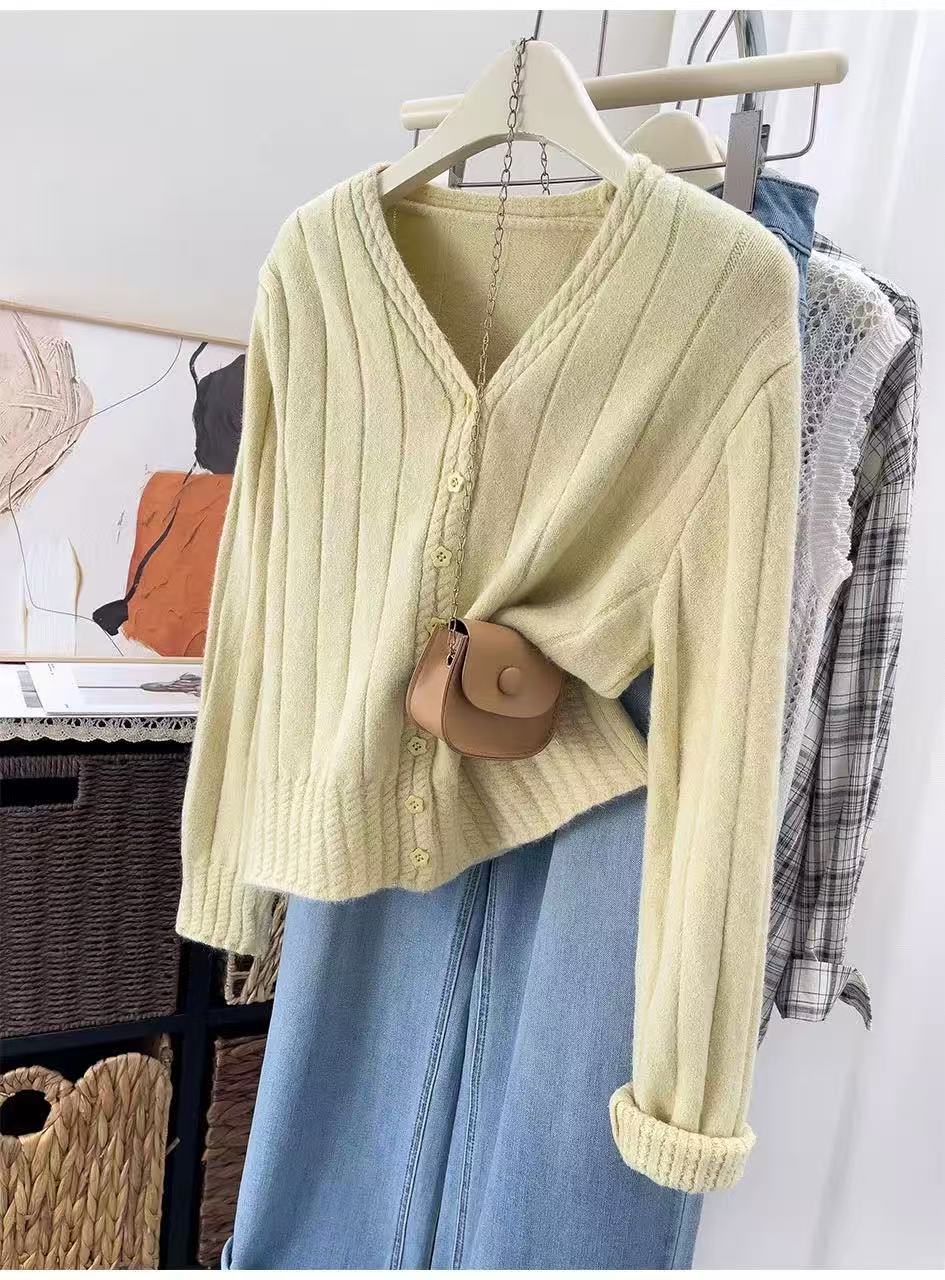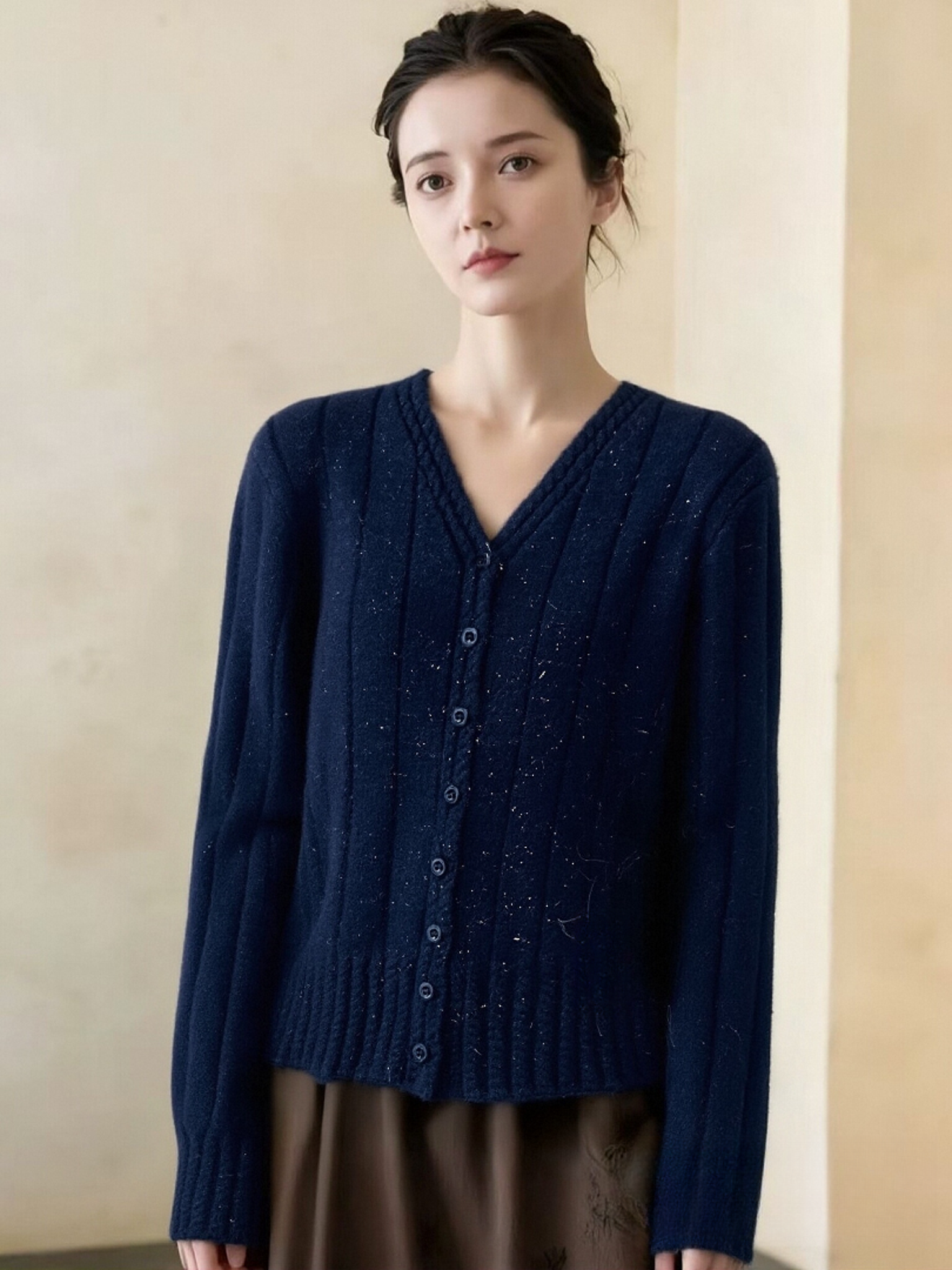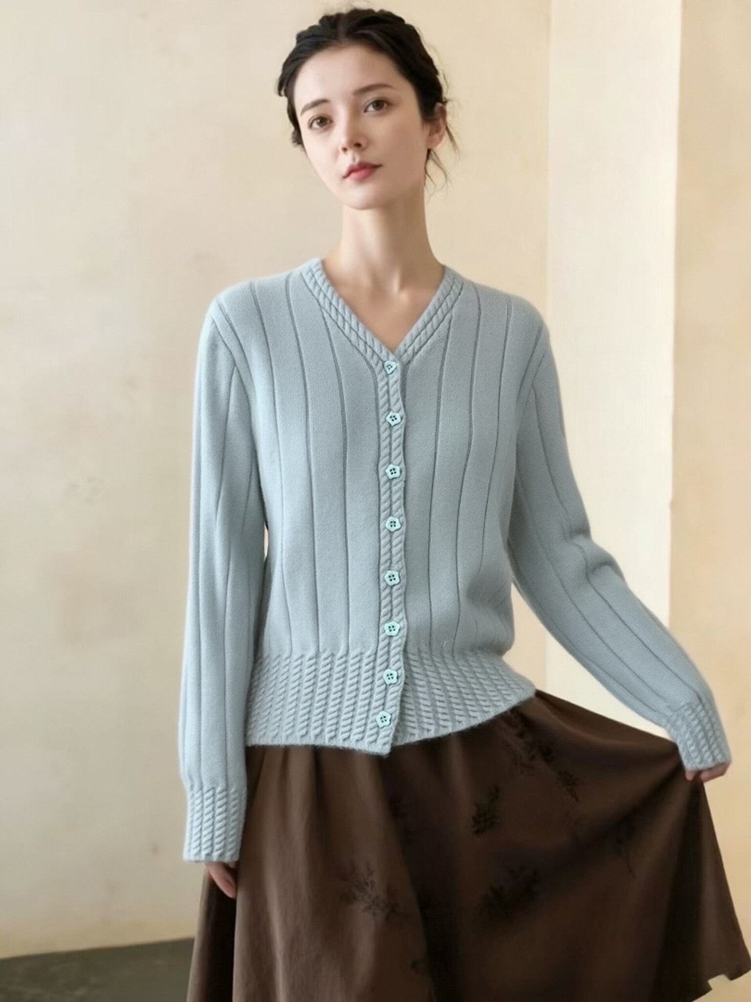 女王节抢购价-不支持退→清!不支持退货【自营】跨年福利-【超美毛衣】星空银丝款~Z094韩系花朵扣麻花下摆V领开衫毛衣-喜出