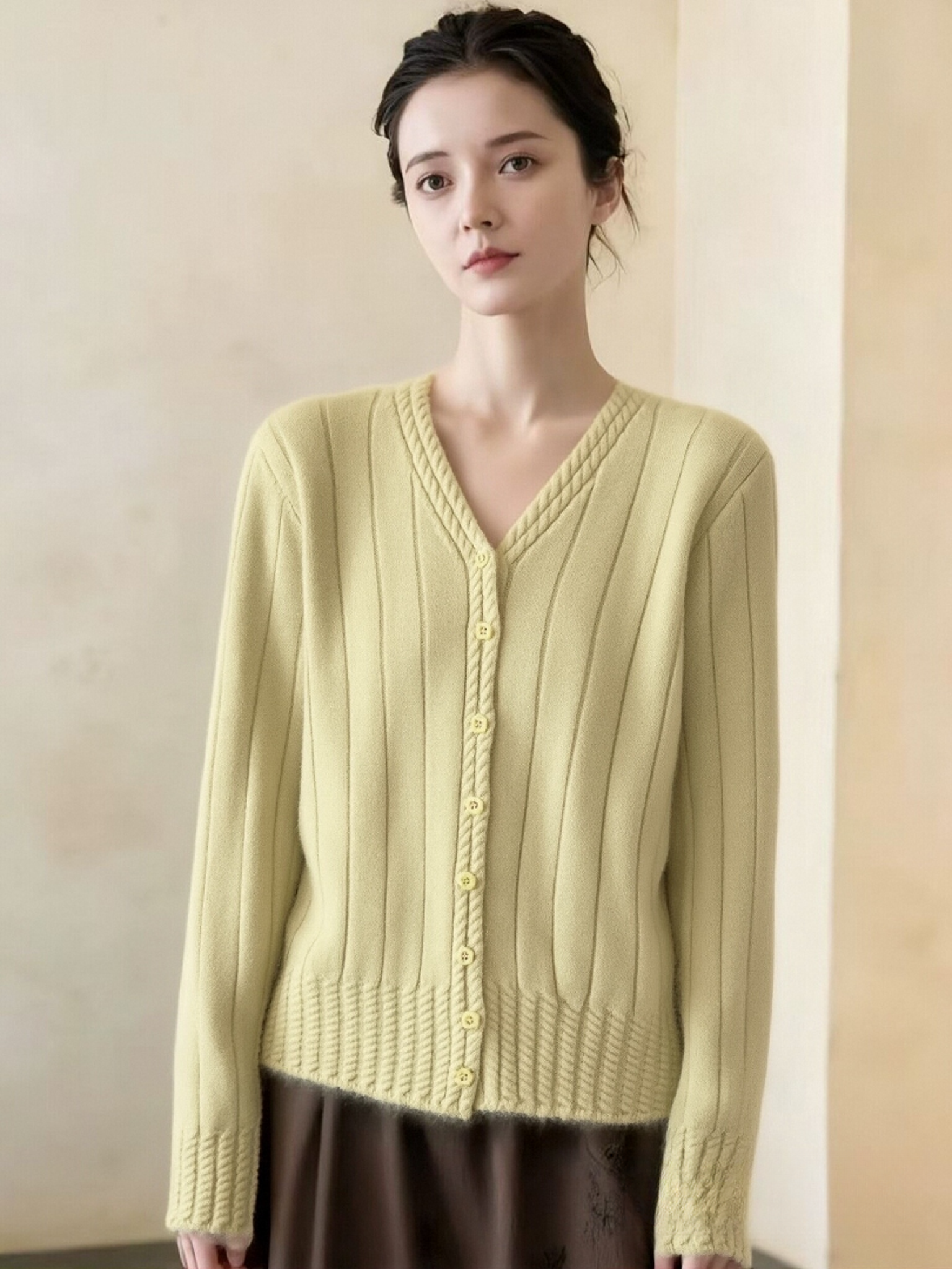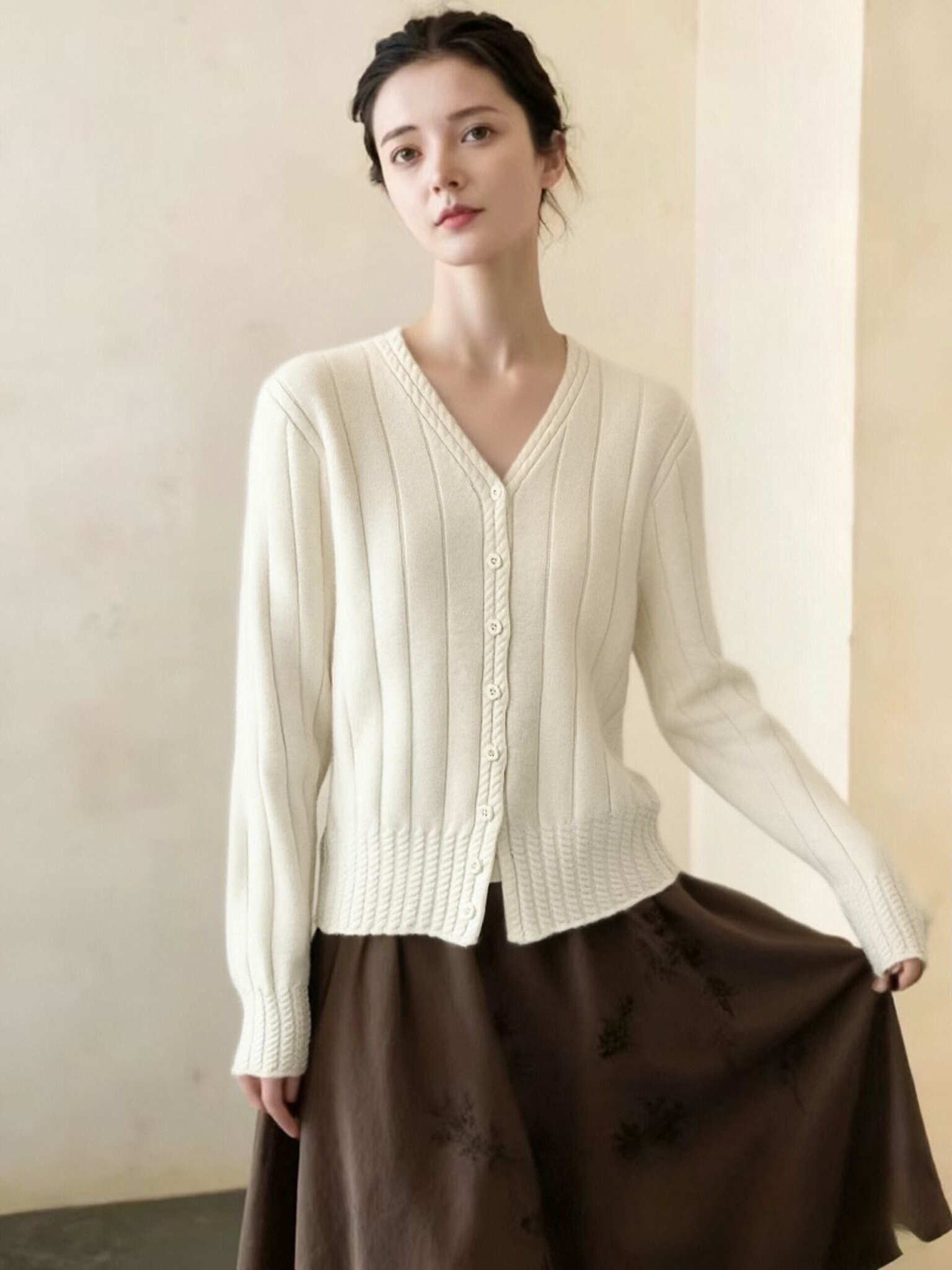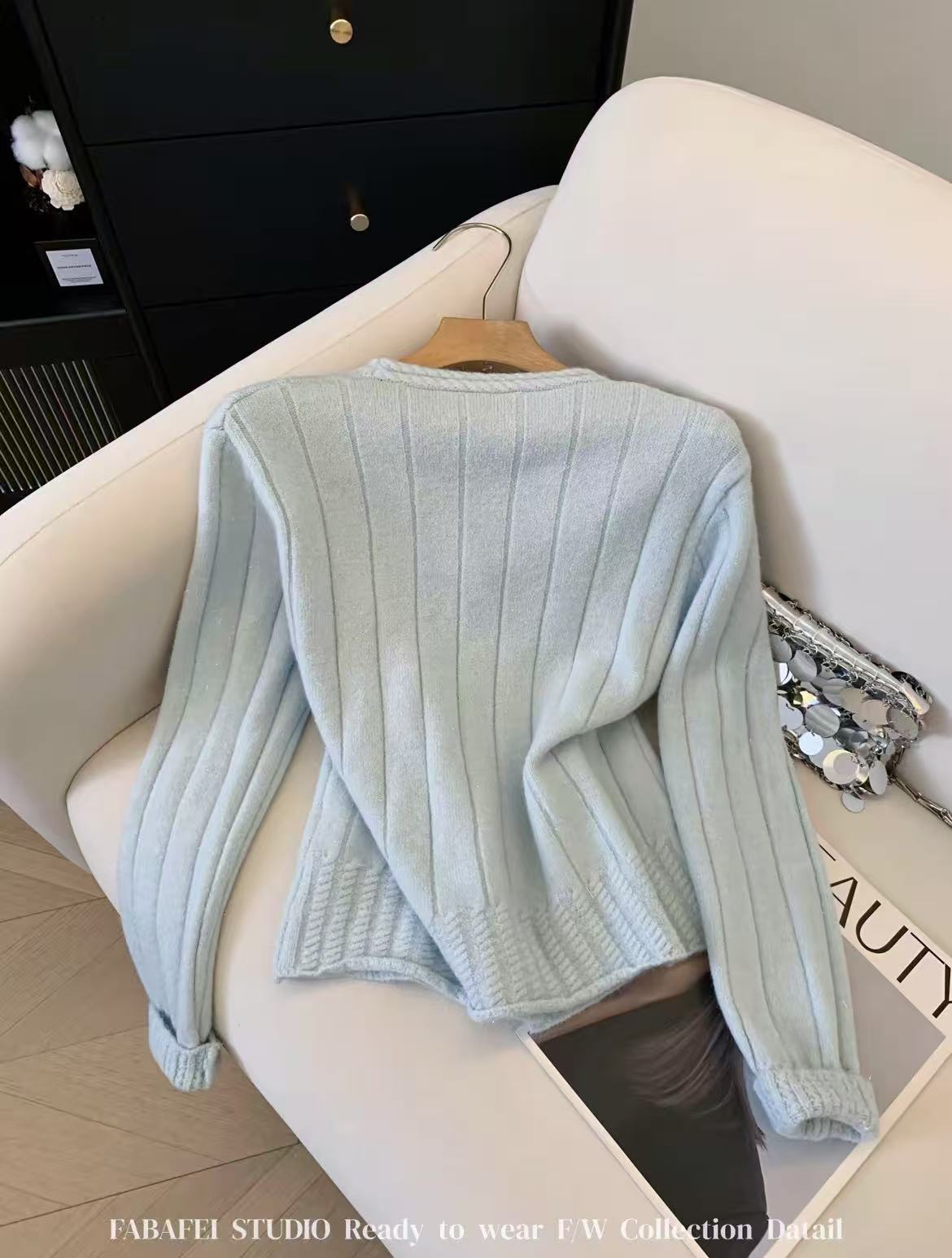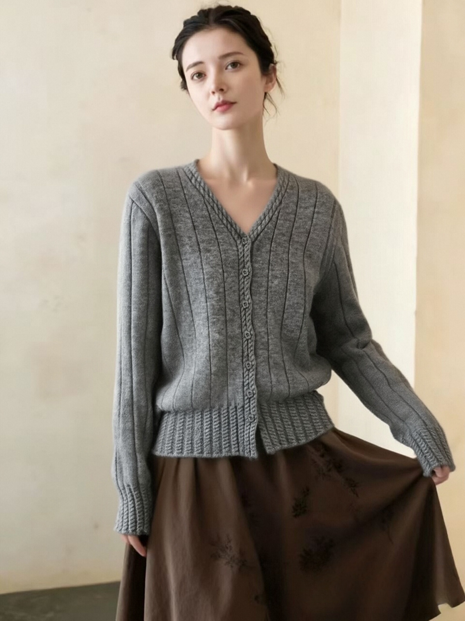 女王节抢购价-不支持退→清!不支持退货【自营】跨年福利-【超美毛衣】星空银丝款~Z094韩系花朵扣麻花下摆V领开衫毛衣-喜出