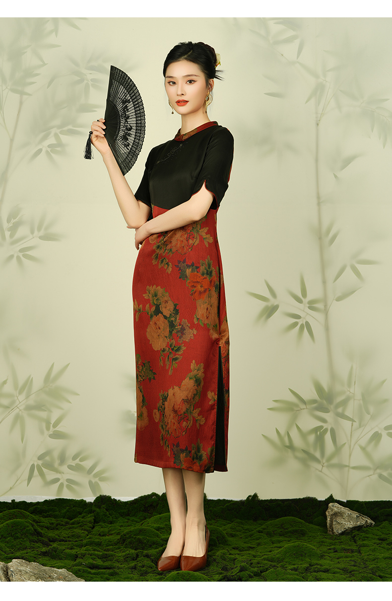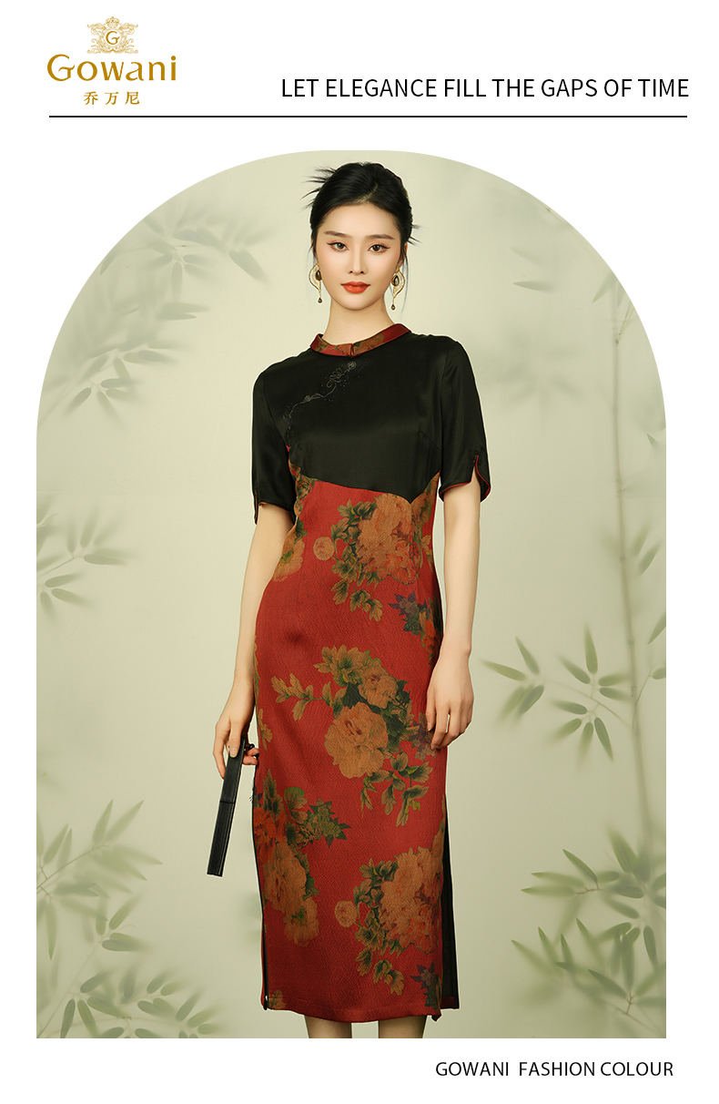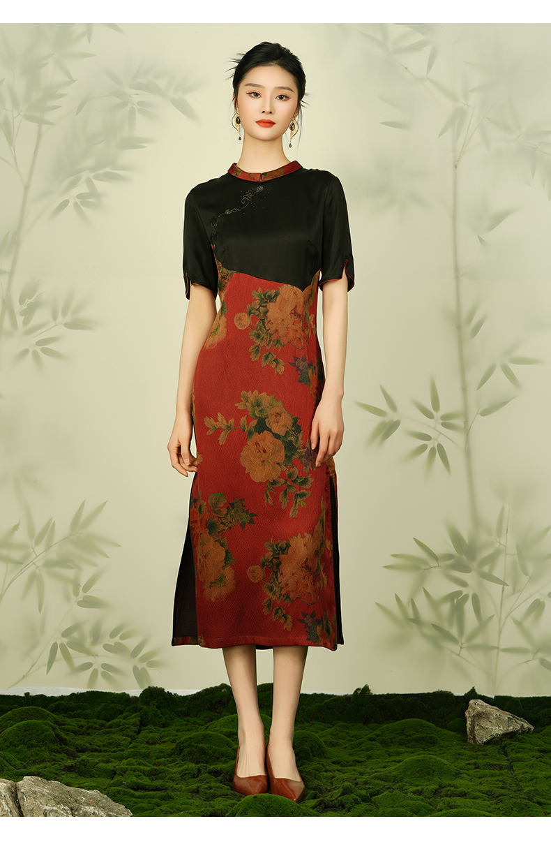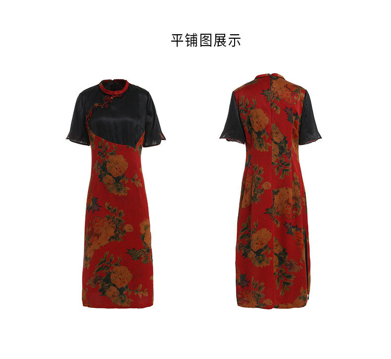 【红色复古花】【香云纱】乔万尼新款夏装重磅真丝连衣裙拼接复古印花桑蚕丝长裙ES2E123