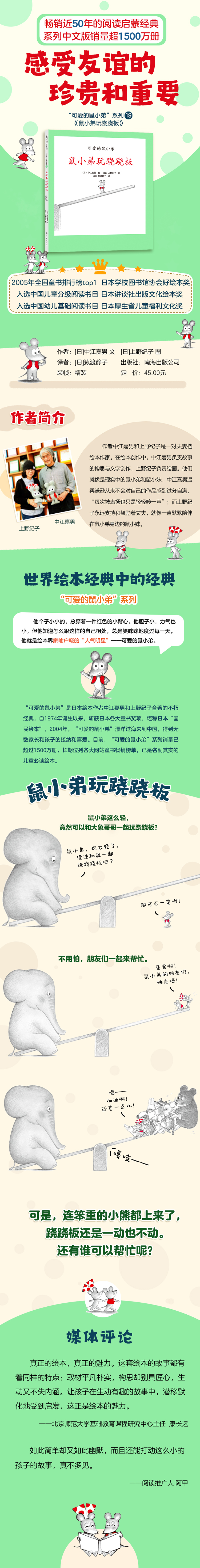“可爱的鼠小弟”系列是日本绘本作者中江嘉男和上野纪子合著的不朽经典,自1974年诞生以来,斩获日本各大童书奖项——日本学校图书馆协会好绘本奖、日本产经儿童出版文化奖、日本讲谈社出版文化绘本奖、日本厚生省儿童福利文化奖,堪称日本“国民绘本”。