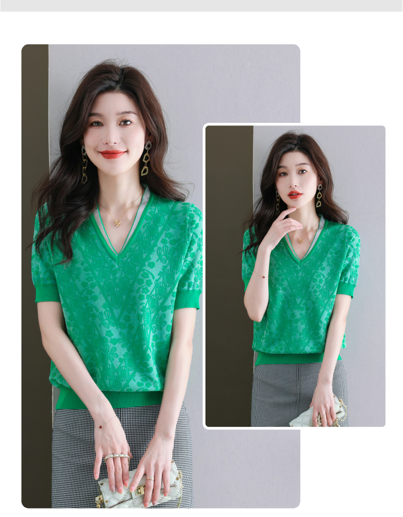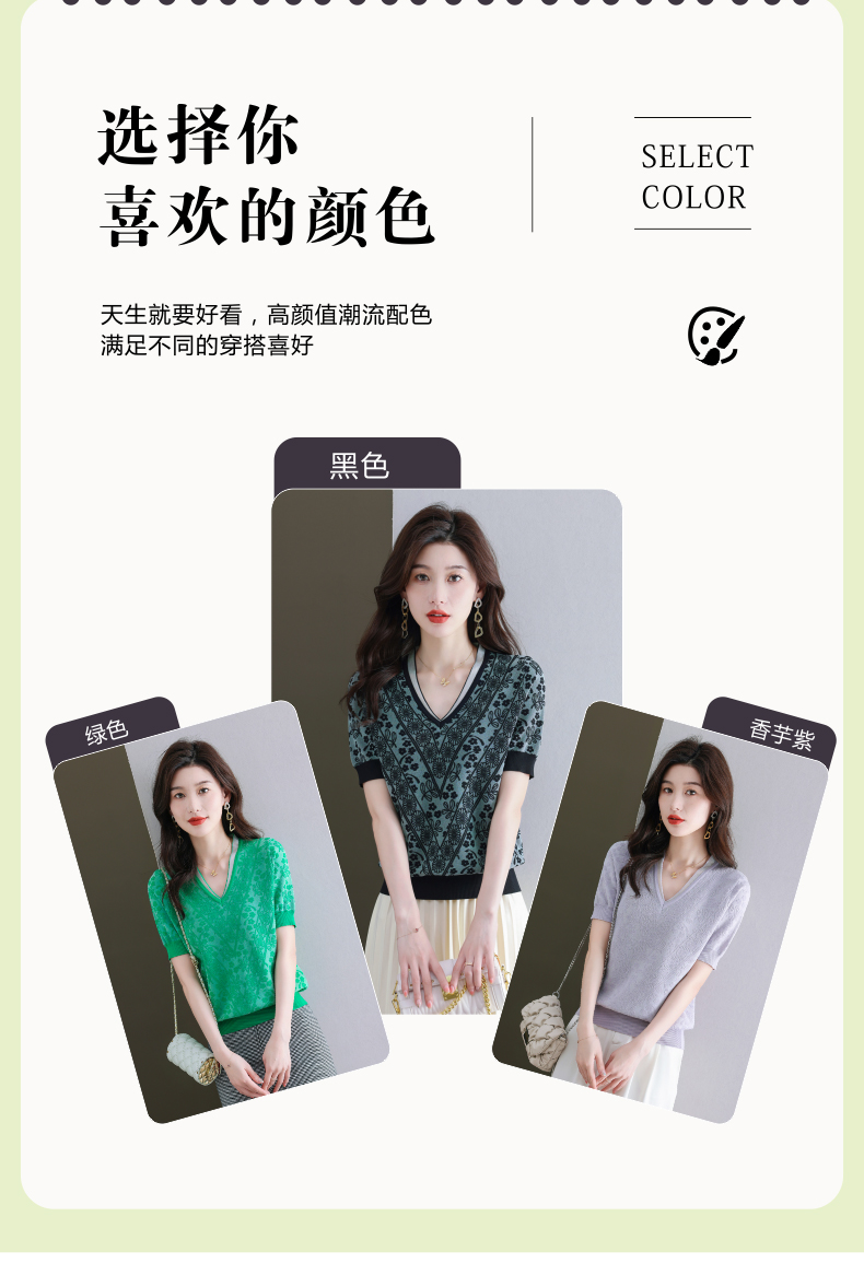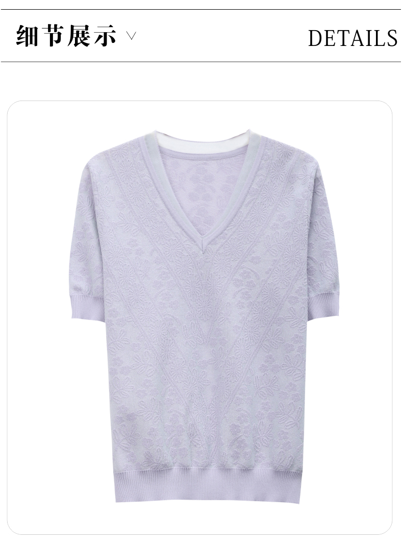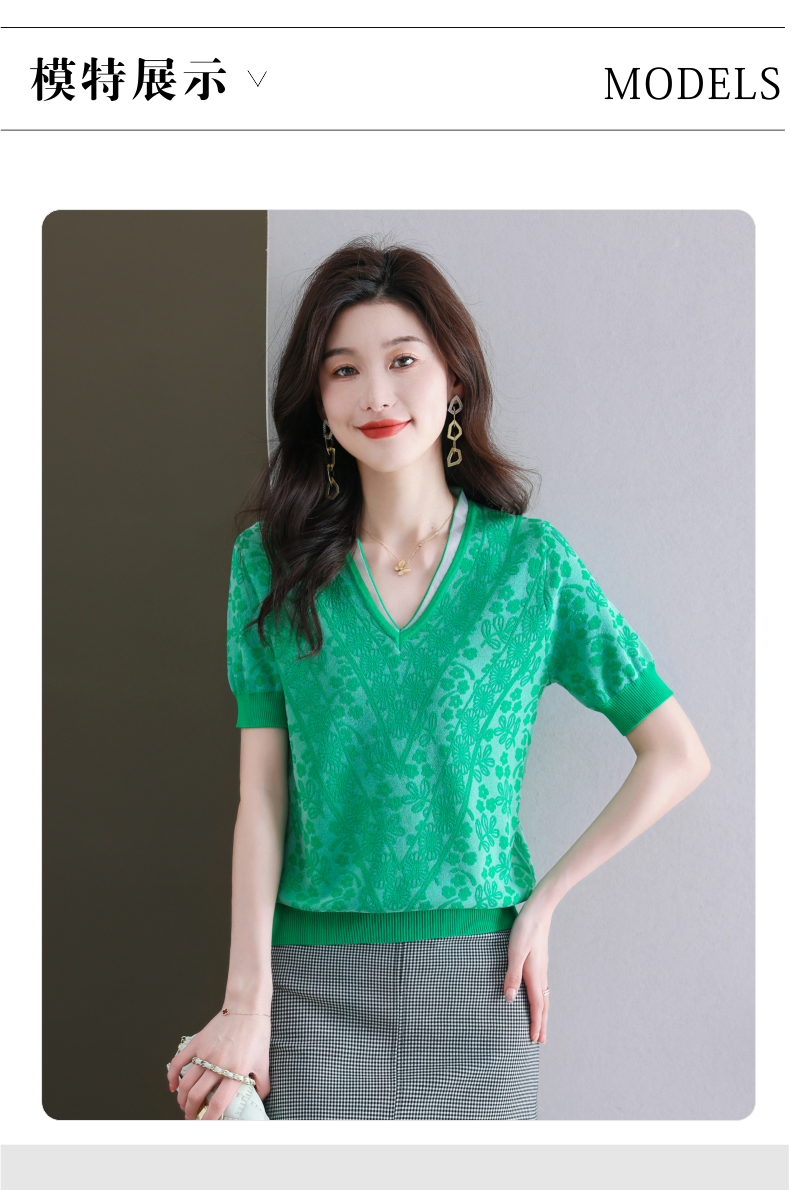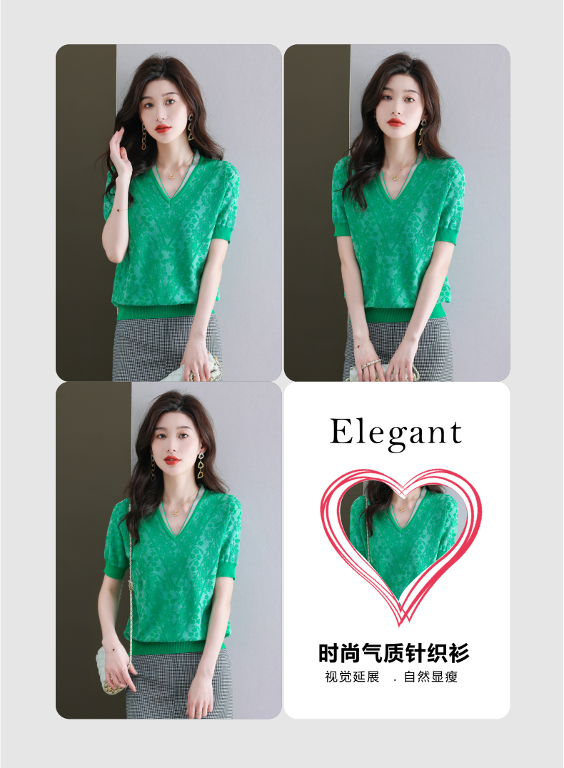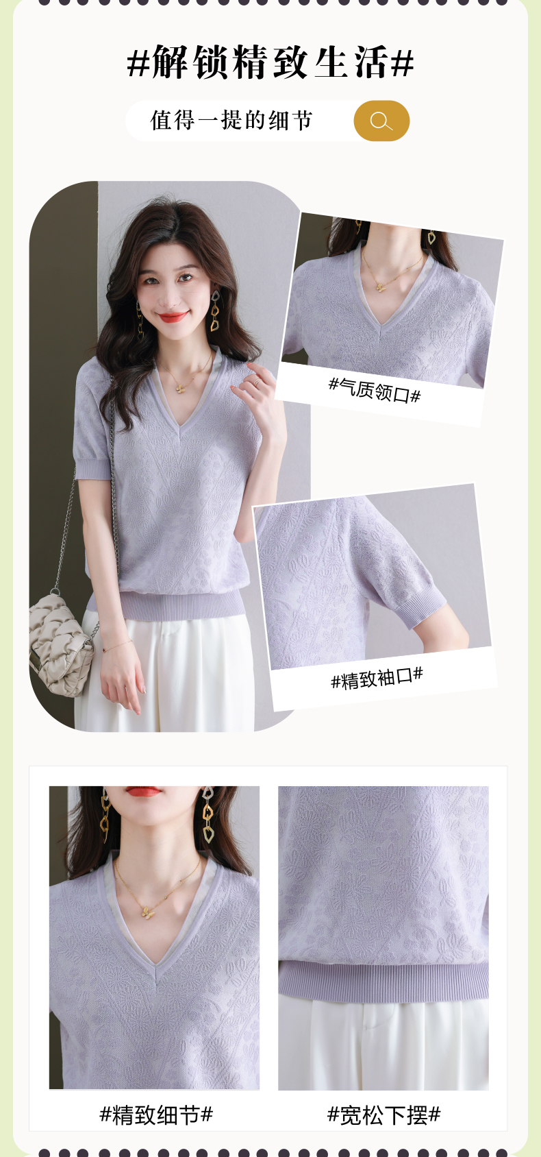 夏装新款,V领冰丝短袖t恤女半袖上衣薄款针织衫洋气蕾丝小衫CC-89-5151