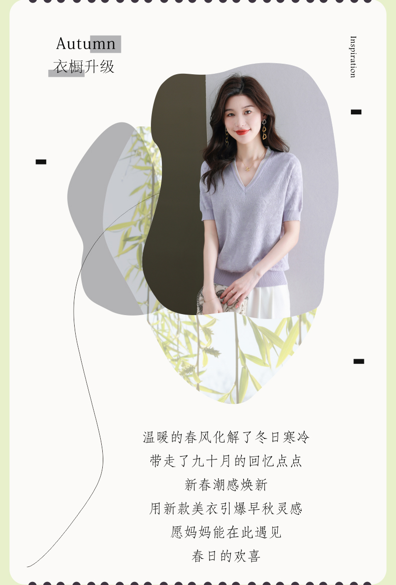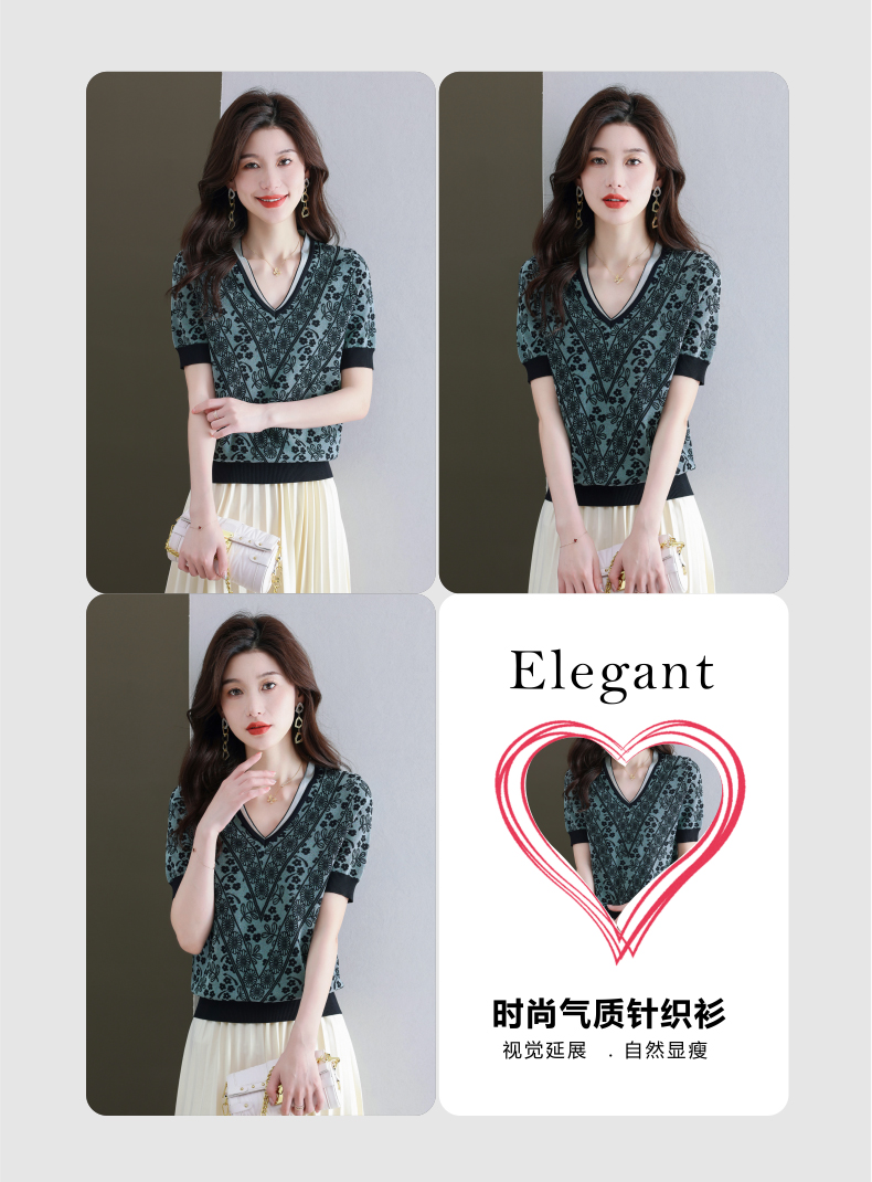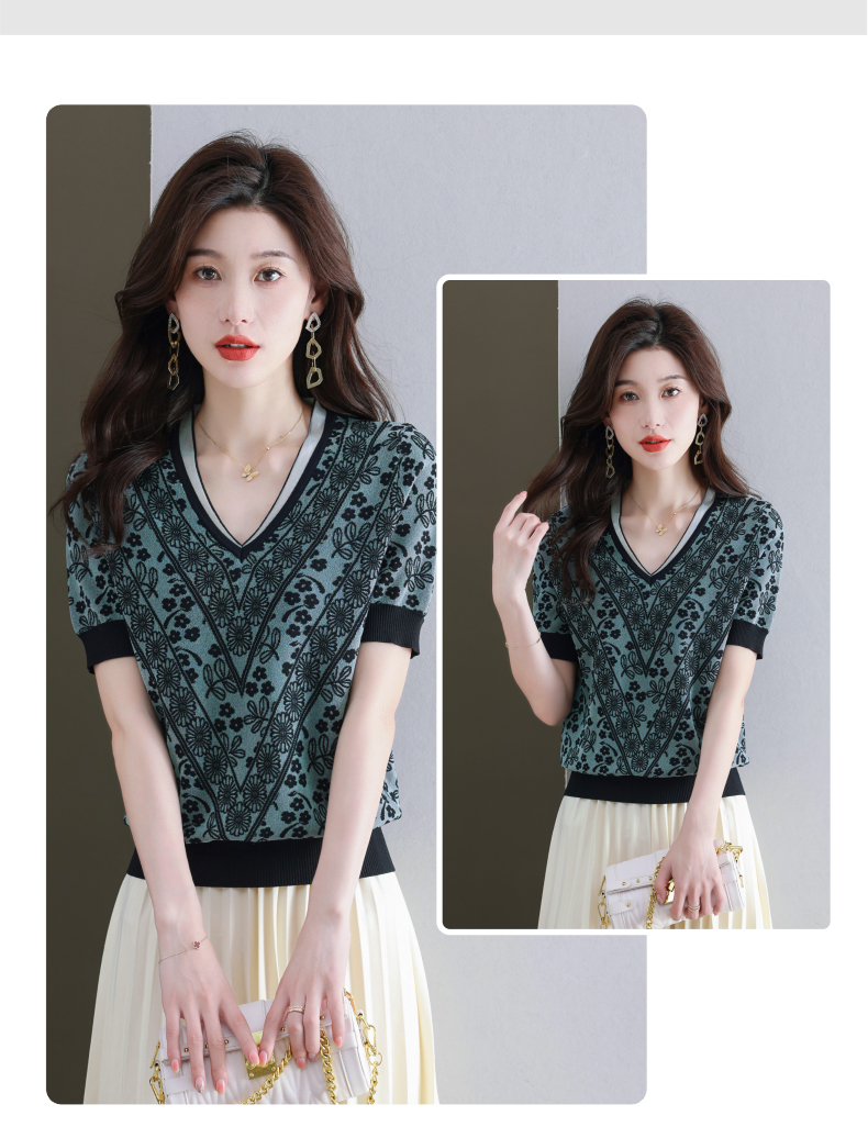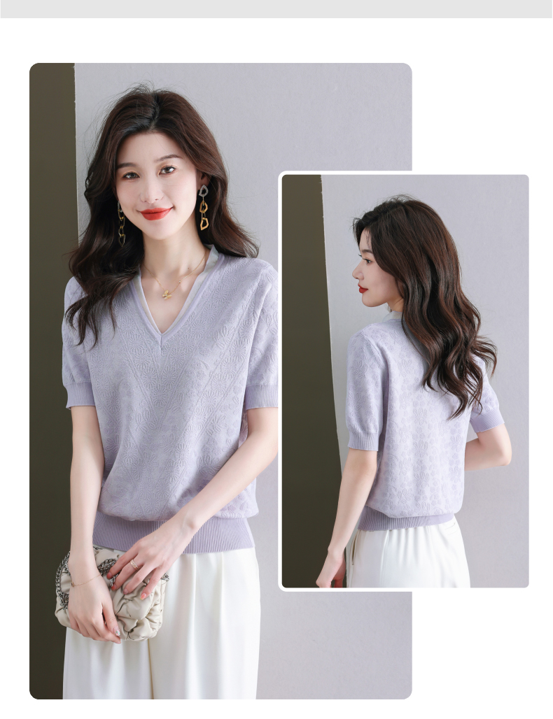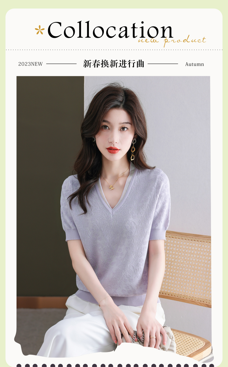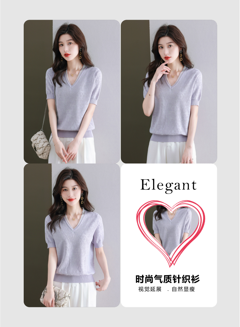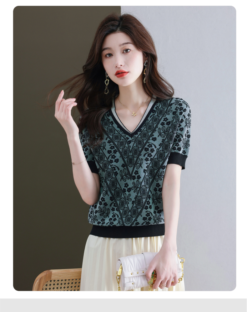 夏装新款,V领冰丝短袖t恤女半袖上衣薄款针织衫洋气蕾丝小衫CC-89-5151