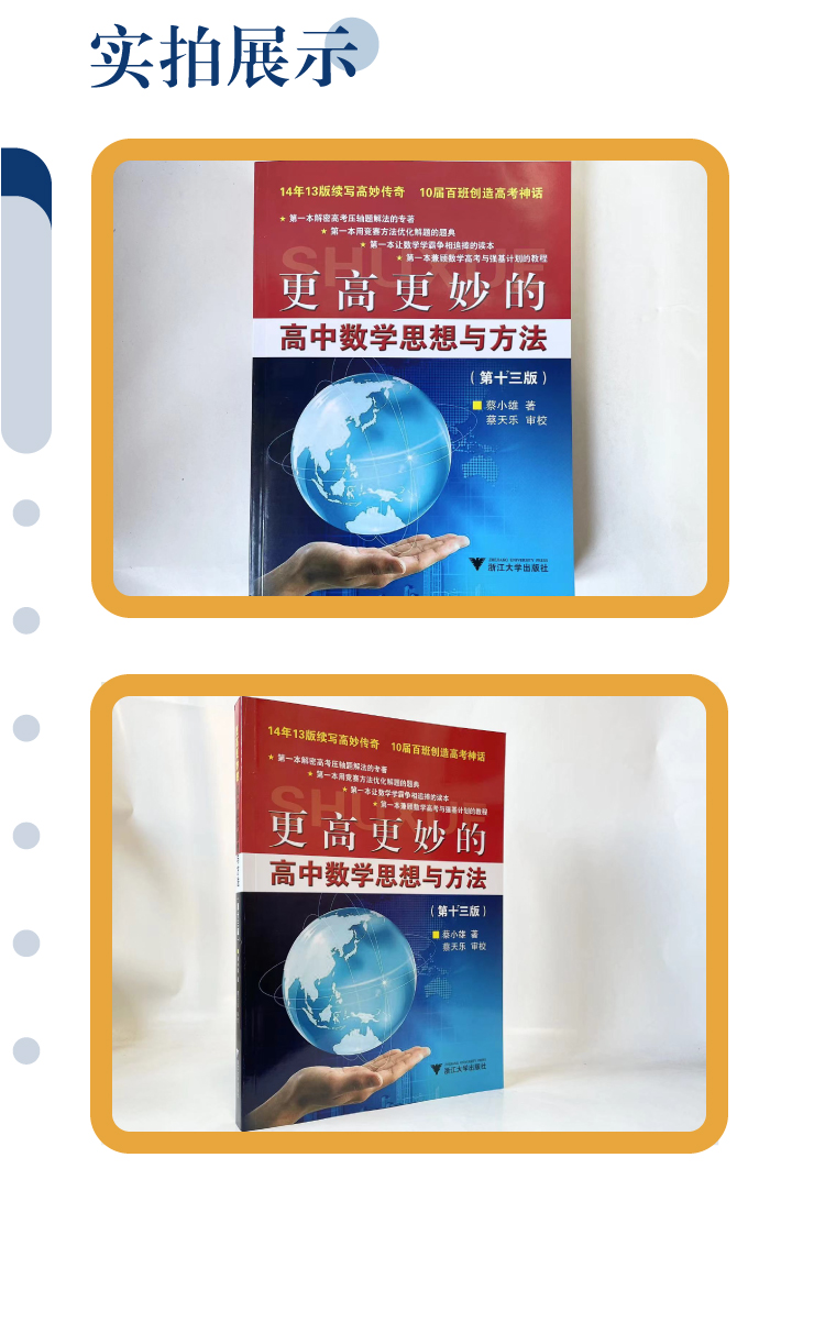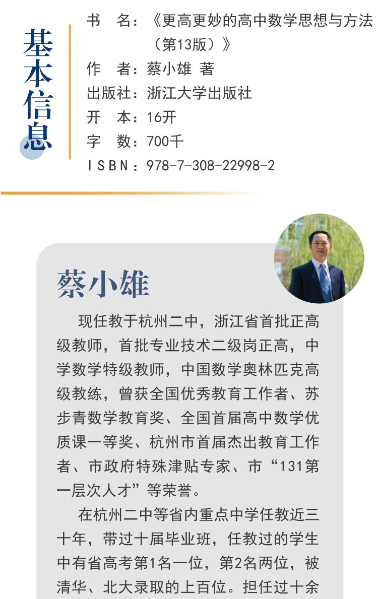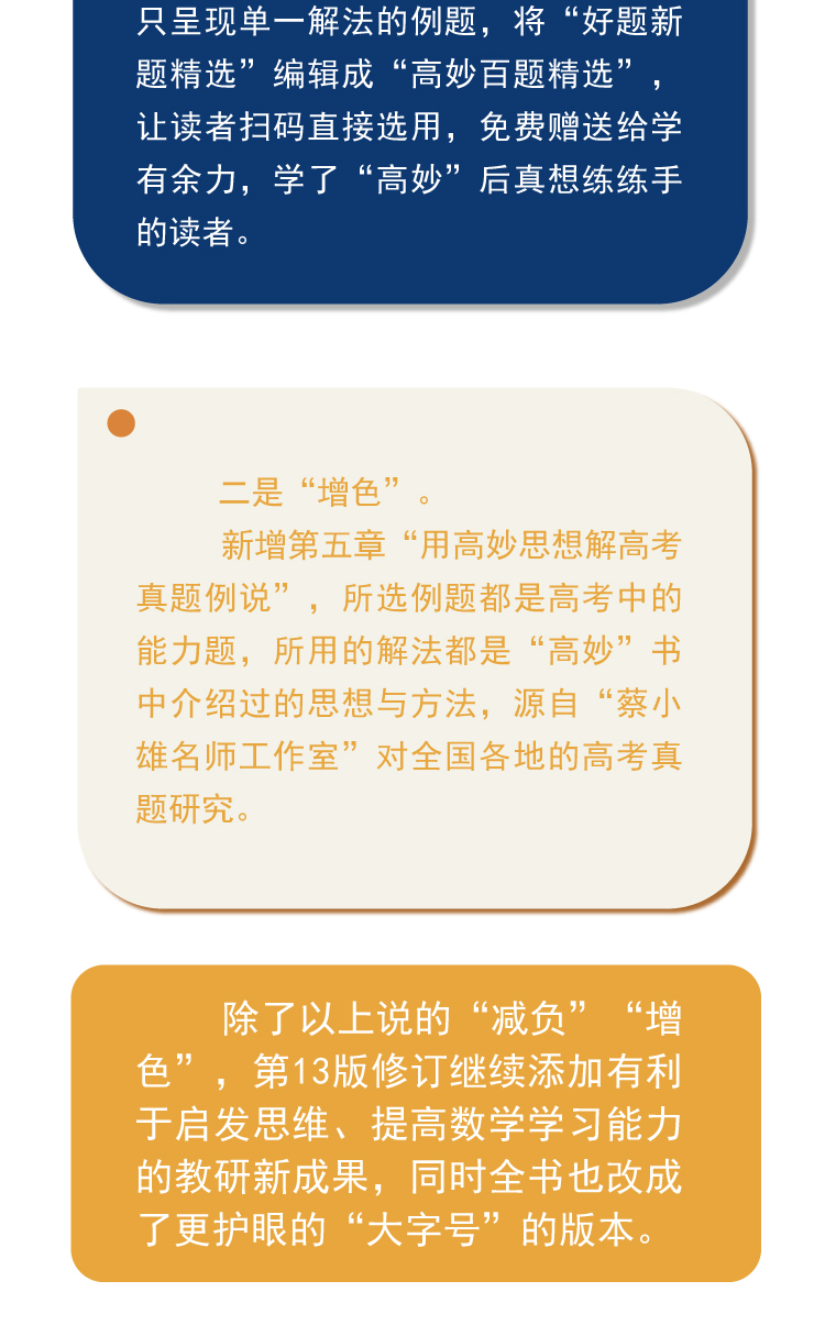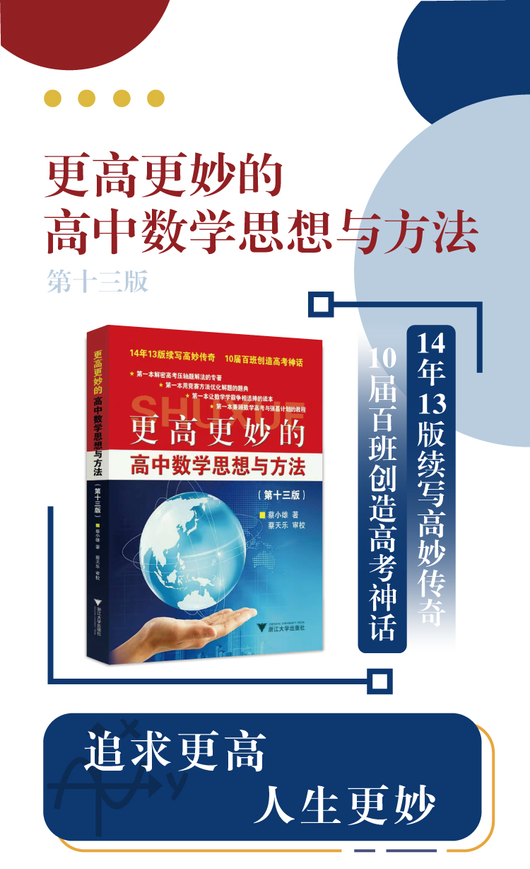 二是“增色”. 新增第五章“用高妙思想解高考真题例说”,所选例题都是高考中的能力题,所用的解法都是“高妙”书中介绍过的思想与方法,源自“蔡小雄名师工作室”对全国各地的高考真题研究.