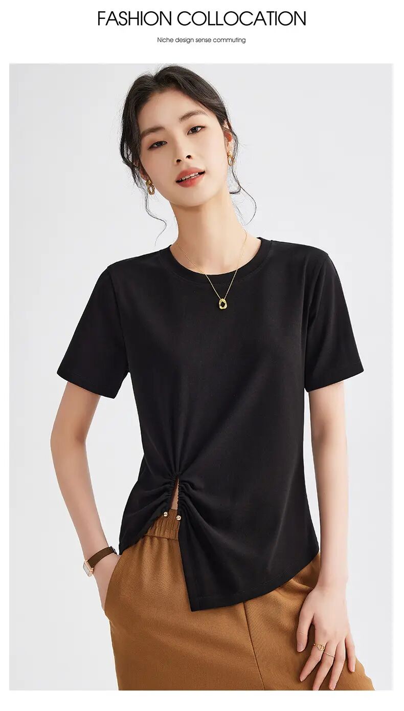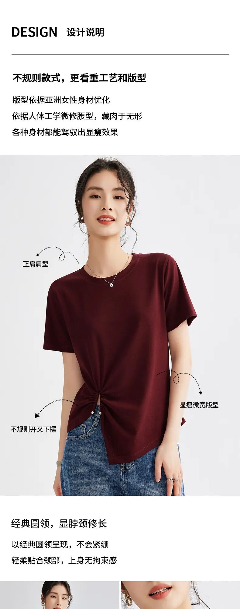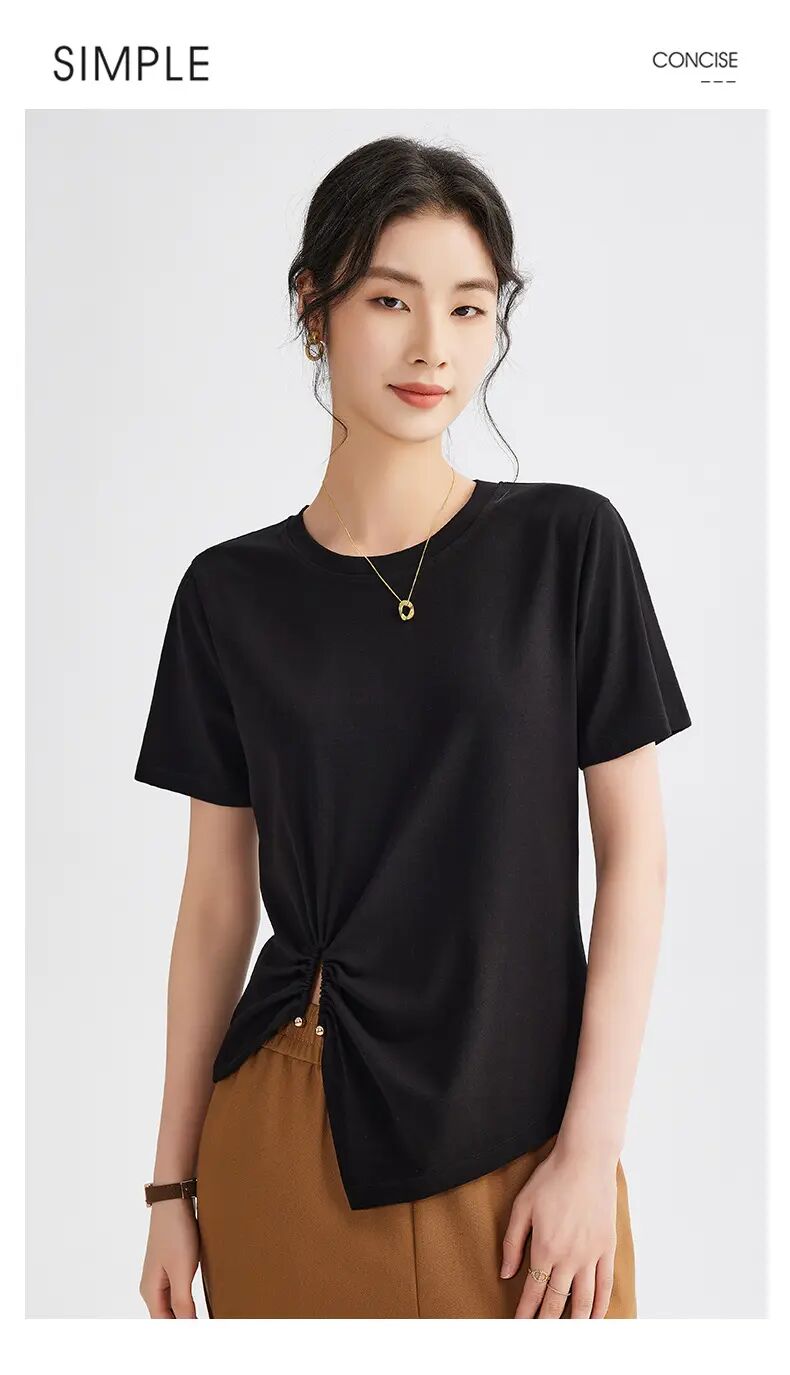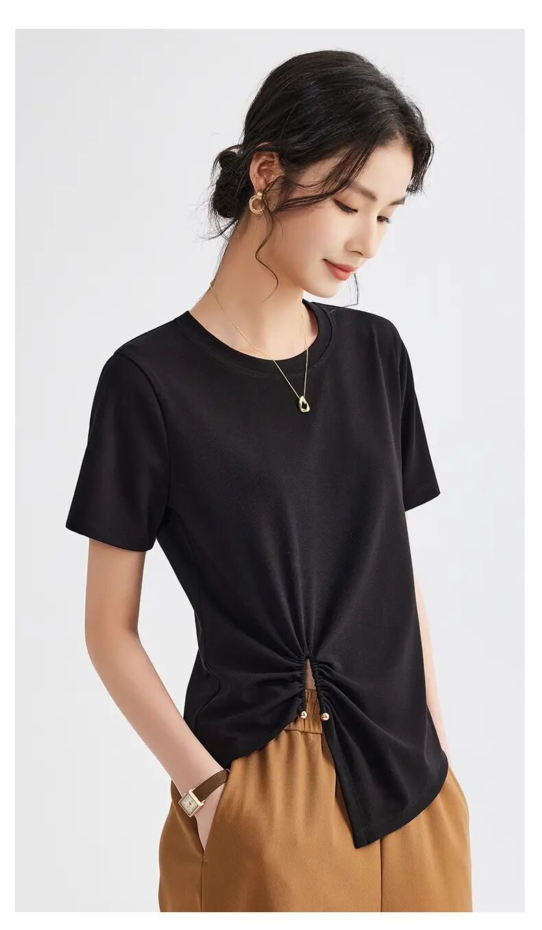 【自】全新升级【铂金会员100/天猫129/差价29】(82453) 洛诗琳2025春夏高级感设计小众短袖T恤不规则下摆褶皱上衣