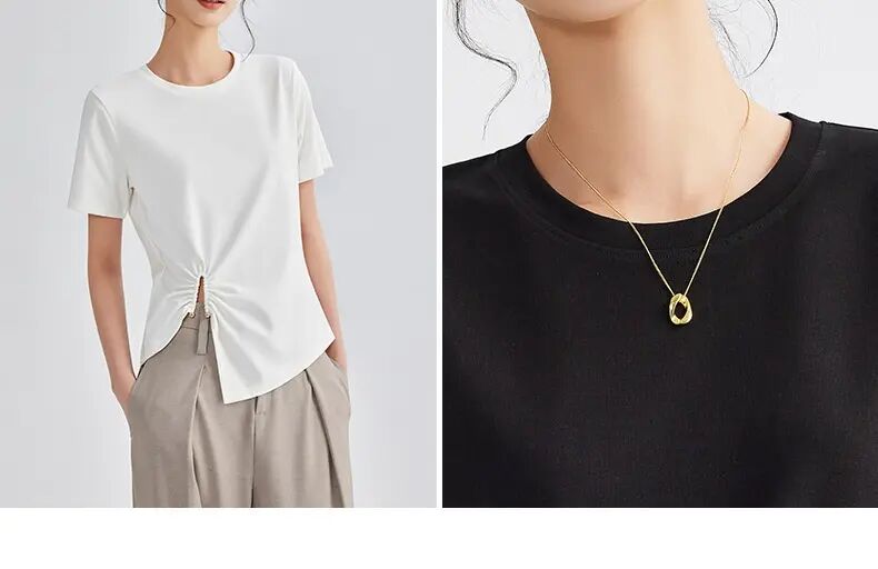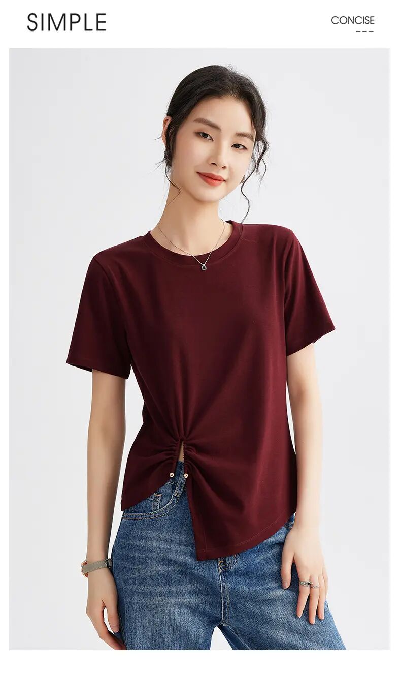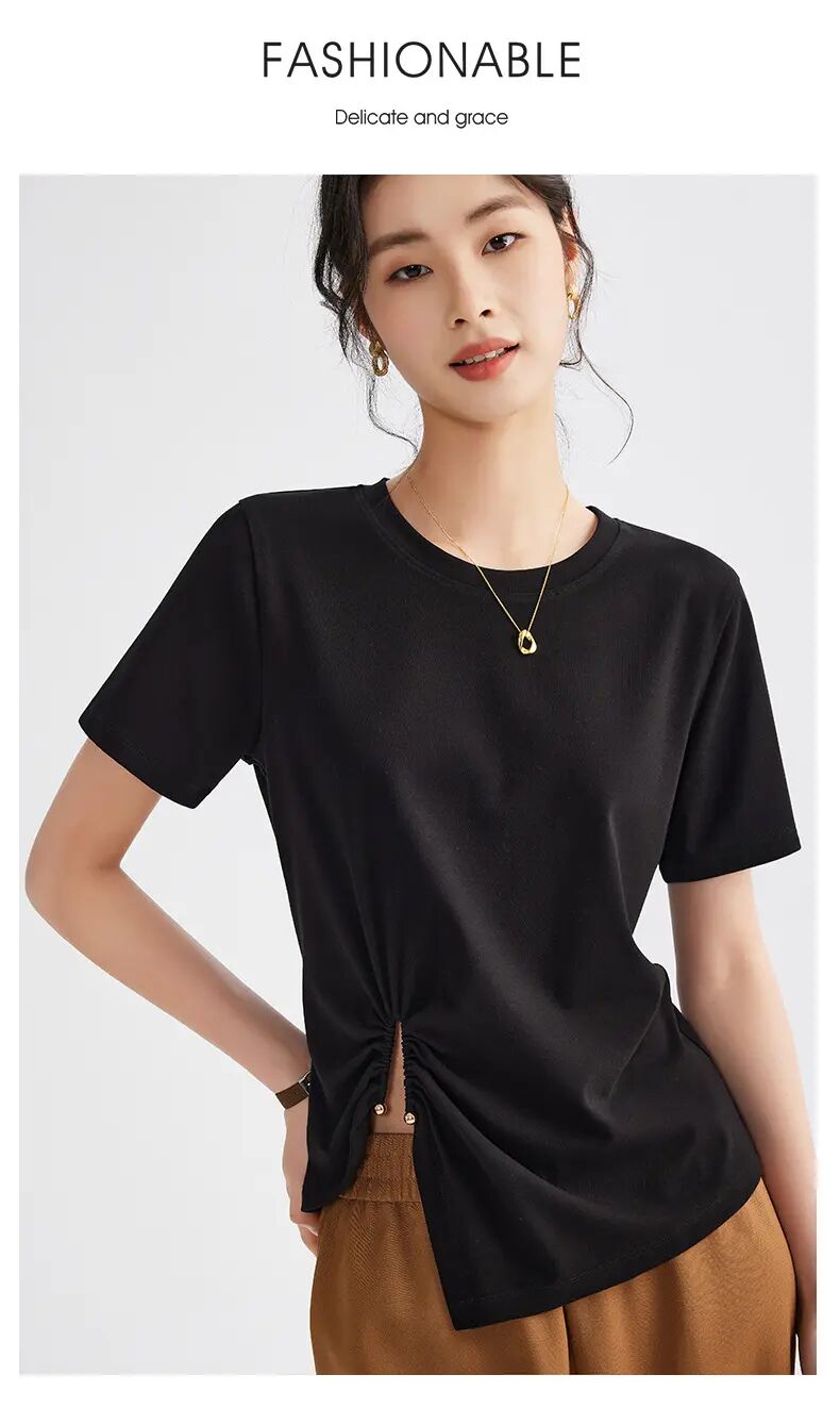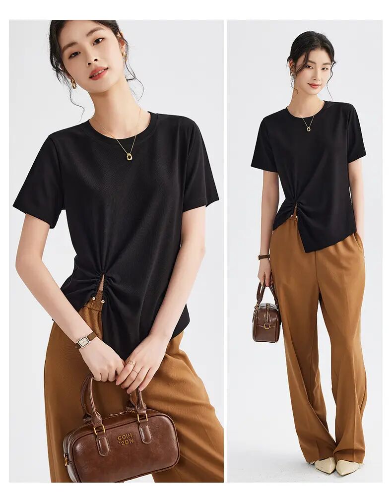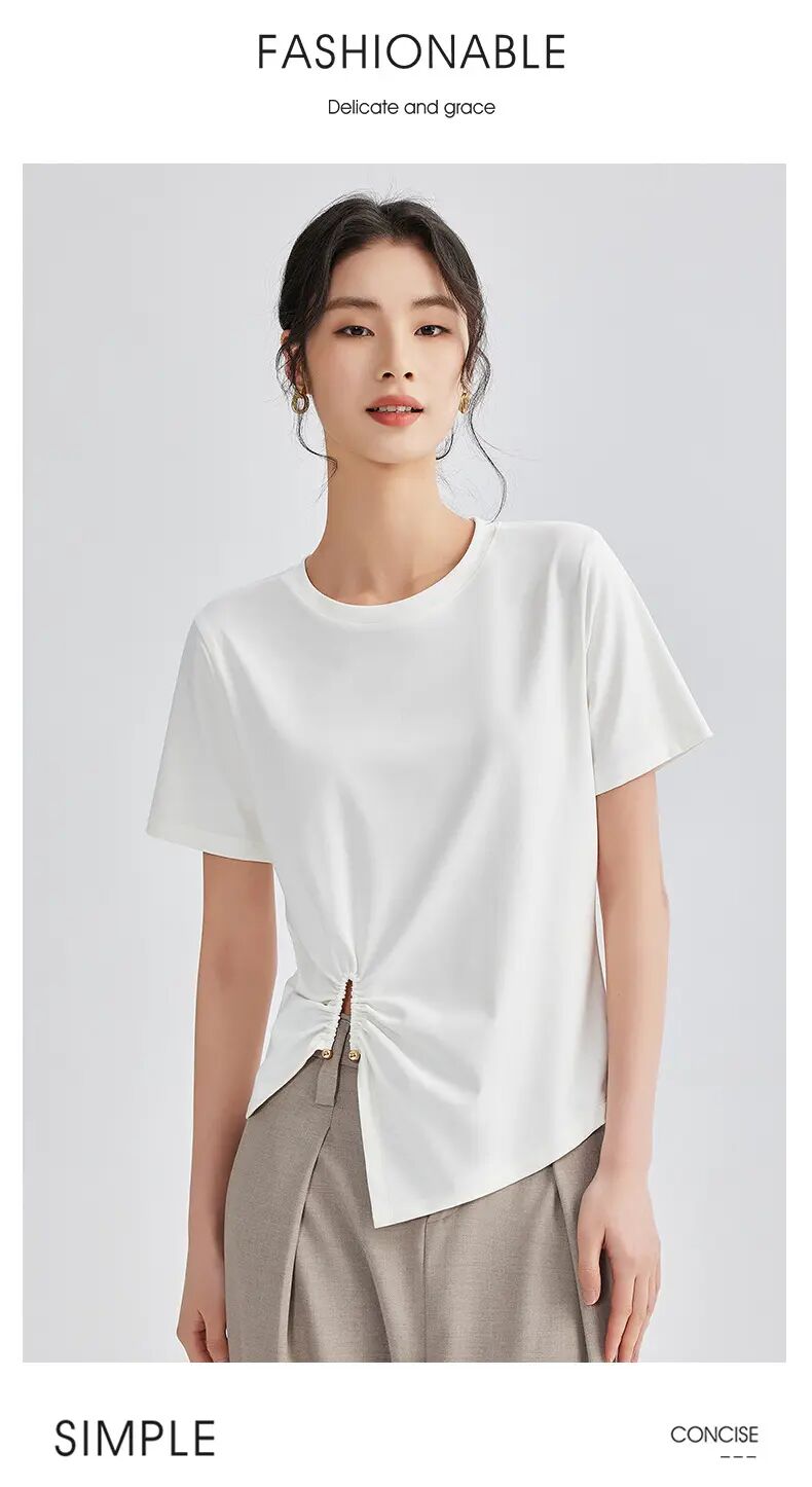 【自】全新升级【铂金会员100/天猫129/差价29】(82453) 洛诗琳2025春夏高级感设计小众短袖T恤不规则下摆褶皱上衣
