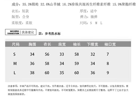 纱线:32.6%山羊绒,35.3%锦纶,16.2%珍珠共混再生纤维素纤维,15.9%聚酯纤维