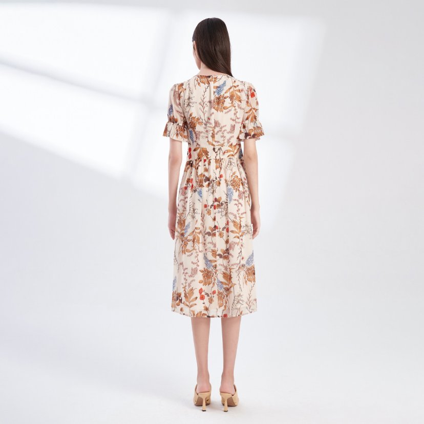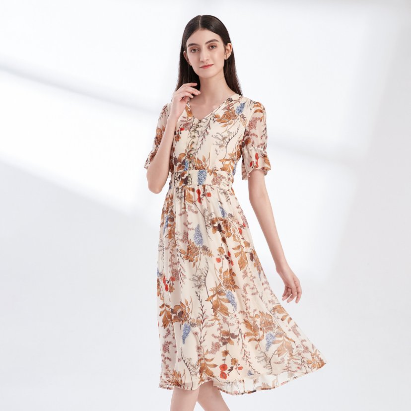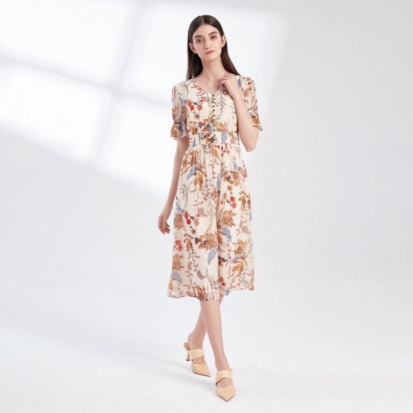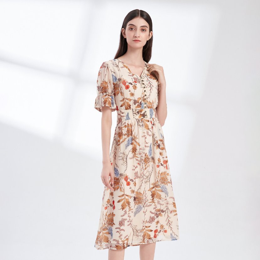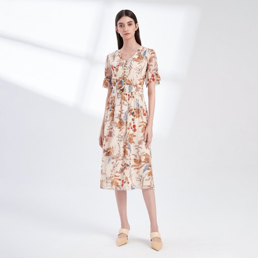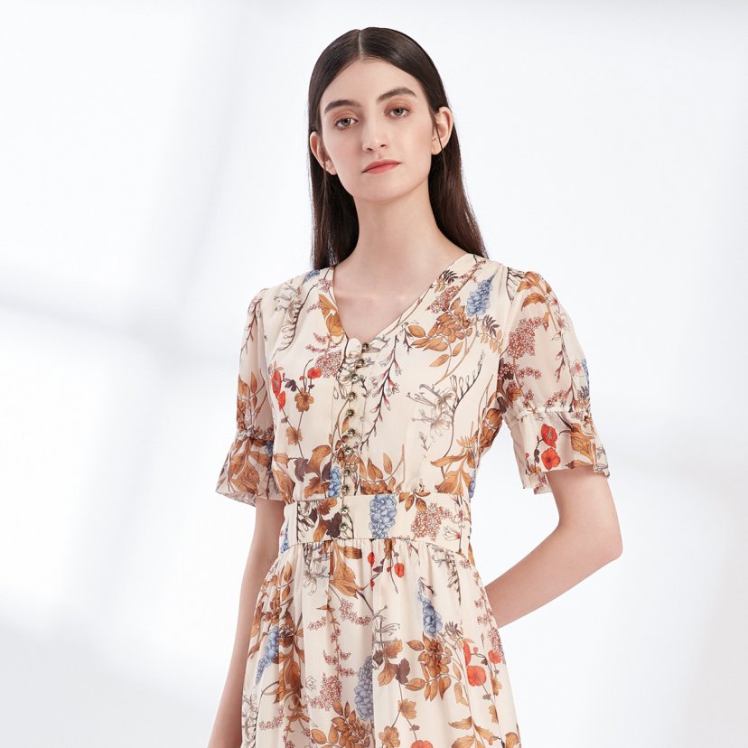 裘堤婼JETEZO 印花V领显瘦连衣裙 BA5006E