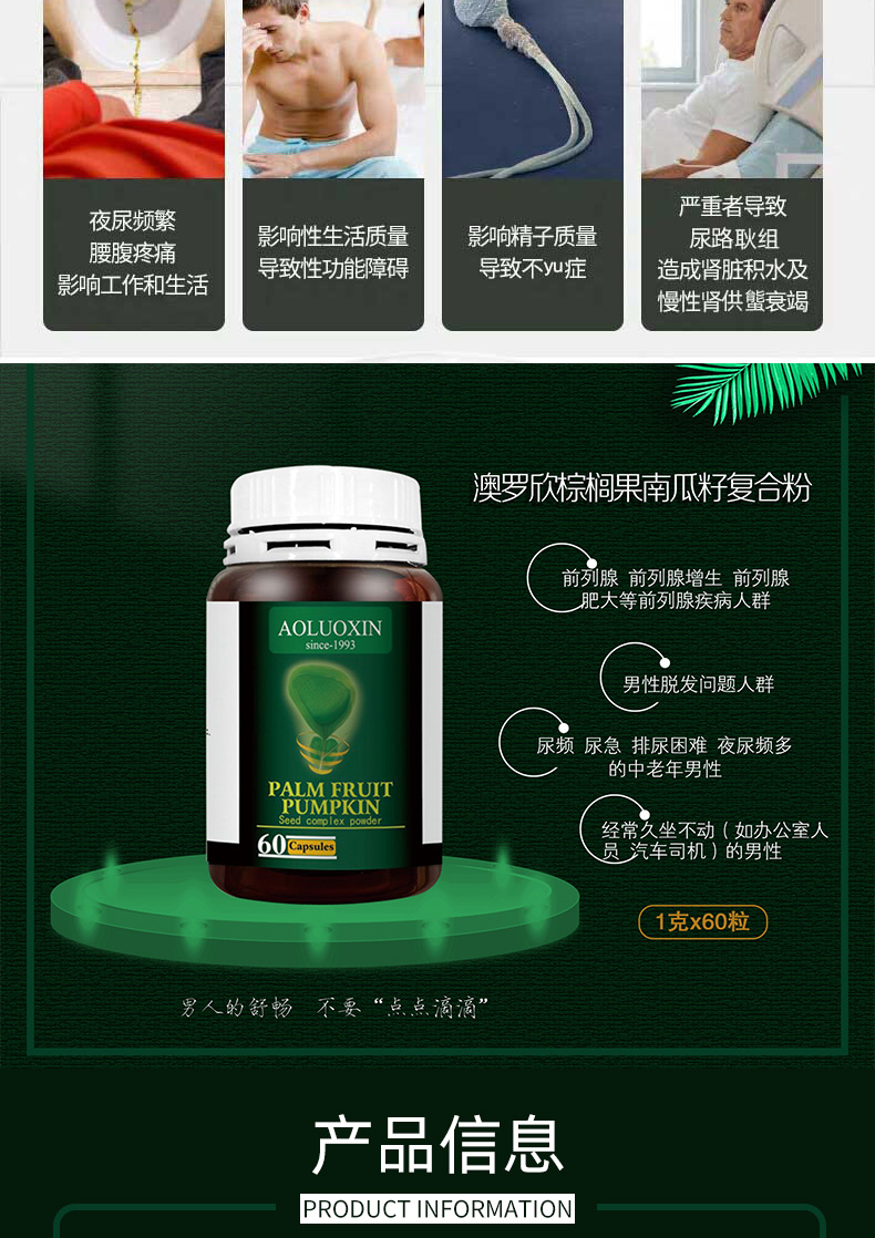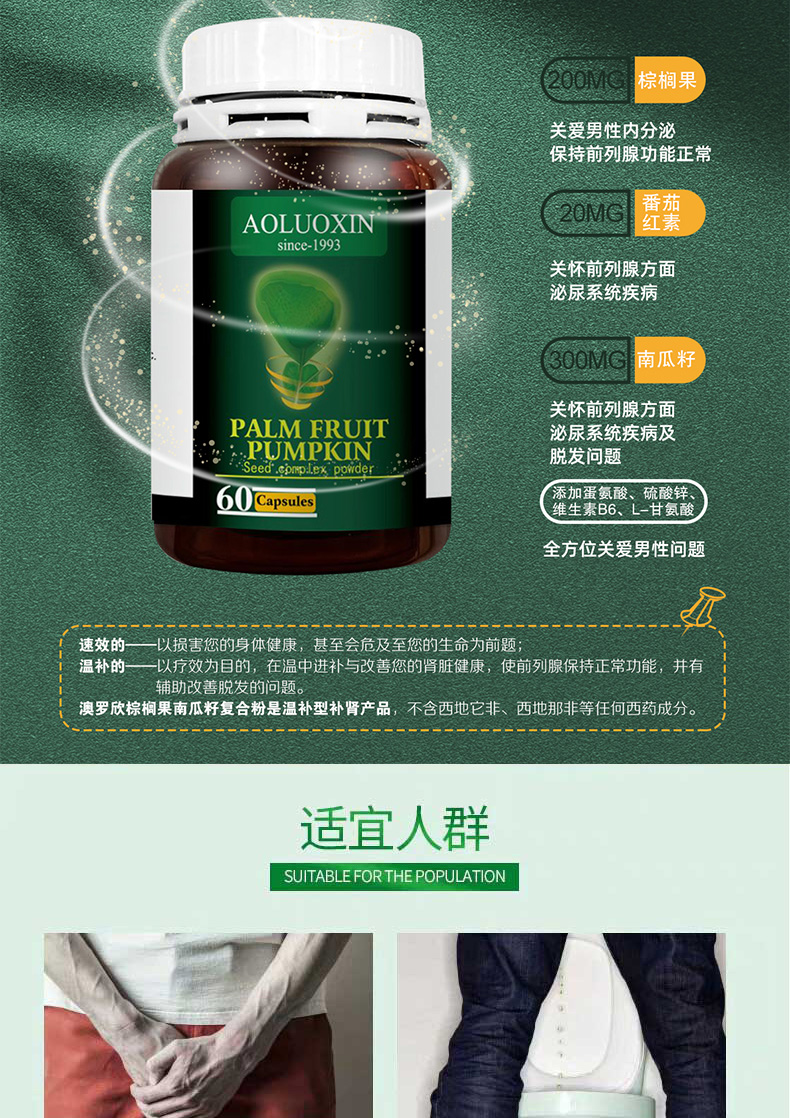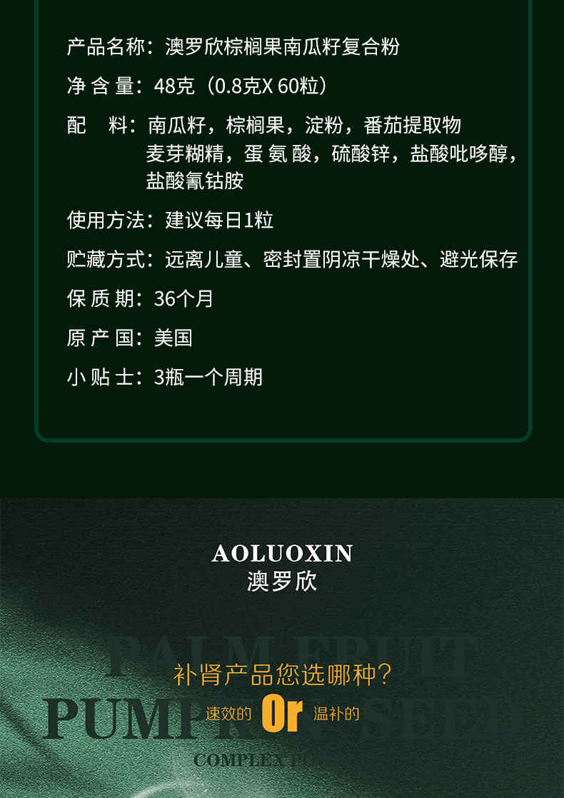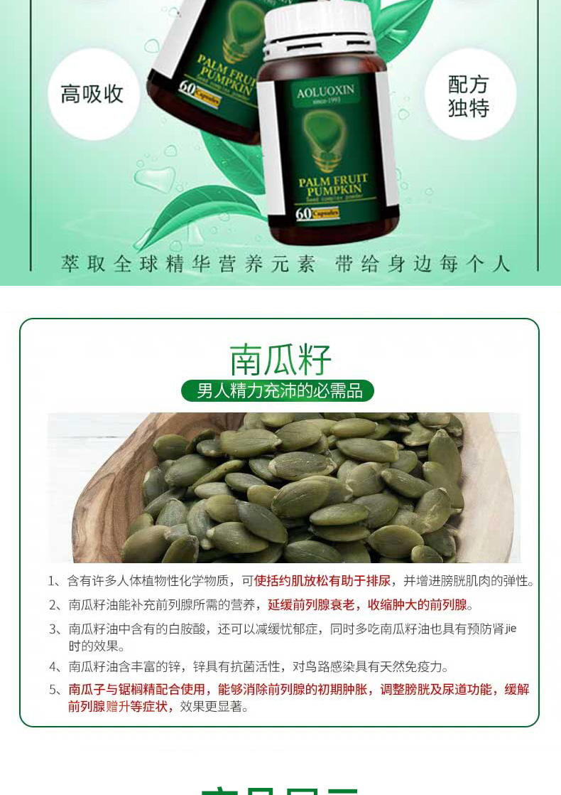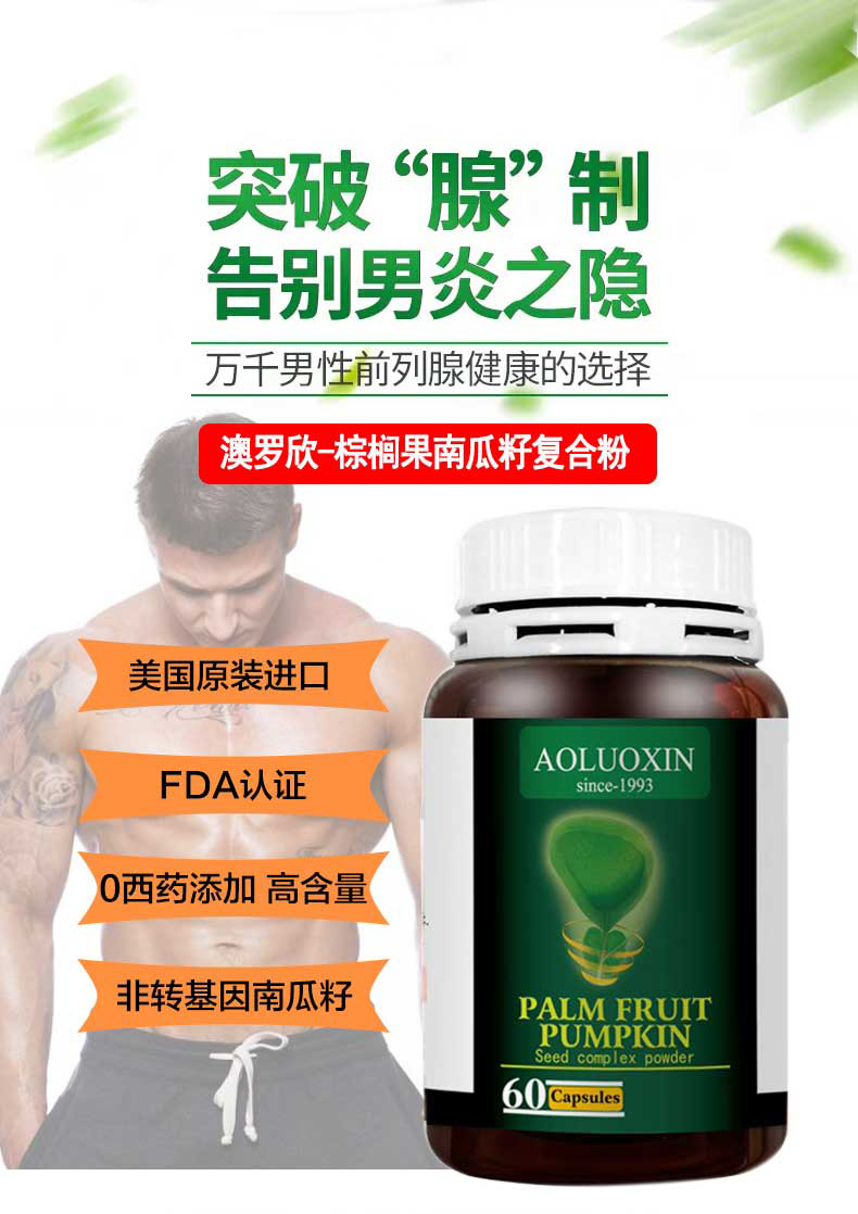 【突破腺制告别男炎之隐】美国澳罗欣棕榈果南瓜籽呵护男人前列腺番茄红素、硫酸锌60粒/瓶