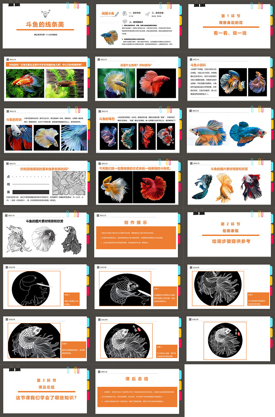 1、观察斗鱼的的形状、纹理,表现斗鱼的造型美和线条美。