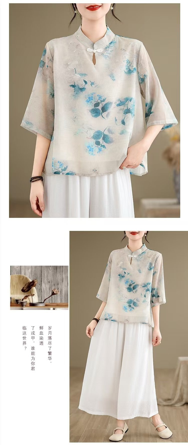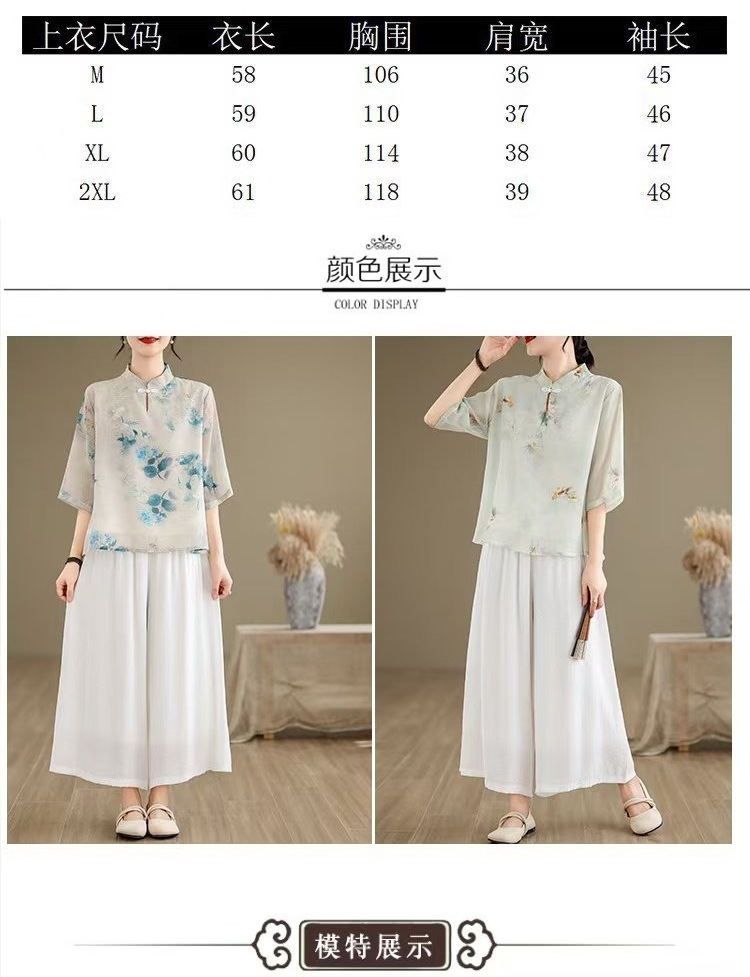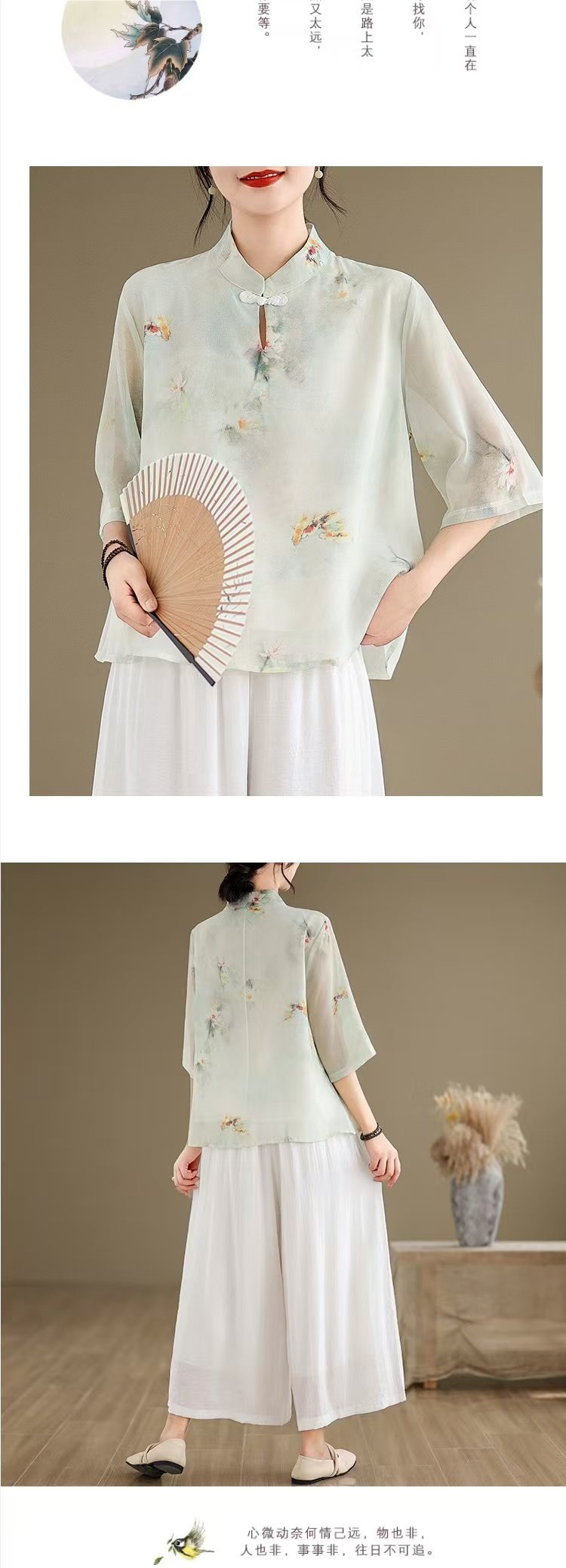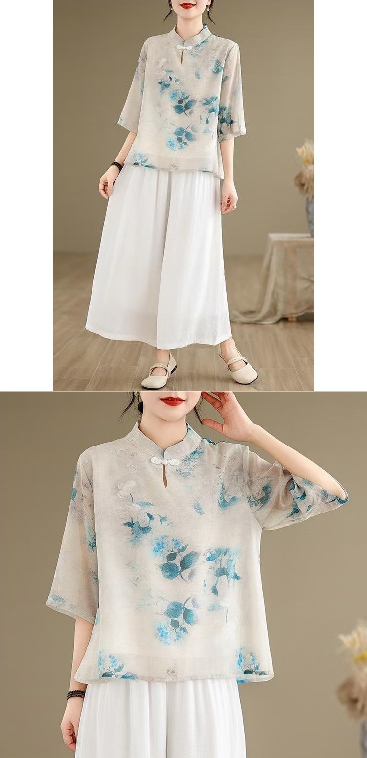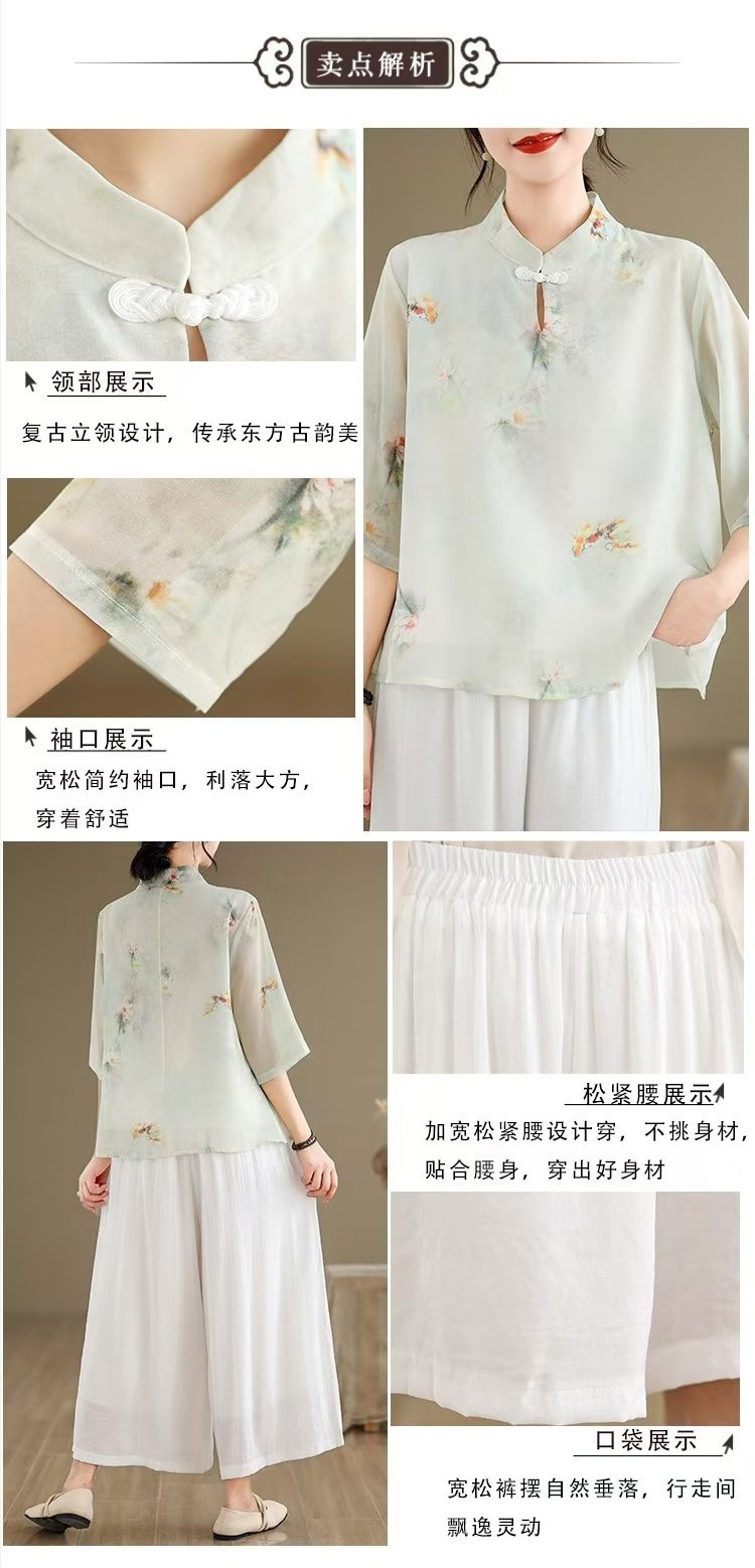 WY961新中式中国风水墨印花中袖衬衫文艺旗袍领复古日常禅意汉服衬衣女