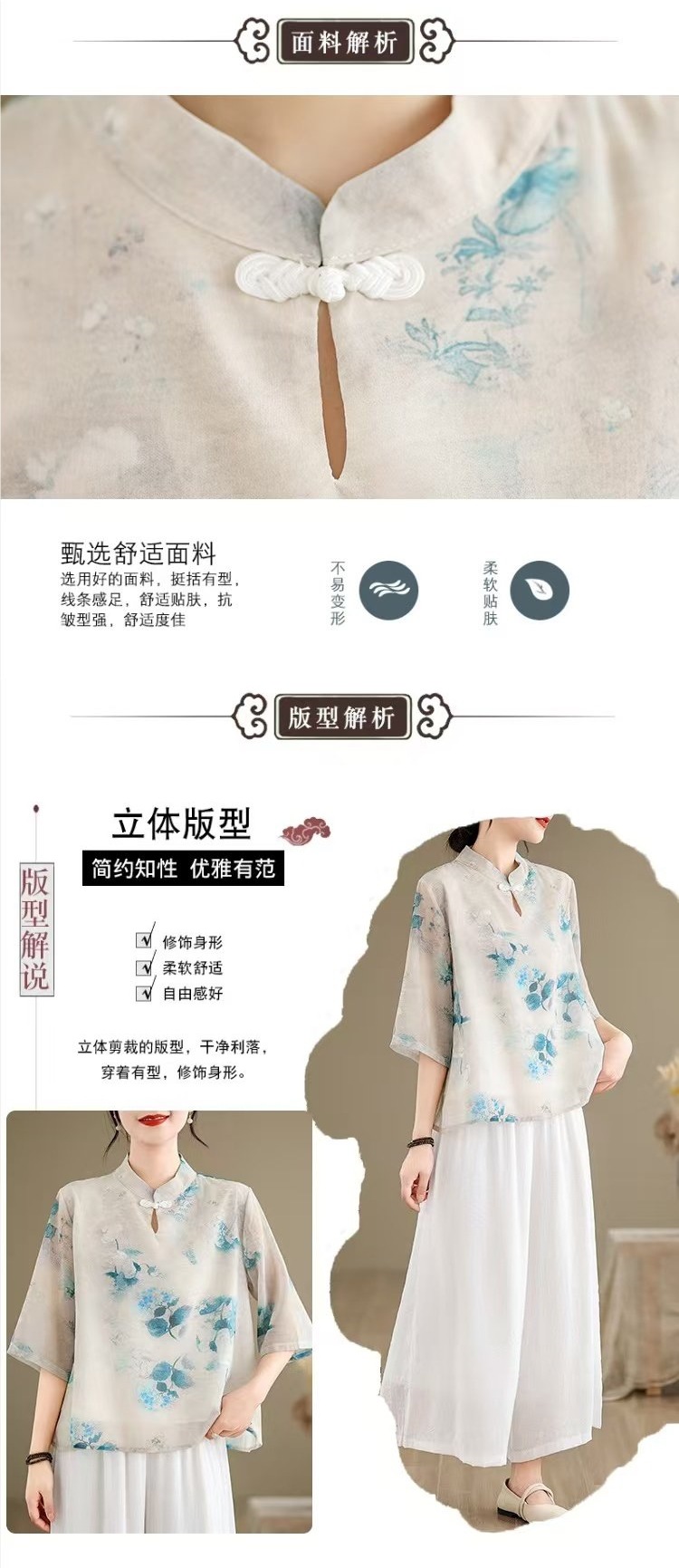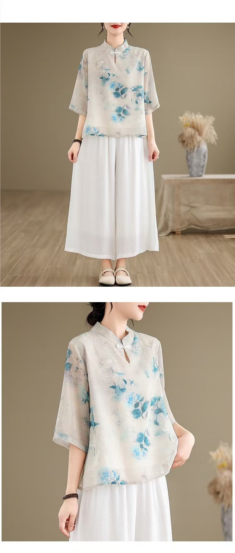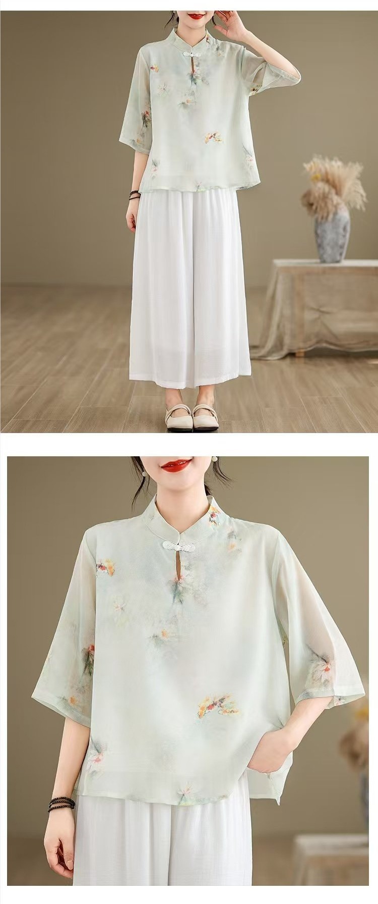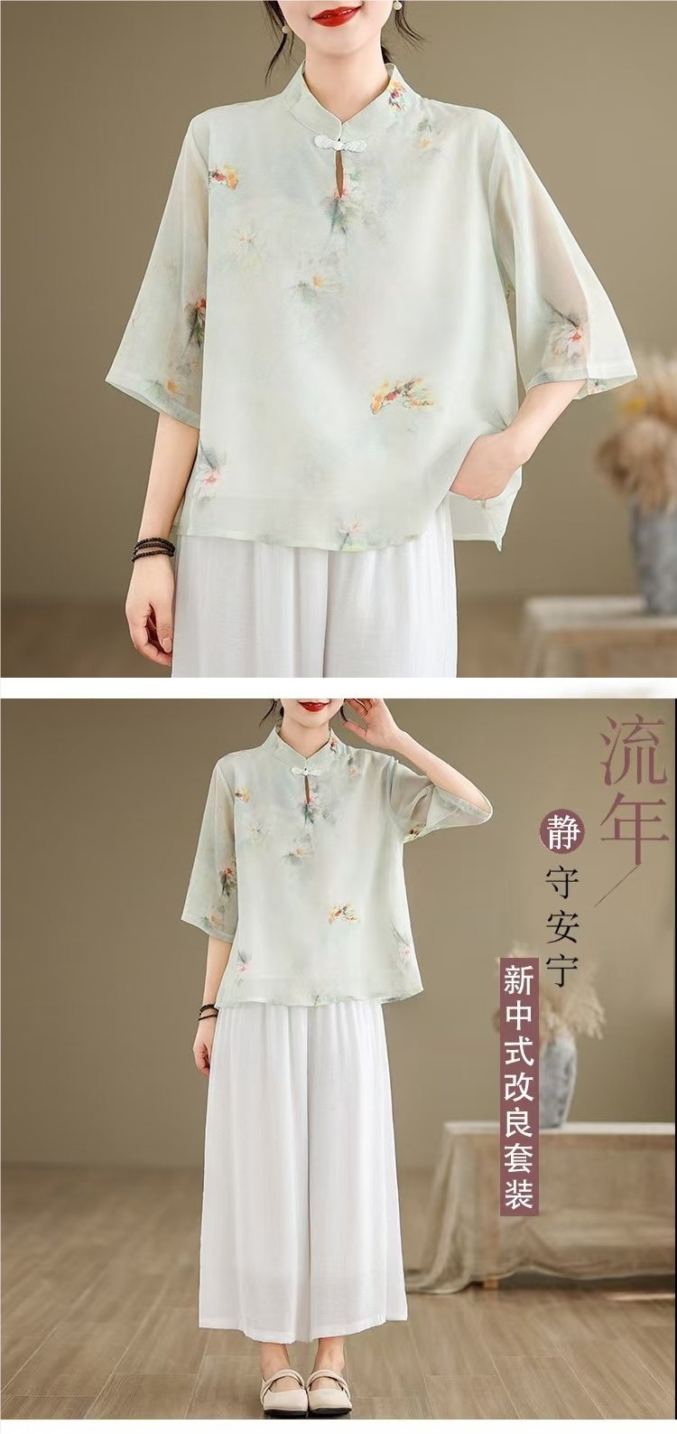 WY961新中式中国风水墨印花中袖衬衫文艺旗袍领复古日常禅意汉服衬衣女