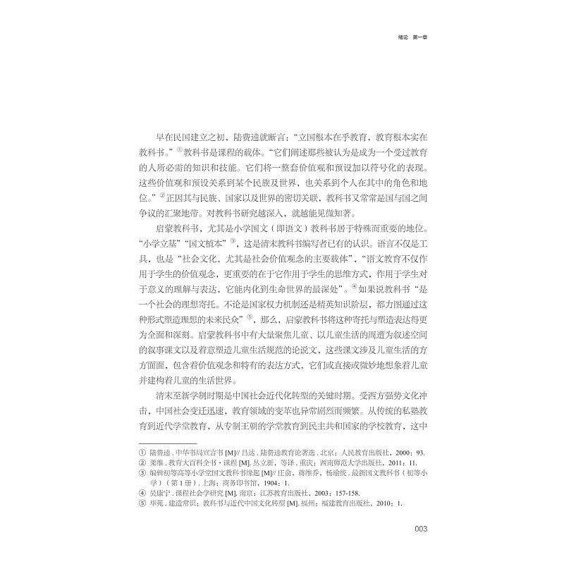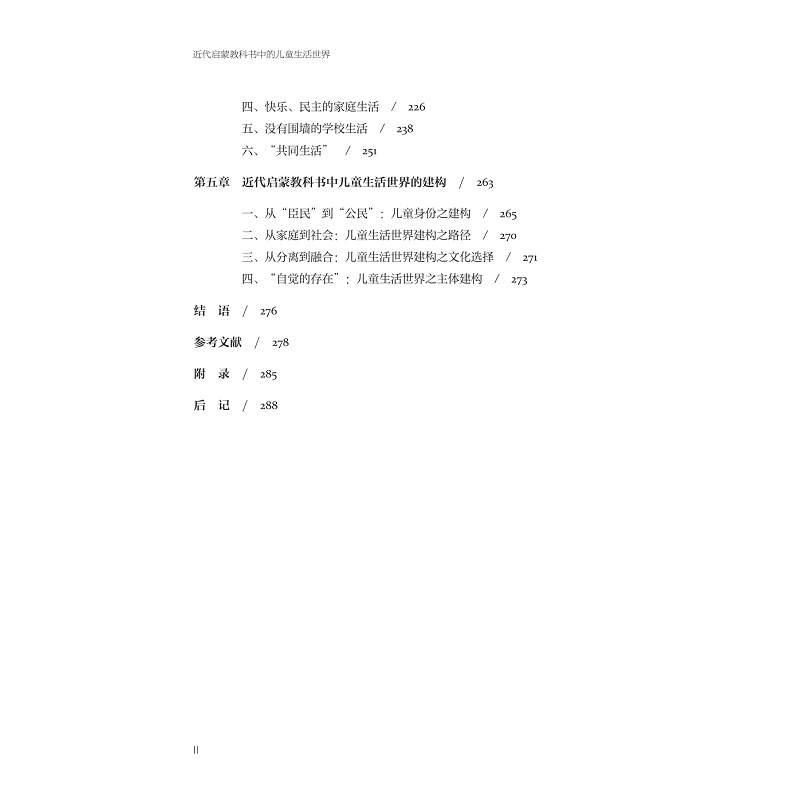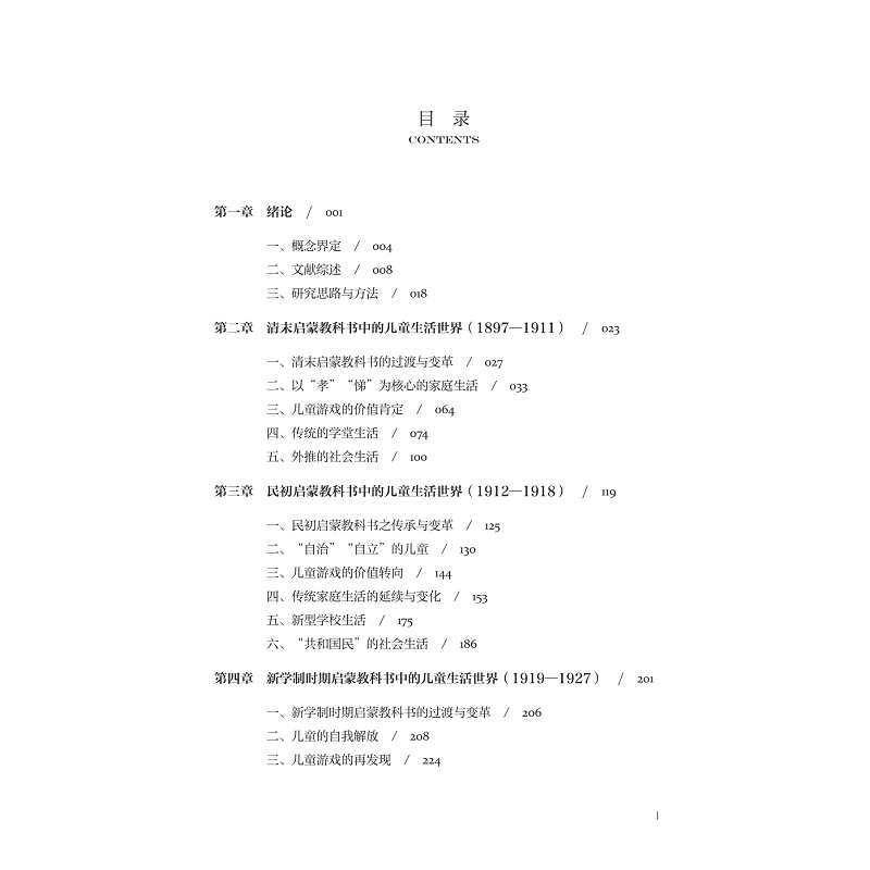 本书为作者的博士学位论文。20世纪前期是中国社会近代化转型的关键时期。受西方文化的强烈冲击,中国传统社会迅速瓦解,教育领域的变革也异常剧烈而频繁。从传统的私塾教育到近代学校教育,这中间凝结着知识界对东西文化的选择以及对民族国家、对儿童新生活的想象与建构。而在社会迅速变迁时期,这种选择与想象的方案往往多样且充满矛盾。作为知识和文化选择、控制的重要载体,启蒙教科书为这些选择和想象提供了充分表现的空间。本书借鉴微观史学、社会学研究范式,以历史发展为线索,运用历史研究、文本分析(包括内容分析和话语分析)和比较等方法,从多维视角对20世纪前期启蒙教科书中的儿童生活进行深入分析和解读。
