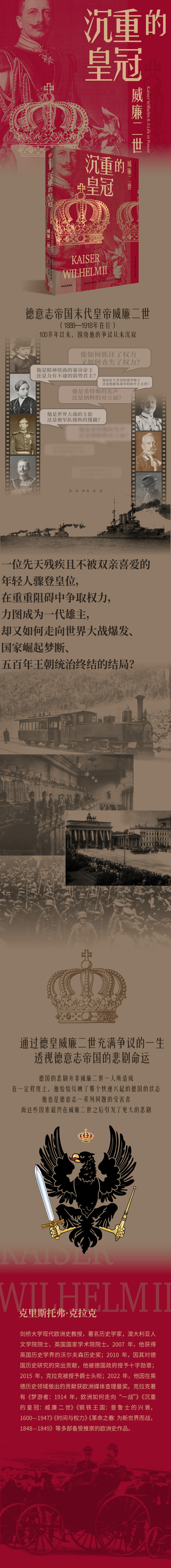 在克拉克看来,威廉二世是一位复杂而矛盾的人物:聪明有余,但判断力不足,行为反复无常;生性敏感而自负,常常因感到弱势和威胁而冲动行事。威廉二世的能力当然不能使他成为一位伟大君王,但他的这些特质,在一定程度上也反映了那个快速兴起的德国的状态。威廉二世也并未实现他理想中的大权独揽,他在位期间许多标志性的政策,其实并非由他所主导。本书并不打算为这位末代皇帝“辩解”,而是通过在具体情境中解读他的言行,在众声谴责和同情理解之间找回平衡,并展现在其统治时期德国复杂的内外环境和盘根错节的权力关系。