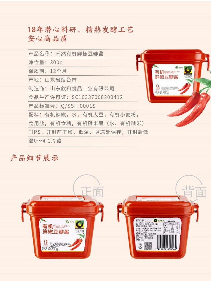 禾然有机鲜椒豆瓣酱 Organic fresh chili soybean paste 品牌:禾然 规格:300g 配料:有机辣椒、水、有机大豆、有机小麦粉、食用盐、有机食糖、有机糙米醋(水、有机糙米) 产地:山东省烟台市 生产方式:主料粮食有机种植,原料混合发酵制作。 储存方式:开封前干燥、低温、阴凉处保存,开封后低温0-4℃冷藏 保质期:12个月 生产日期:2023-05-26 发货方式:产地一件发货,中通快递,下单后1-2天发货。不参与广东省内满300包邮活动。受天气或库存等原因影响可能偶有耽误,急单请发货前咨询客服,不接受没有提前沟通的拒收。 |
