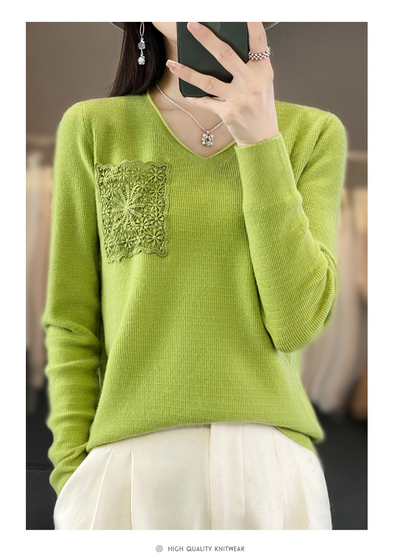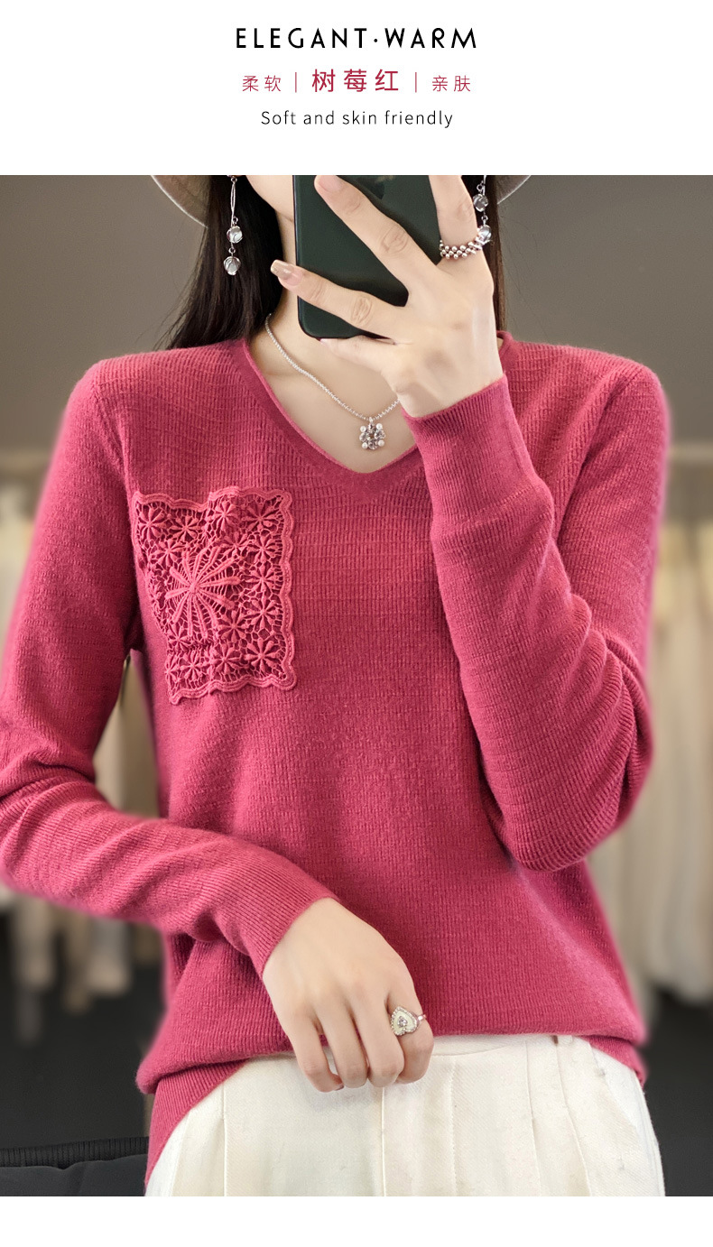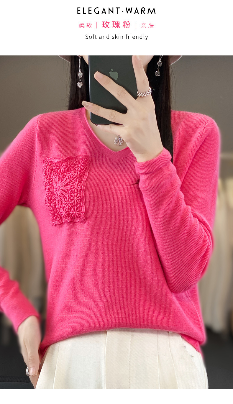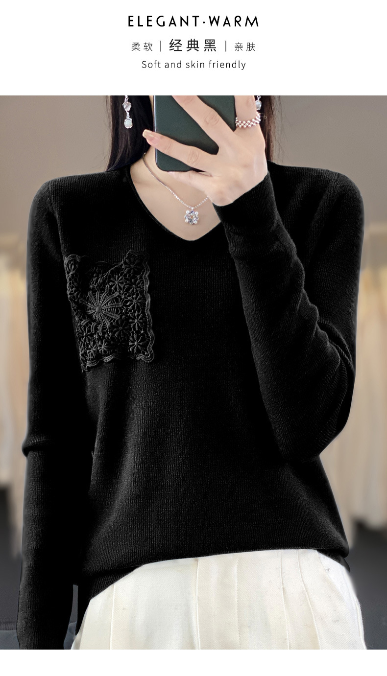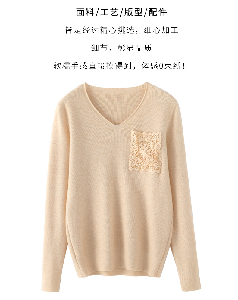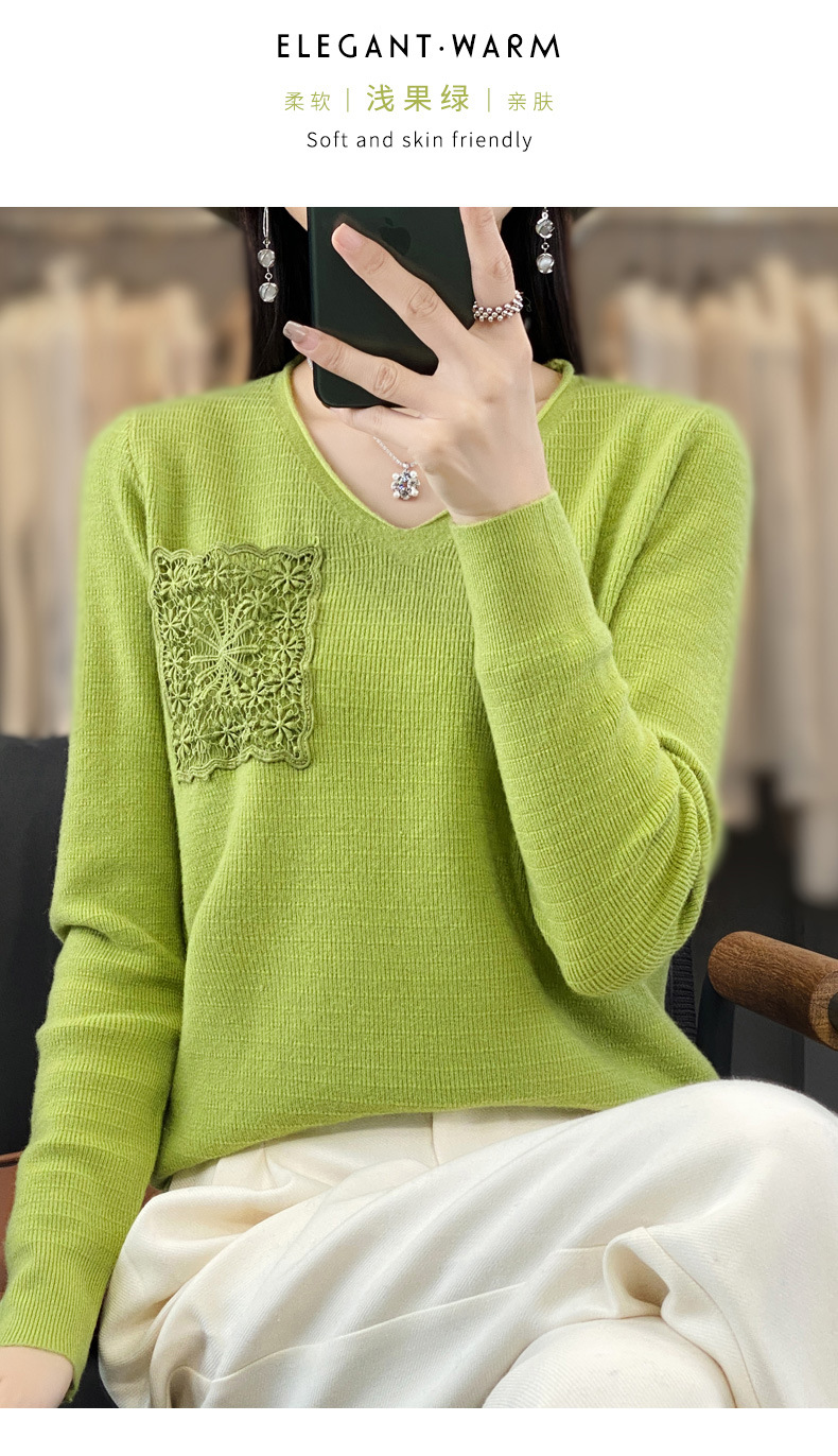 QHJY-JY917软糯毛衣V领针织打底衫女秋冬修身钩花口袋显瘦针织毛衫长袖上衣