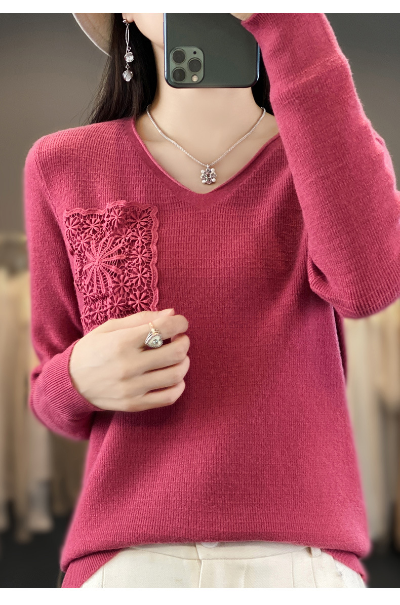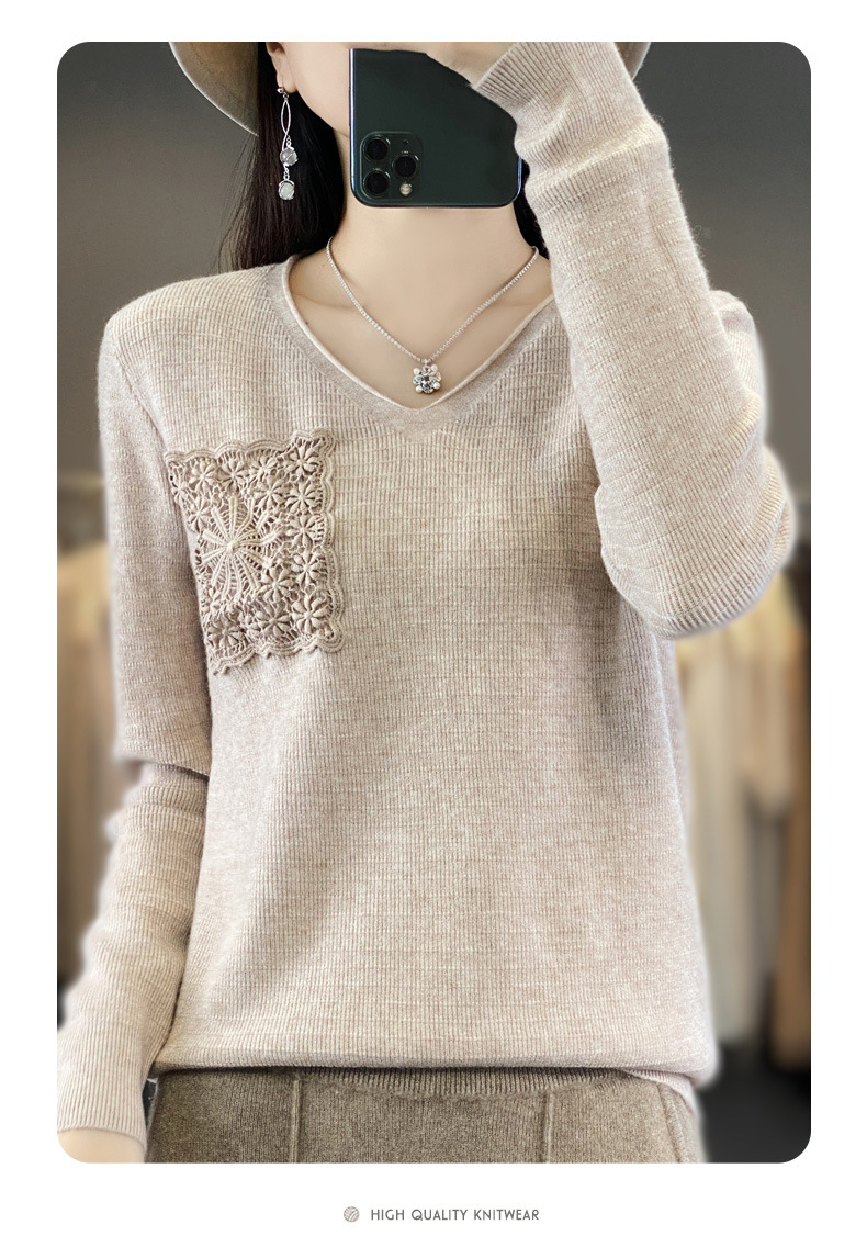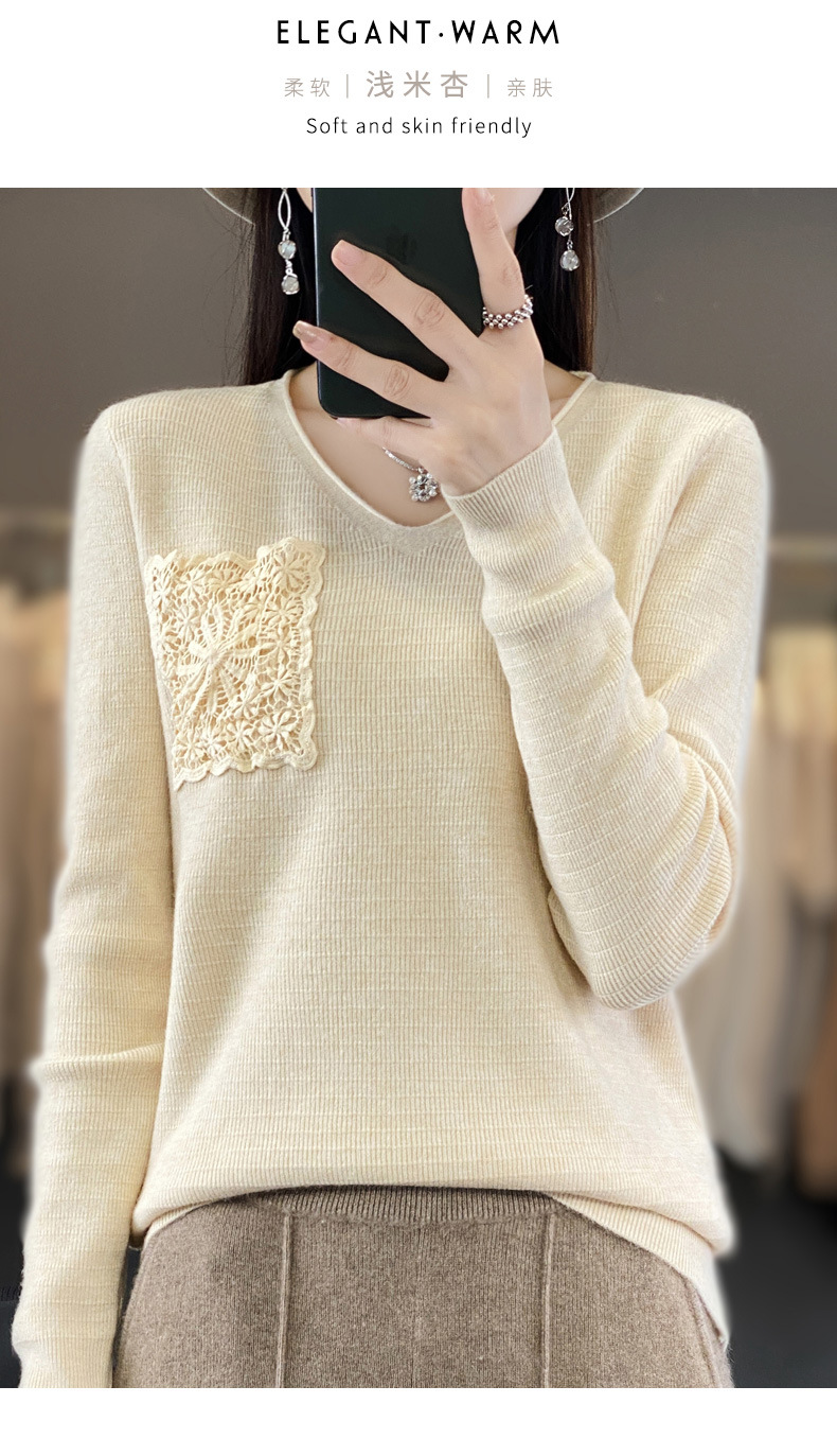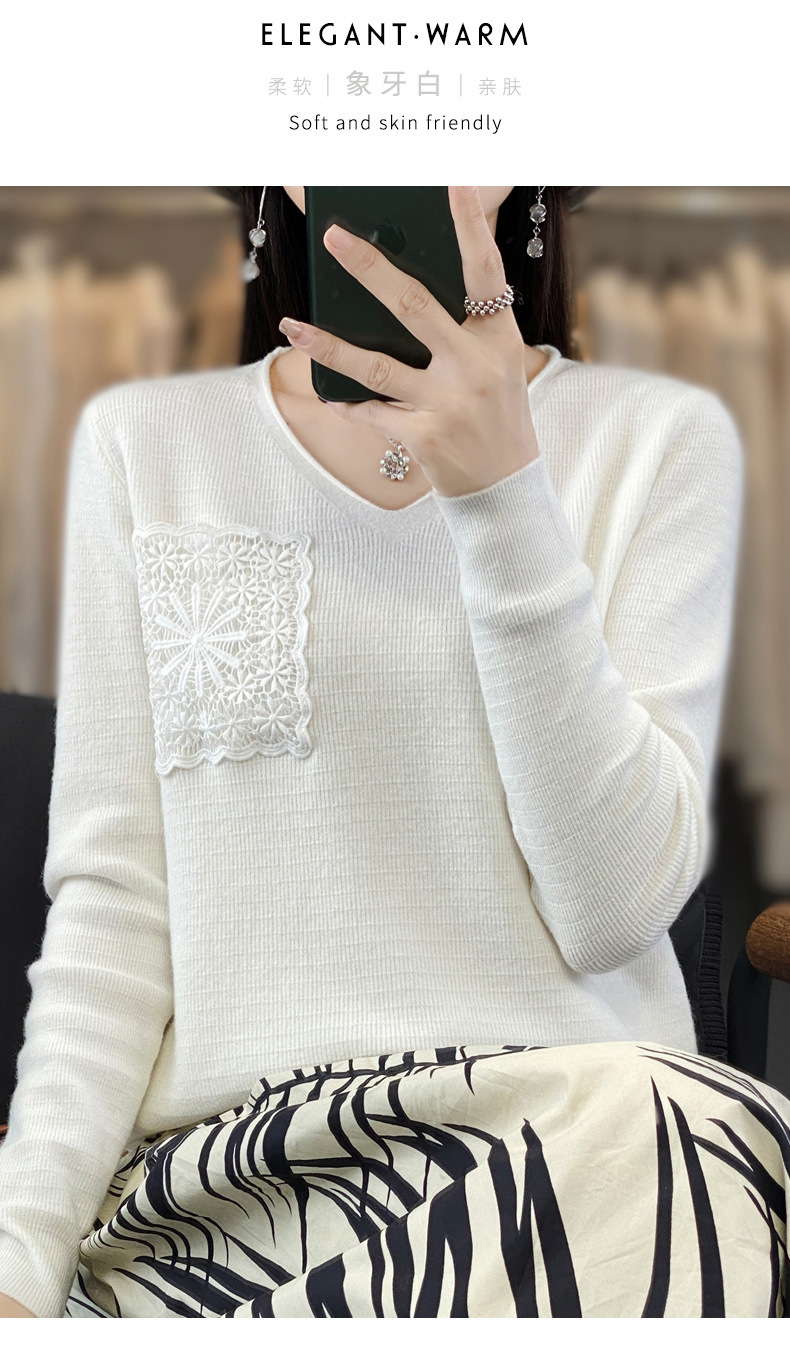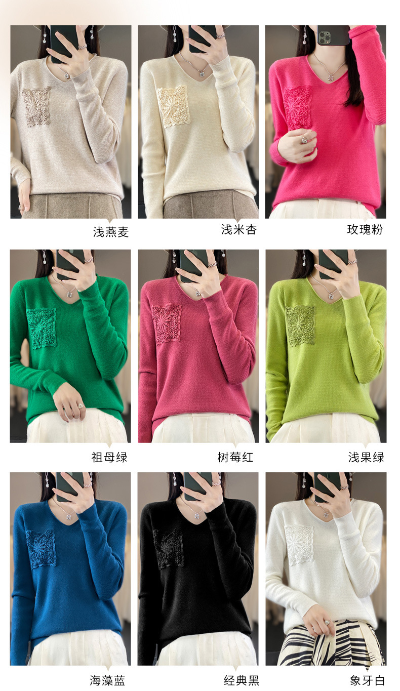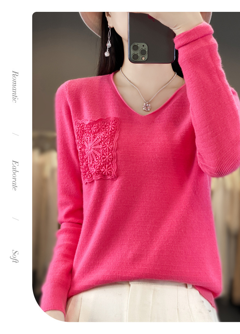 QHJY-JY917软糯毛衣V领针织打底衫女秋冬修身钩花口袋显瘦针织毛衫长袖上衣