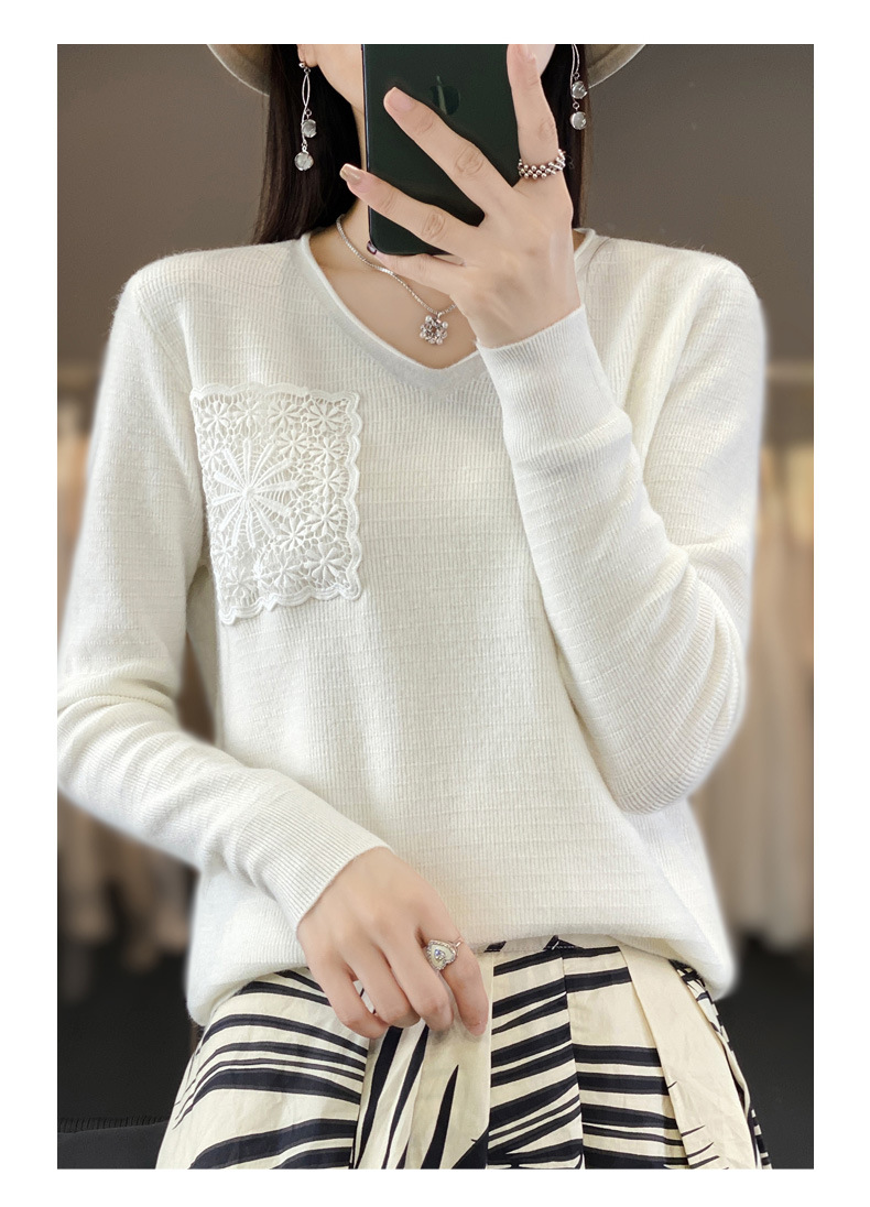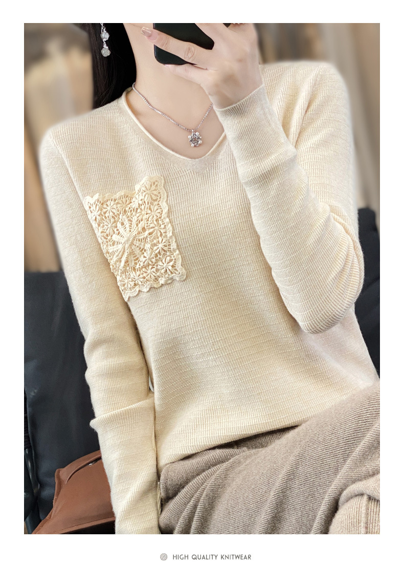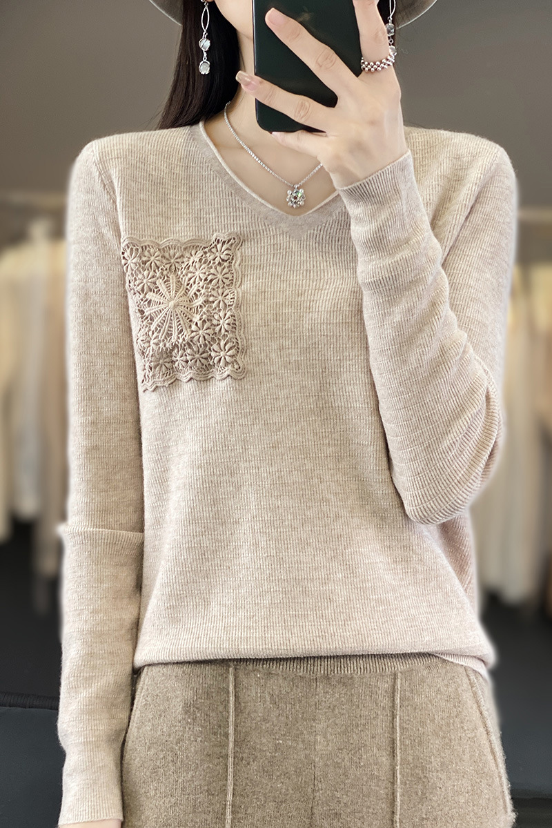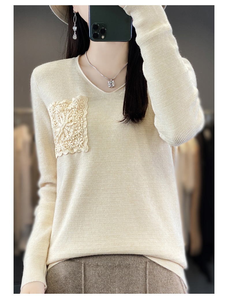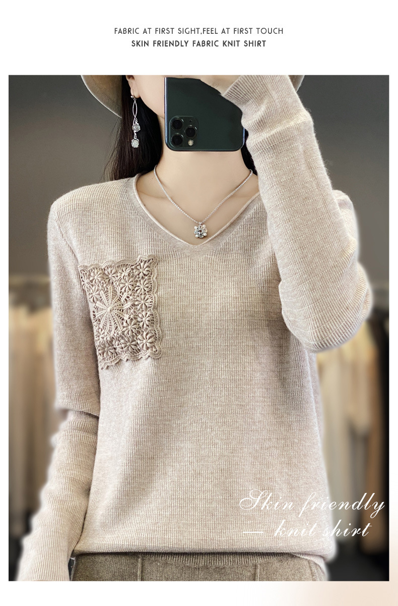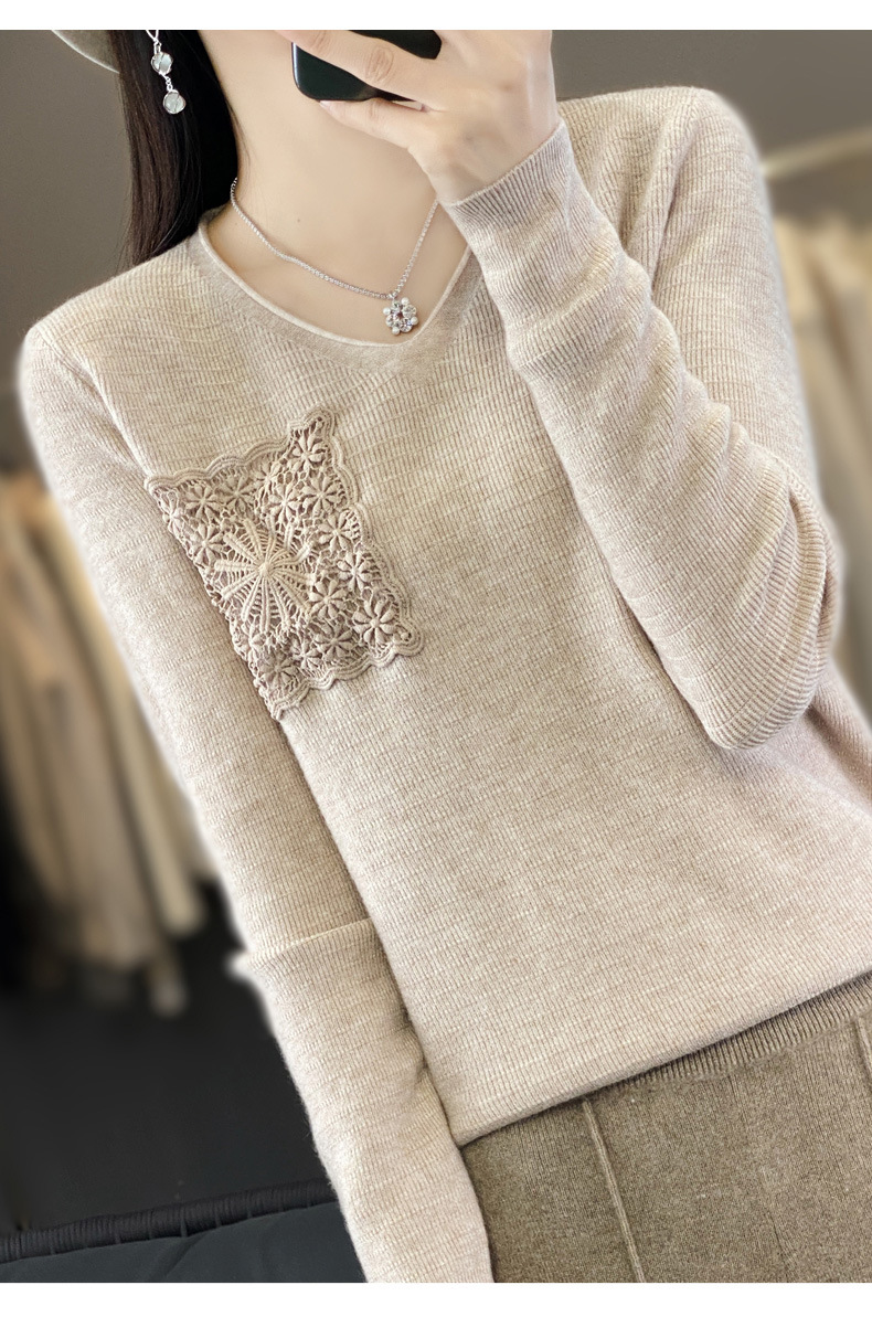 QHJY-JY917软糯毛衣V领针织打底衫女秋冬修身钩花口袋显瘦针织毛衫长袖上衣