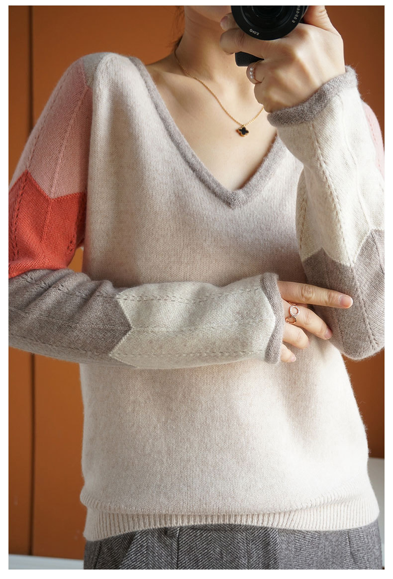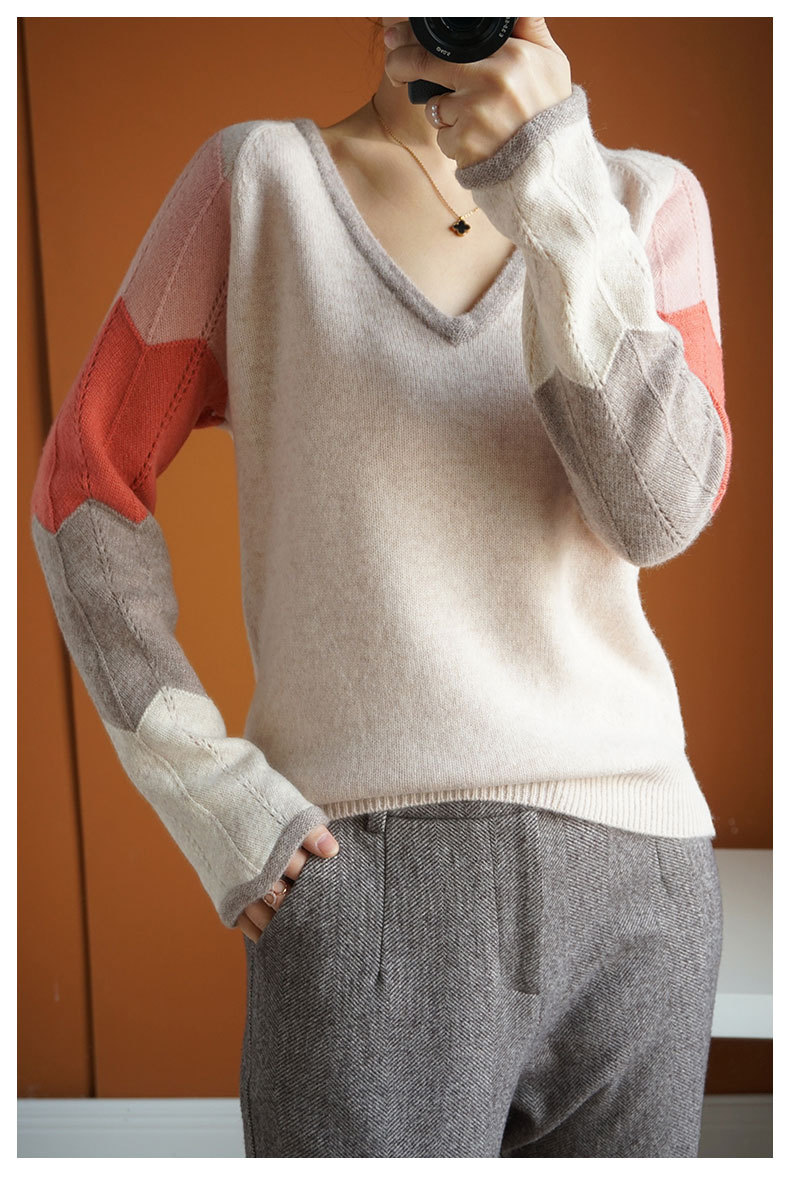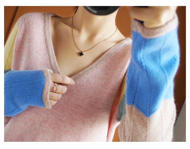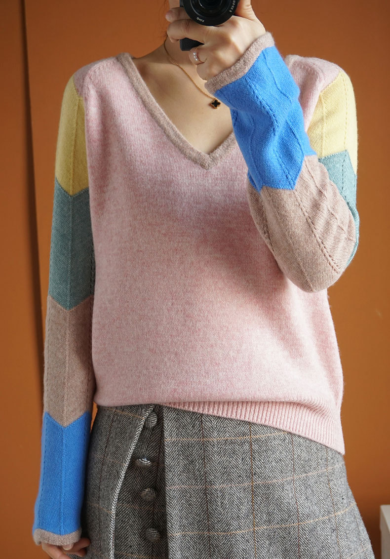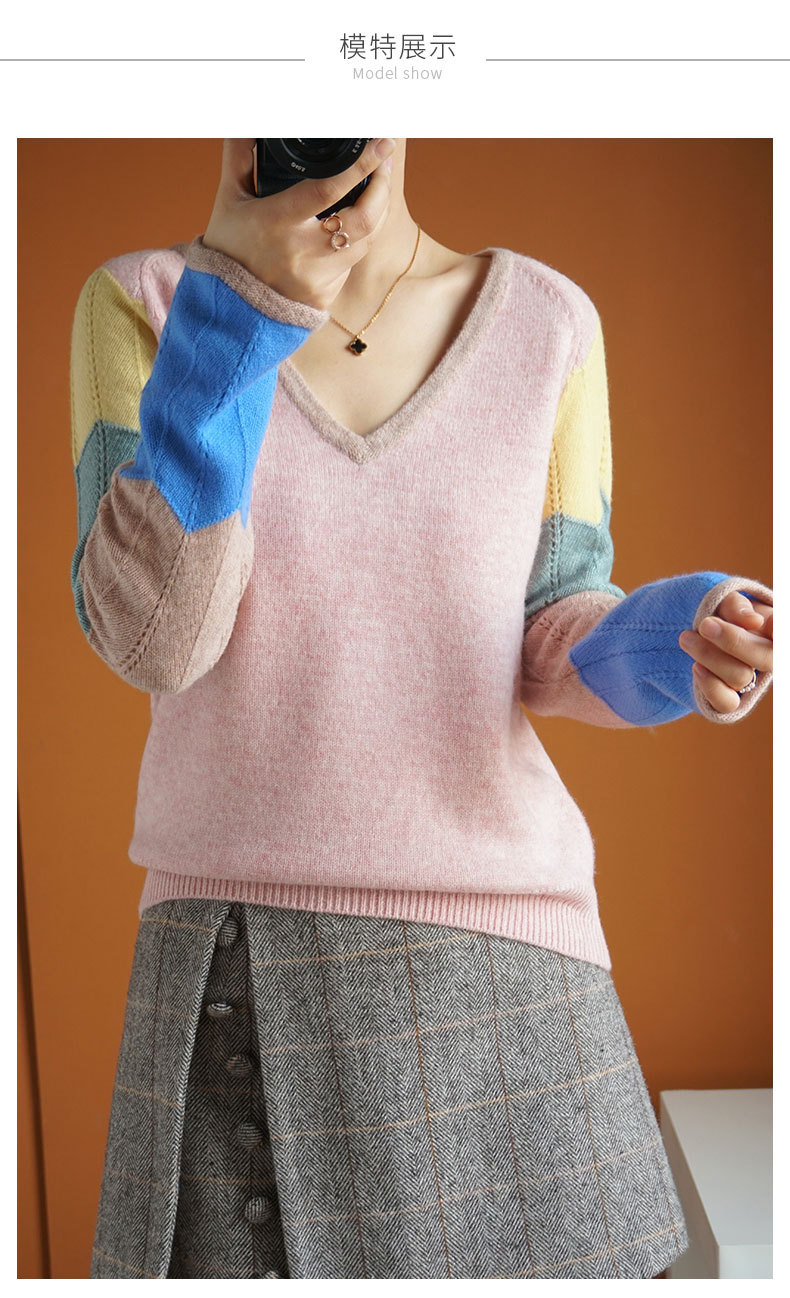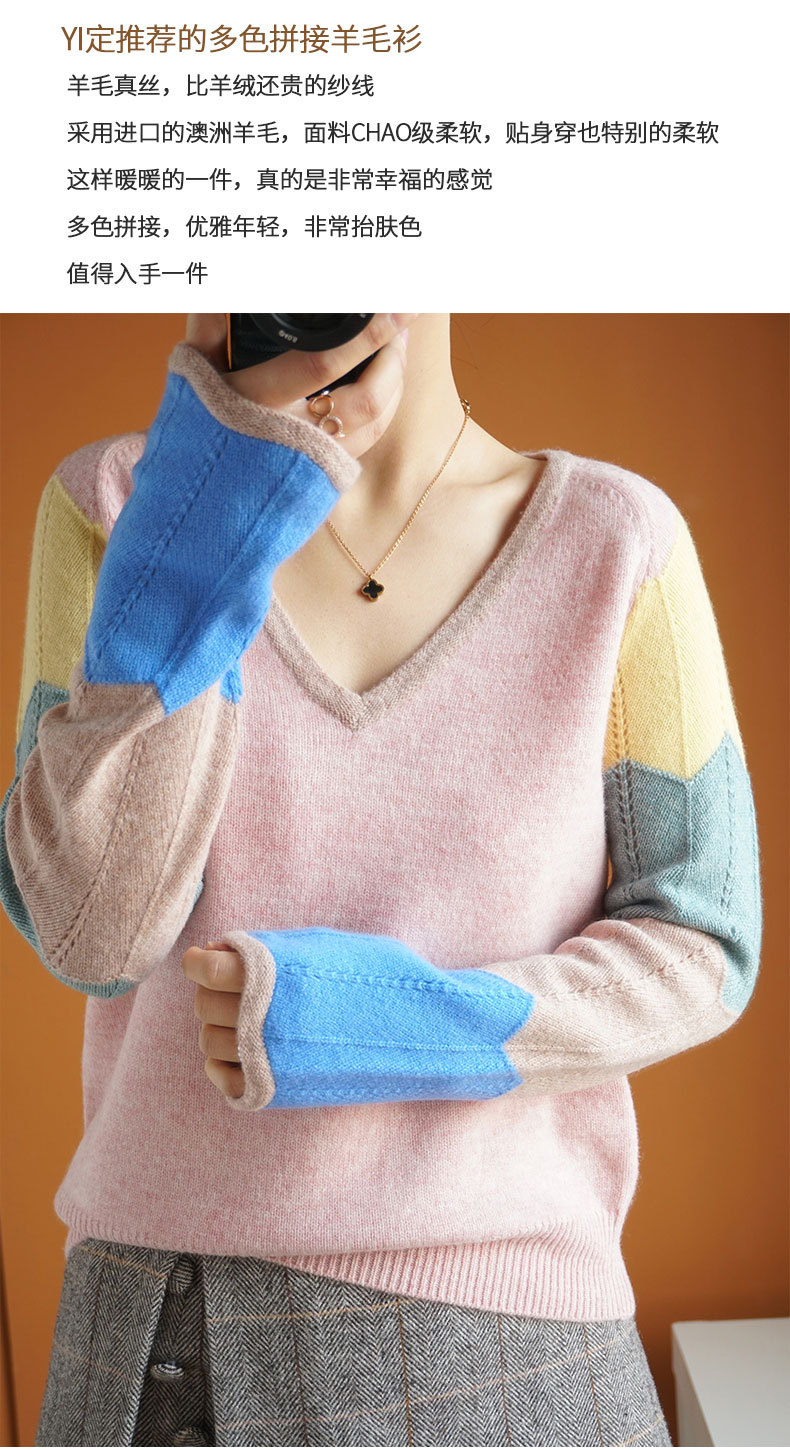 QHJY-JY807撞色羊毛衫女V领 23秋冬新款女装V领套头拼接彩色保暖针织毛衣女